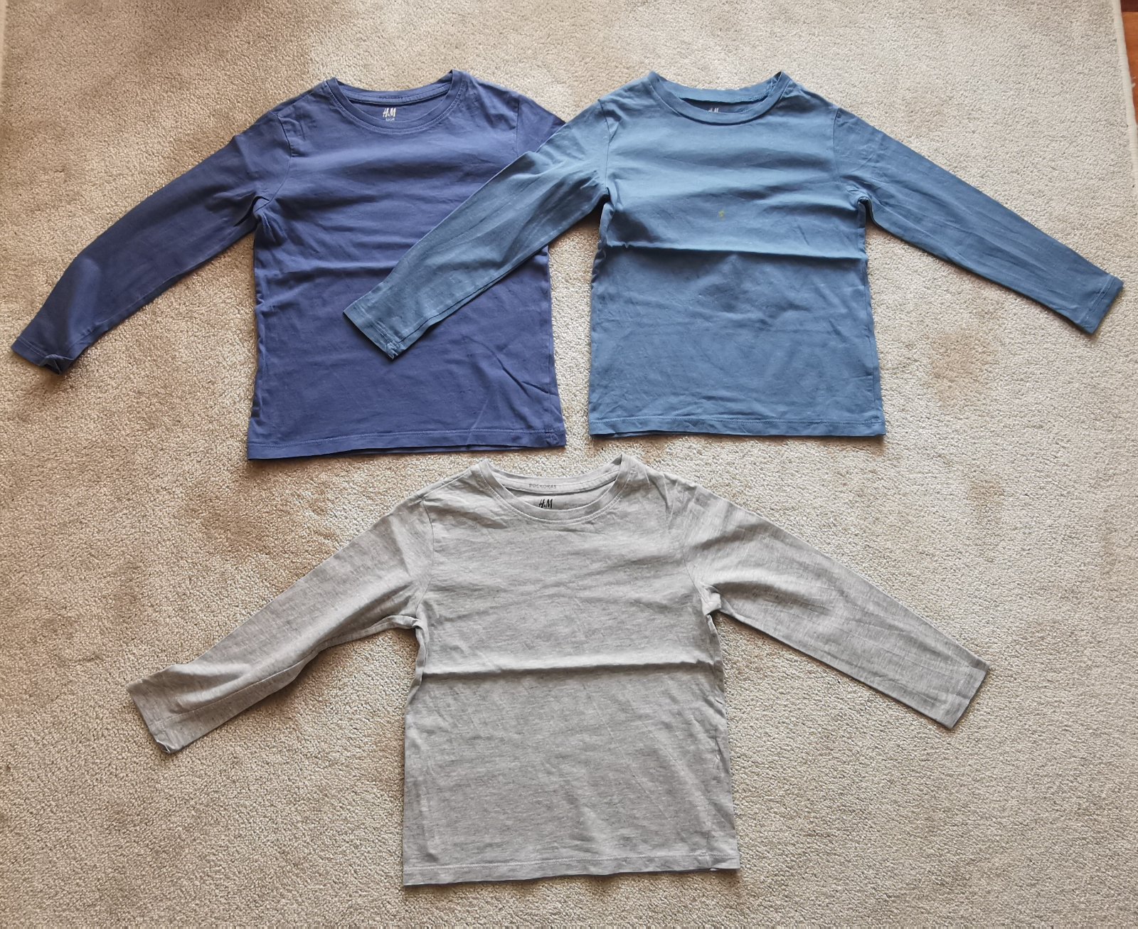 Niektoré sú nosené viac a niektoré menej. Tmavé už nemajú žiarivú farbu. Modré má trochu fľaky od farby., zelené má dierky a fľak. Veľkosť 110/116.