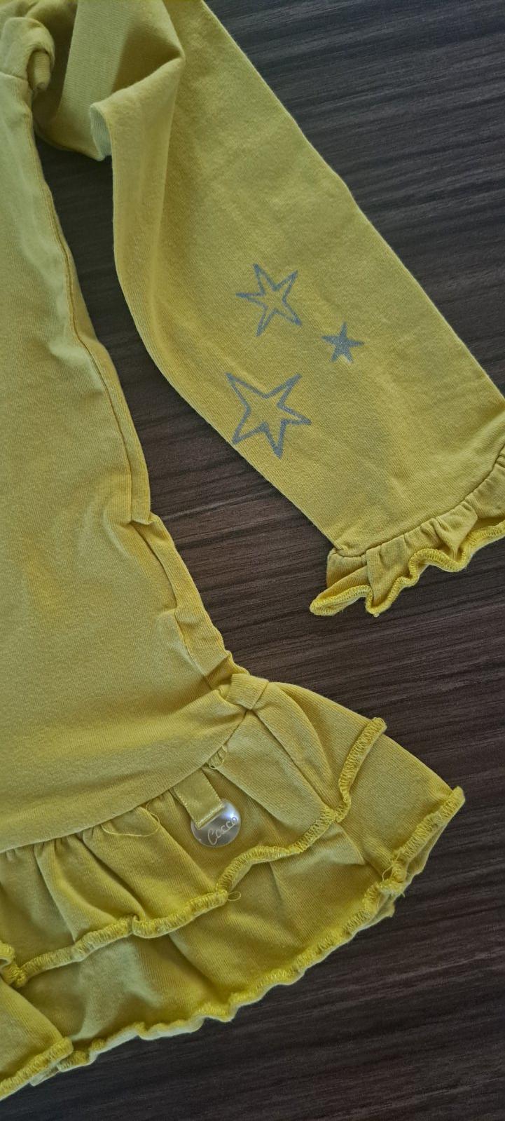 Ponukam na predaj pekne nosene tricka dopodopo, mam dve rovnake, velkost 104. Farba sa mi na fotke nepodarila zachytit. Su pekne zlte. Na jednom tricku je na rukave, vid. detailne foto, dierka. Ina...