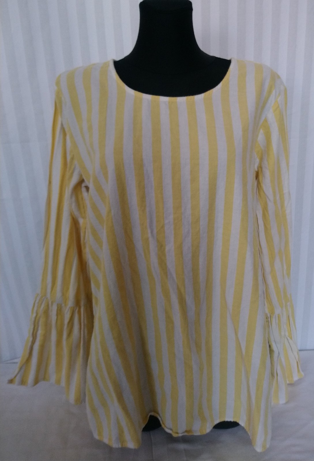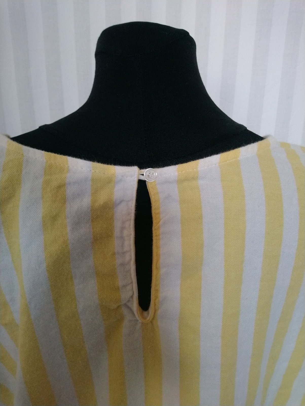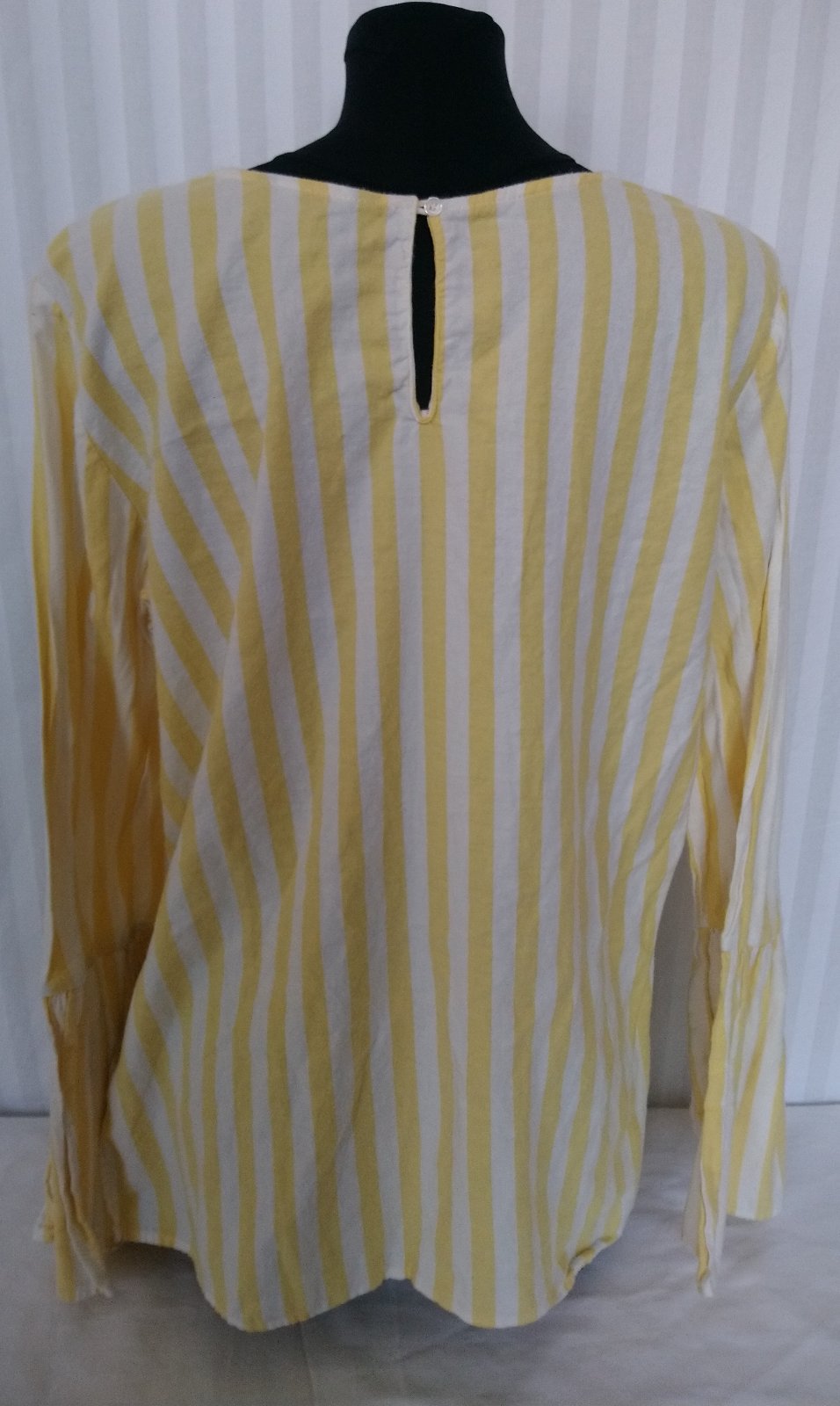 dámsky pásikavý sýto žlto biely blúzový top, vzadu zapínanie na gombík,