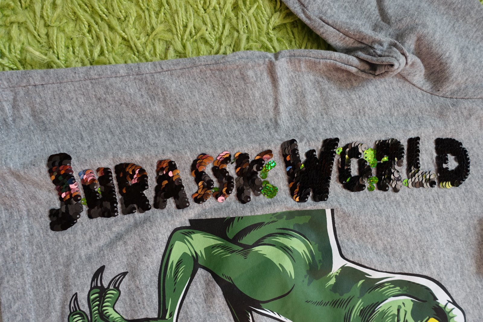 Predám krásne bavlnené tričenko s pretáčajúcimi flitrami Jurský park s dinosaurom. Flitre majú farbu čiernu a trblietavú zelenú. Celý obrázok aj flitre sú z opačnej strany podšité, tričenko neožiera. Oblečené bolo 1x, je top stav. Nemá žiadne fľaky, žmolky, ani iné poškodenie. Celková dĺžka je 40 cm. (V10)
