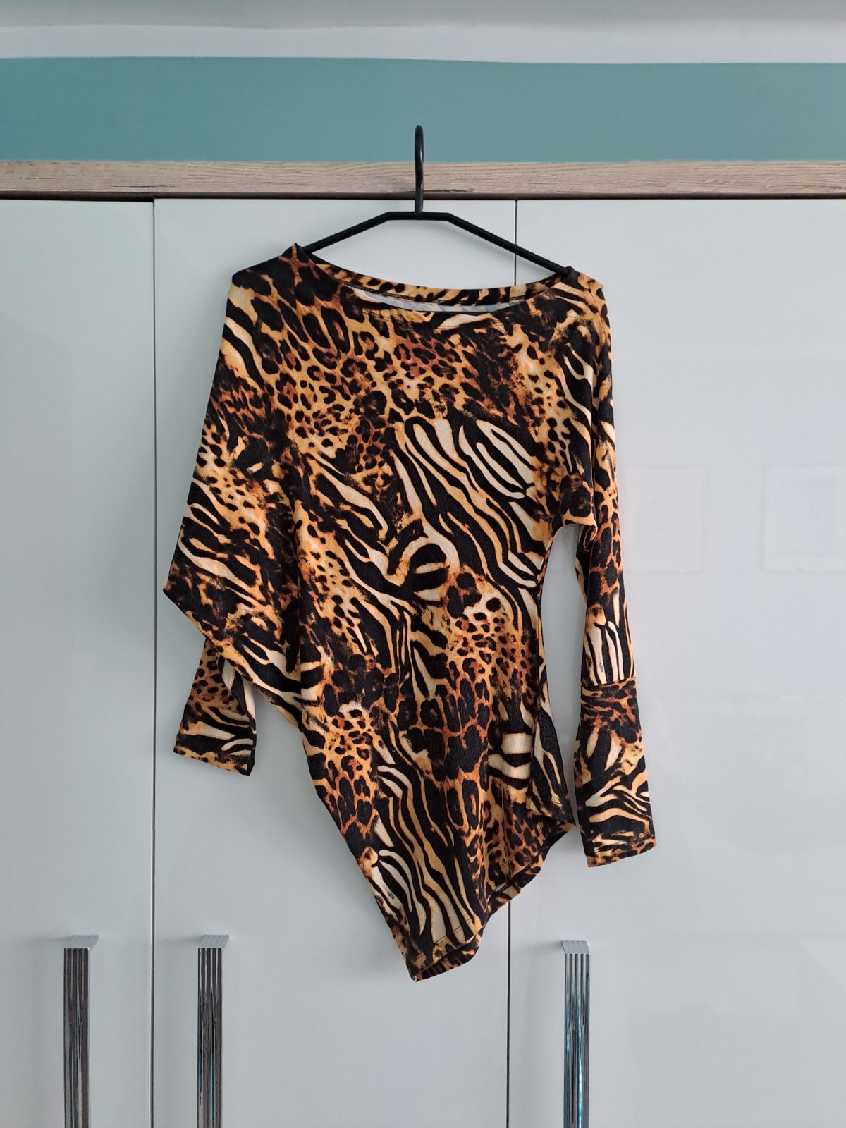 Nádherné tričko s dlhým rukávom a s odhaleným ramenom. Elastické. Veľkosť UNI. Farby sú nádherne ostré: oranžovo - hnedé. Krásne sedí na postave, kvalitný príjemný materiál, elastické. 100% stav. Vzadu tiež ten motív.