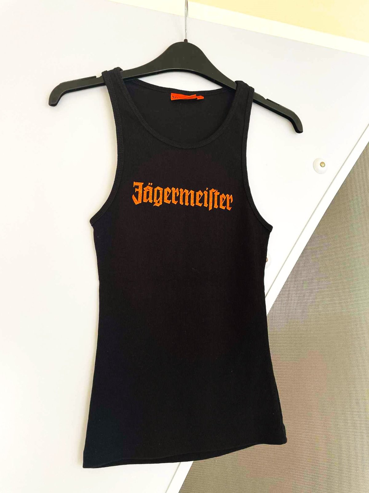 bavlnené tielko,iba preprané po skladovaní,nápis je pestrý oranžový lurexový s jemnými trblietkami