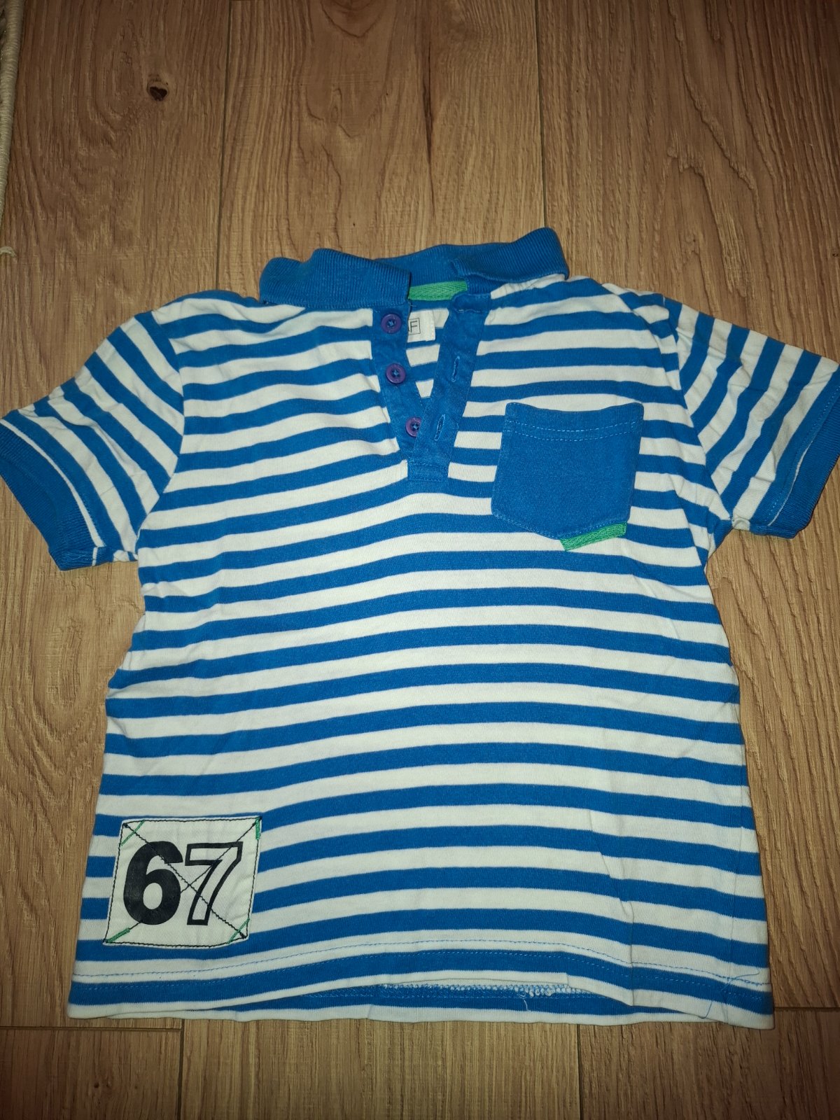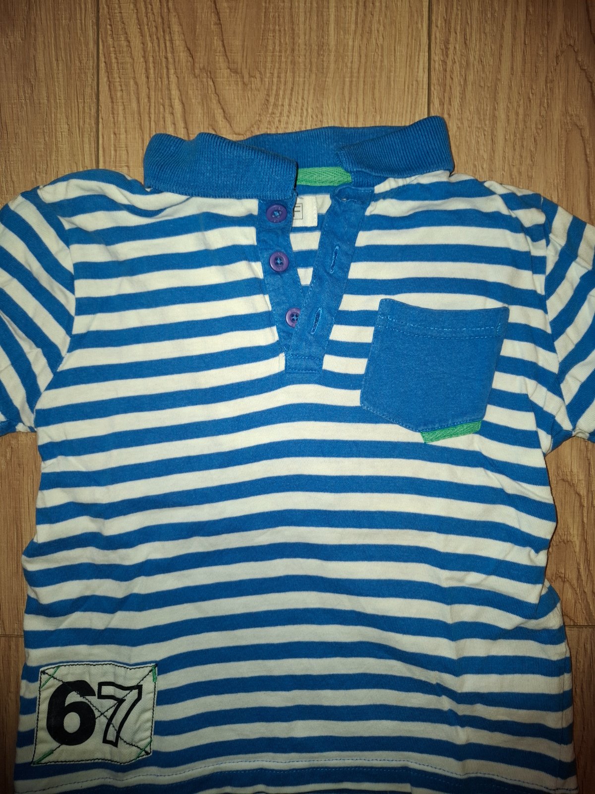 Pekne vyrazne modré tiecko, na foto take fadne,zosvetluje mi. Velkost odhadom možno aj 110, popod pazuchy 31cm a dlzka od pleca dolu 39 cm. Dino sa uz na spodku trochu puka,ale celkovo pekný dojem ...