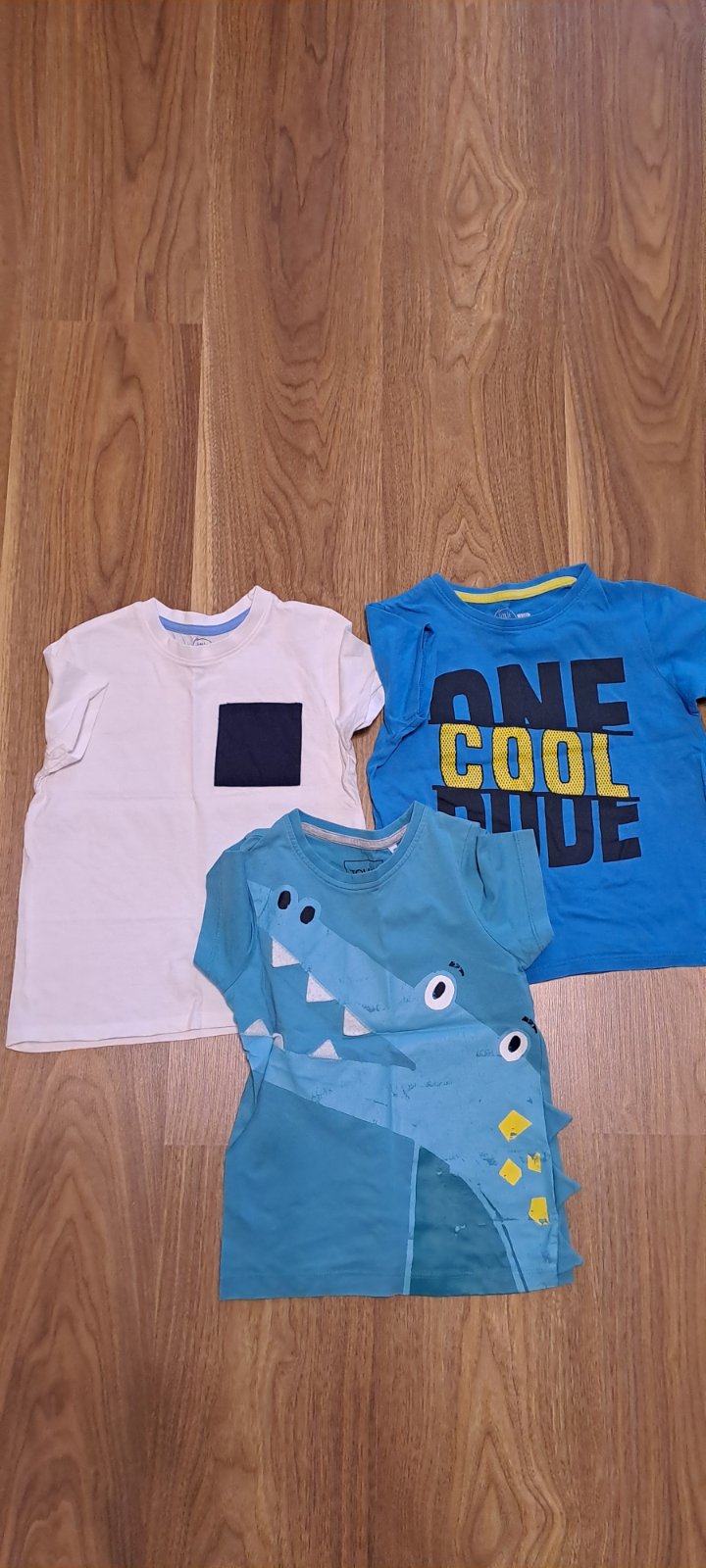 Ponúkam na predaj rôzne tričká veľkosti 110-116 (5-6 rokov): 3 ks tričiek – biele, modré s nápisom, zn. Pepco, zelené s potlačou KROKODÍLA, zn. Palomino, bez poškodení. Cena 3€/3 ks.
