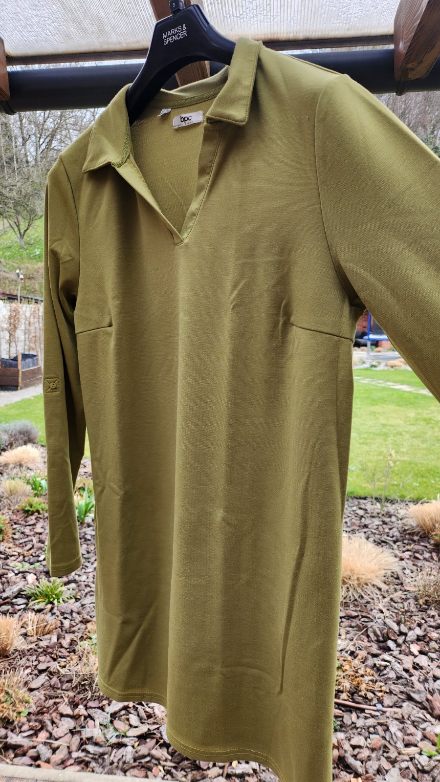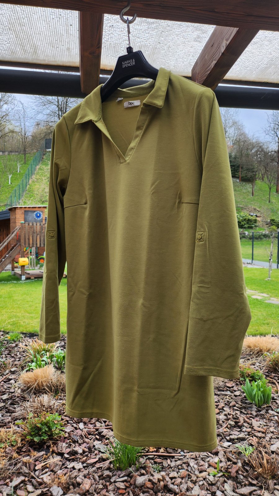 Trávovo zelená tunika s dlhým rukávom, ktoré sa dajú gombíkami prepnúť na 3/4. Kvalitná látka (72% polyester, 24% viskóza, 4% elastan). Mierne rozšírený strih, dole ukončenie na menšie 10 cm rozparky.
