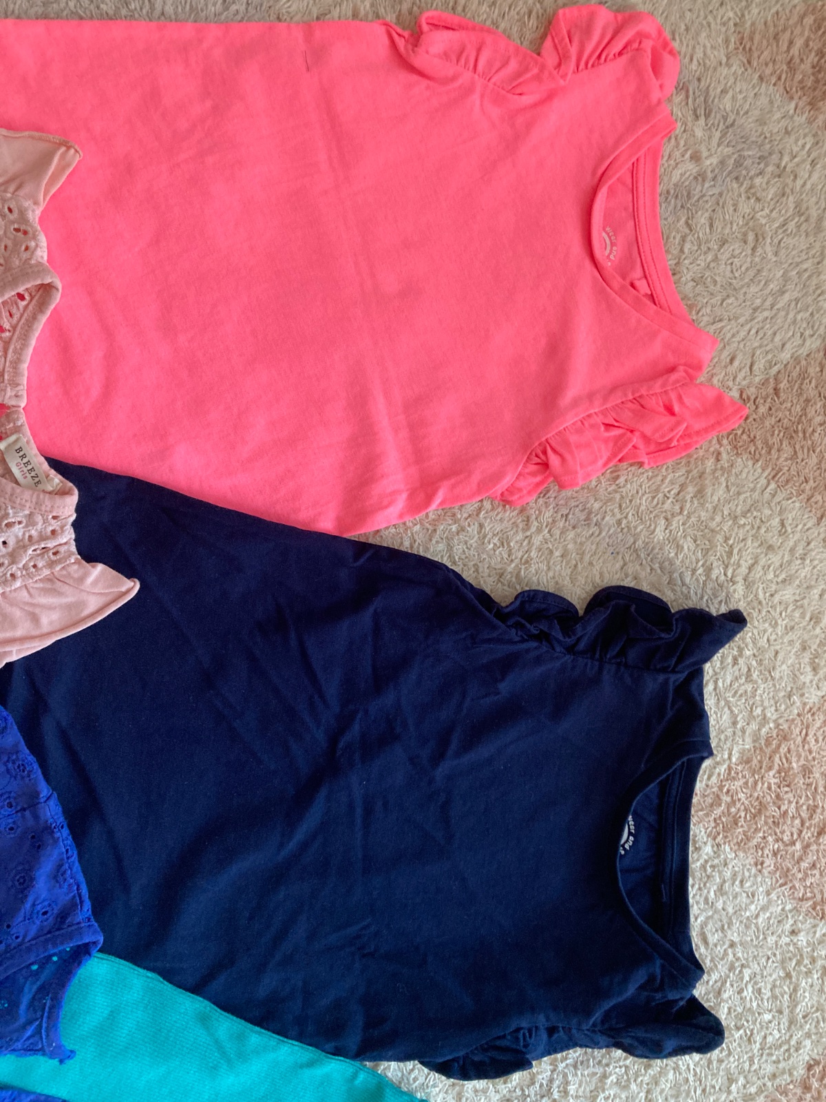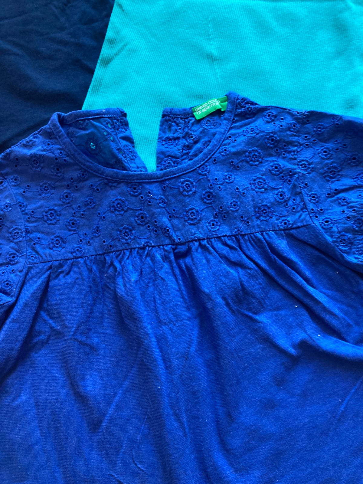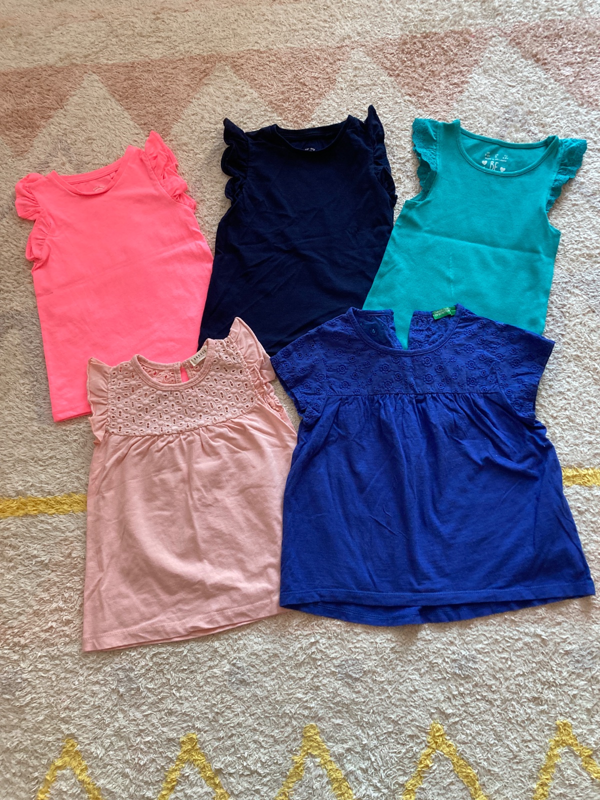 Ponukam na predaj letne tricka 5ks. Iba všetky spolu. Nosene jedným dietatom v top stave. Velkost na visacke 110, sedí. Horný rad tmavo modré a neonovo ružové s volanmi na pleciach sú FaF. Tyrkysové z rebrovanej bavlny je uvedená väčšia velkost na visacke, no veľkostnej zodpoveda ostatmym. Dolný rad -Marhulove s madeirou neznáma značka, dostali sme do daru. Tmavo modré s madeirou United Colors of Beneton.