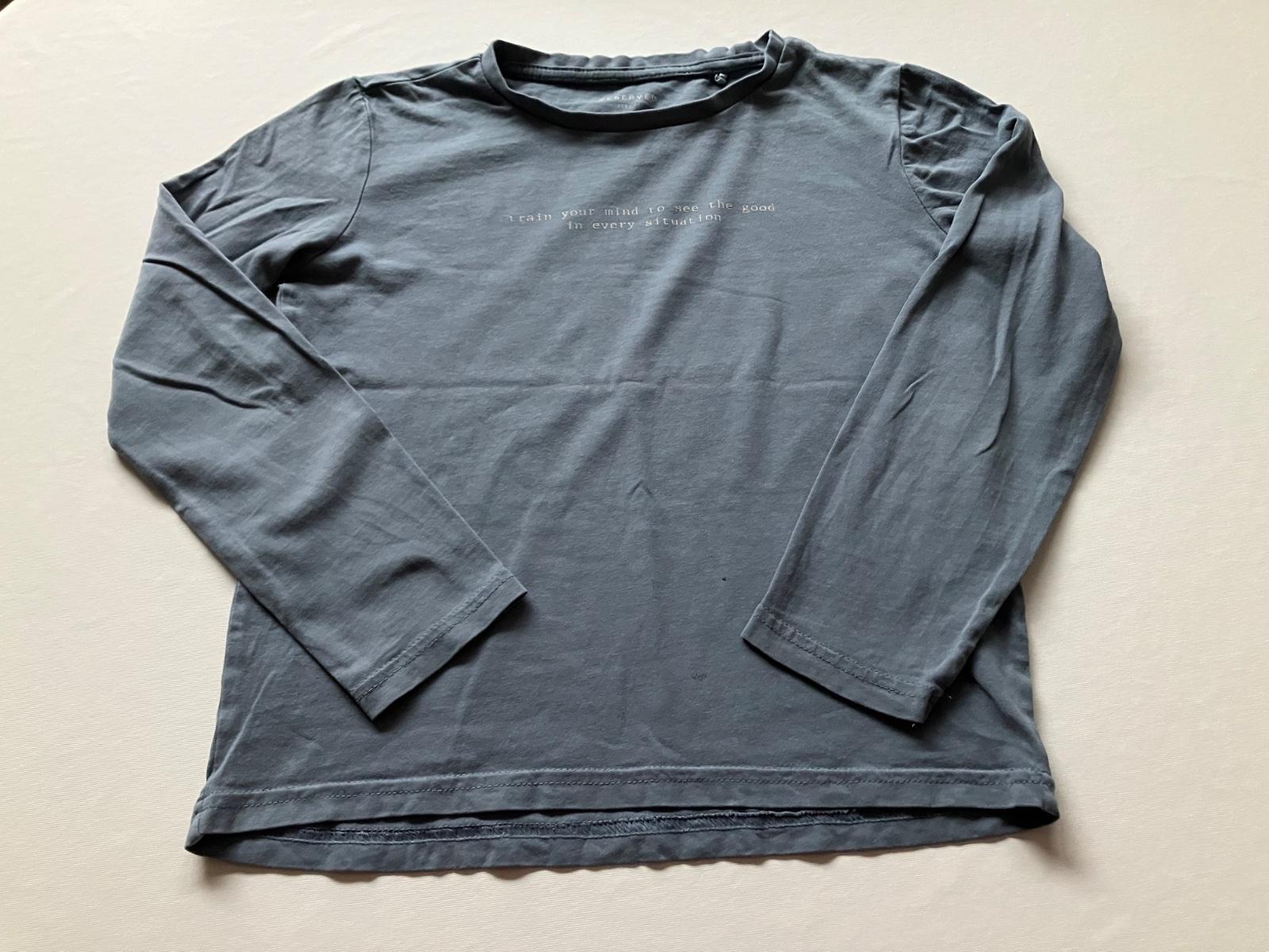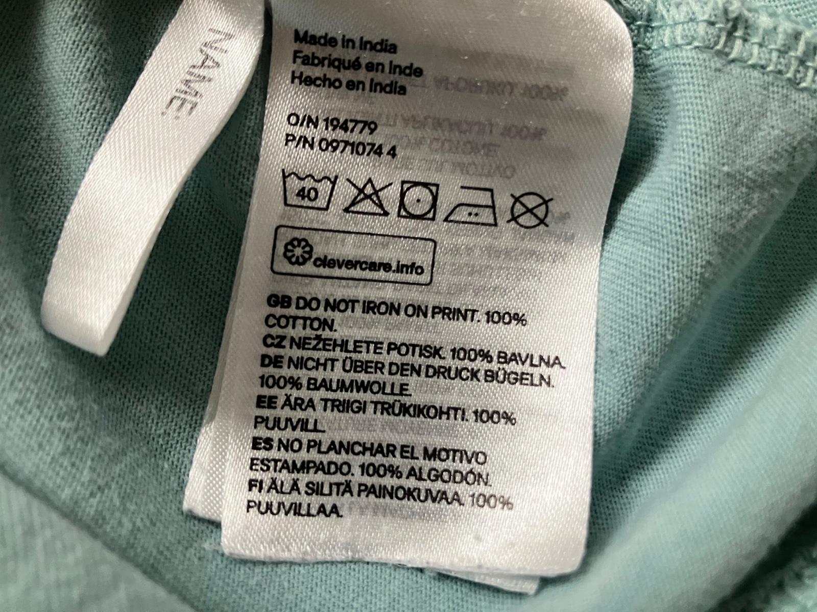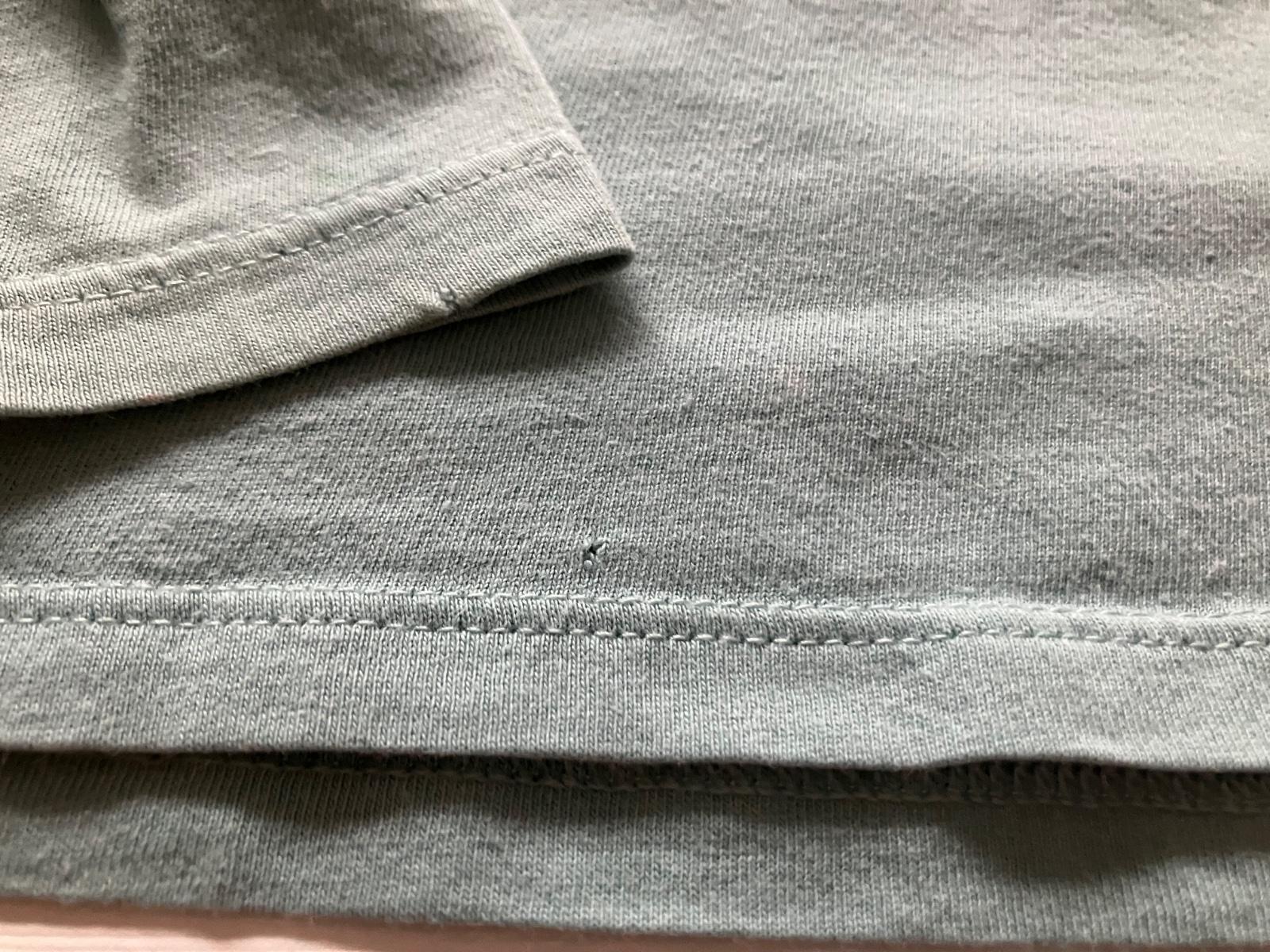 Tričko H&M je takej zelenosivej farby, má fliačiky od fixky a dierku na rukáve a pri spodnom leme / foto.