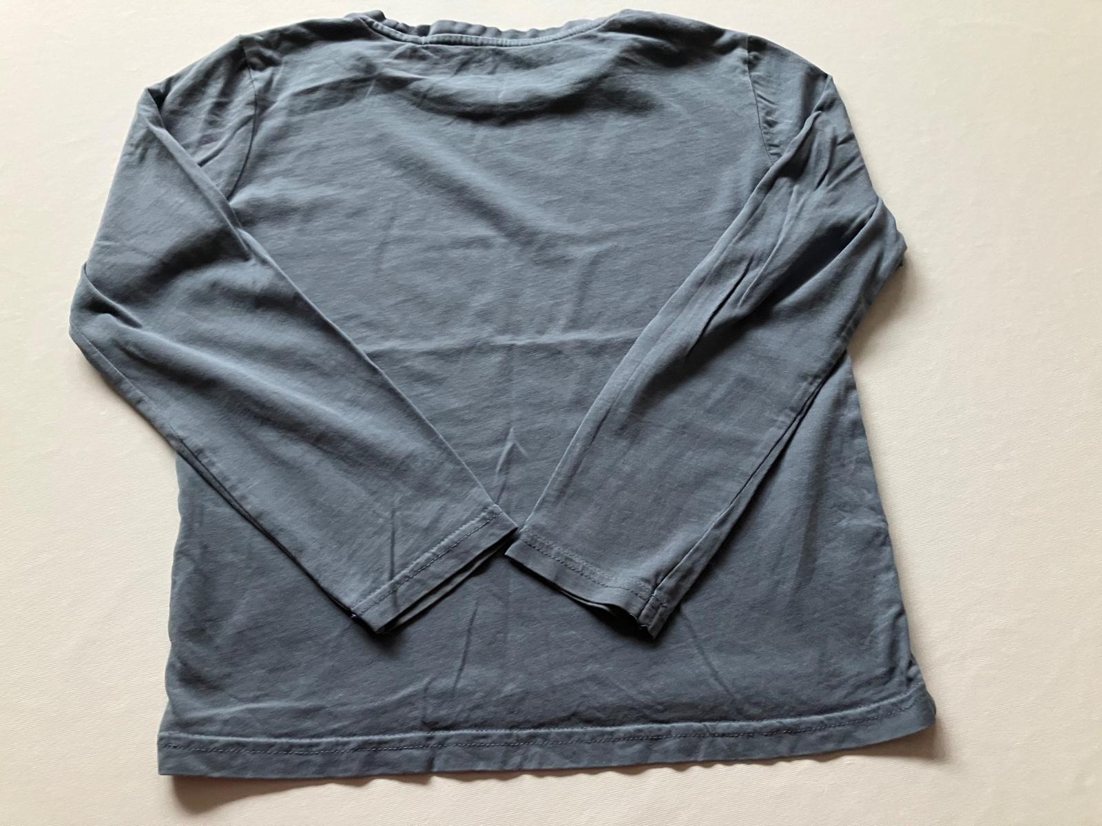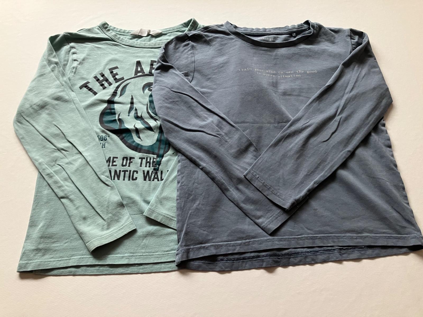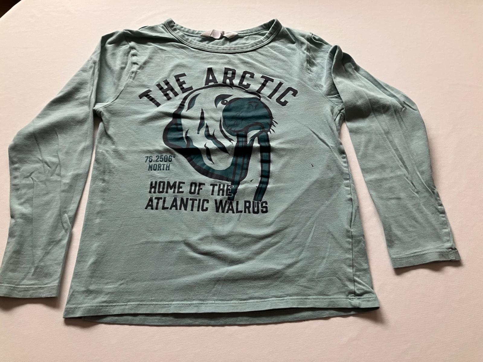 Tričko H&M je takej zelenosivej farby, má fliačiky od fixky a dierku na rukáve a pri spodnom leme / foto.