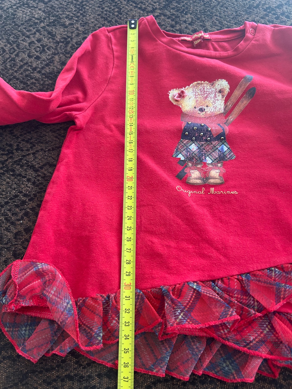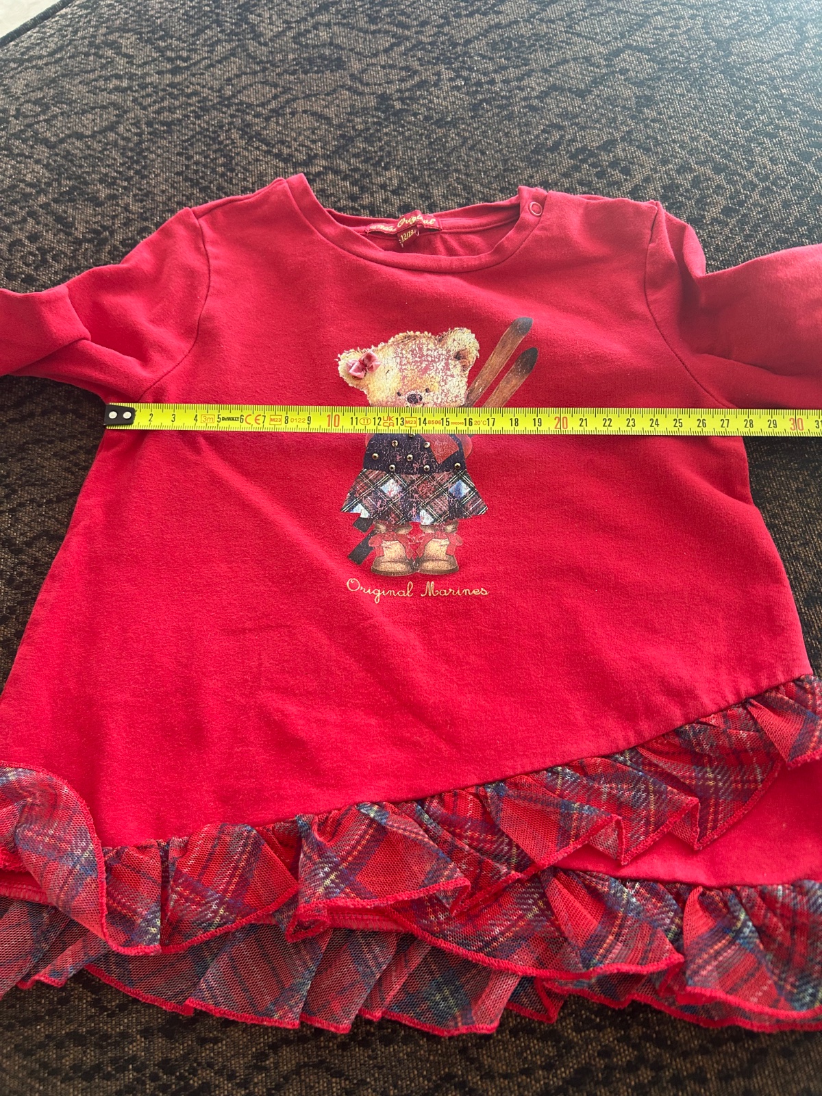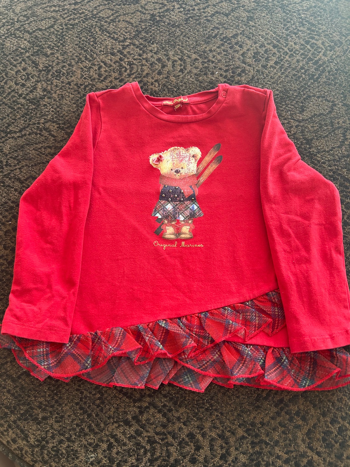 Nadherne tricko bez chyby, bezne nosene. Nosili sme uplne pohodlne v zime ked mala mala 2 roky a 2 mesiace a to neni utla a mala, cize rozhodne nie iba do 18tich mesiacov ako na visacke. Da sa pouzit aj ako vianocne. Vynikajuce.