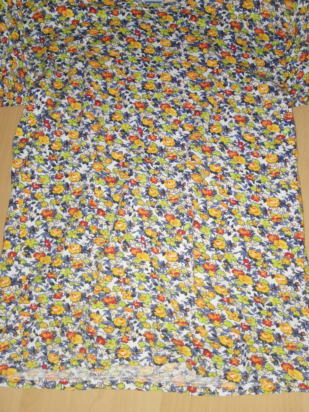 269p. kvetinkove klasicke damske tricko, velk. L, 100% bavlna, klasicky strih, nosene na striedacku, dlzka 65cm, rukav 23cm, cez prsia 50x2cm, cez brucho 49x2cm, rukav od krku 38cm, sirka dolu 51x2cm