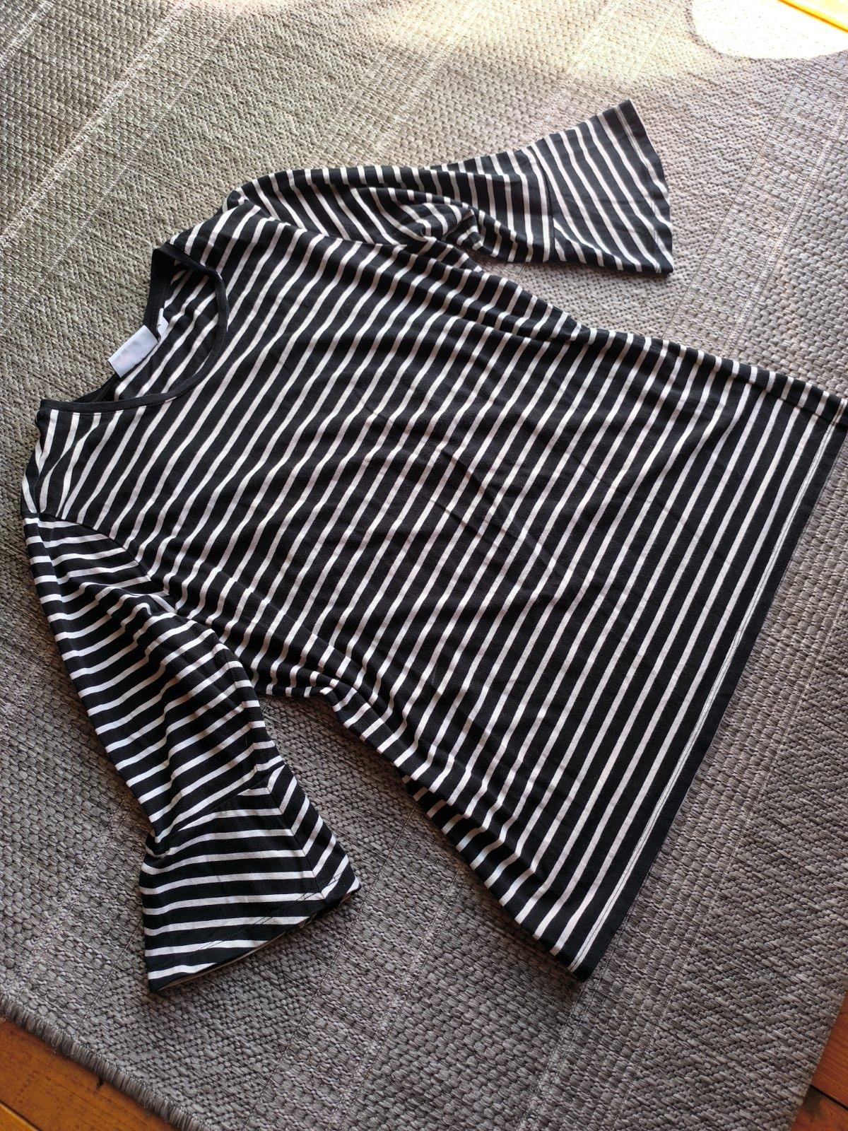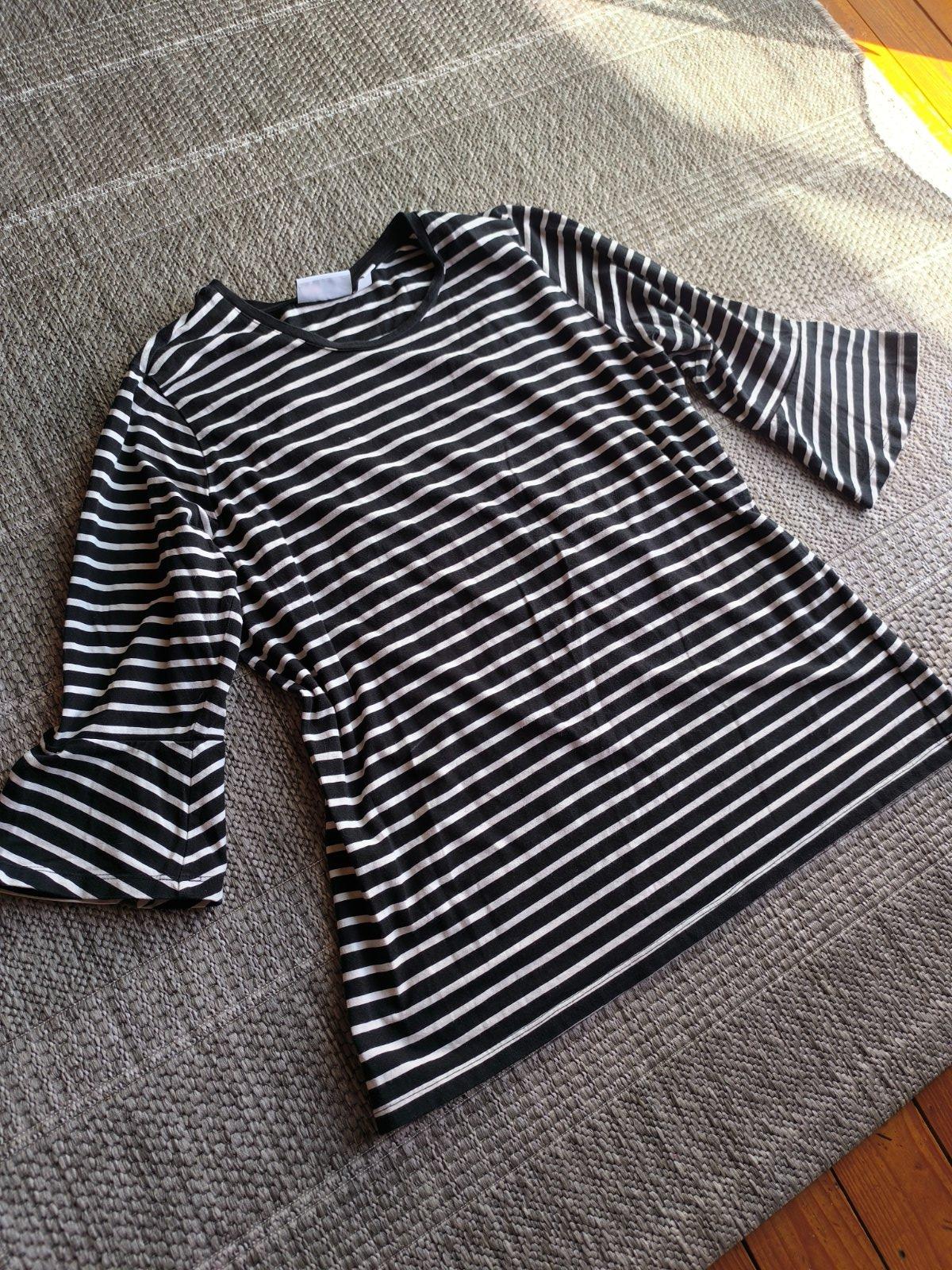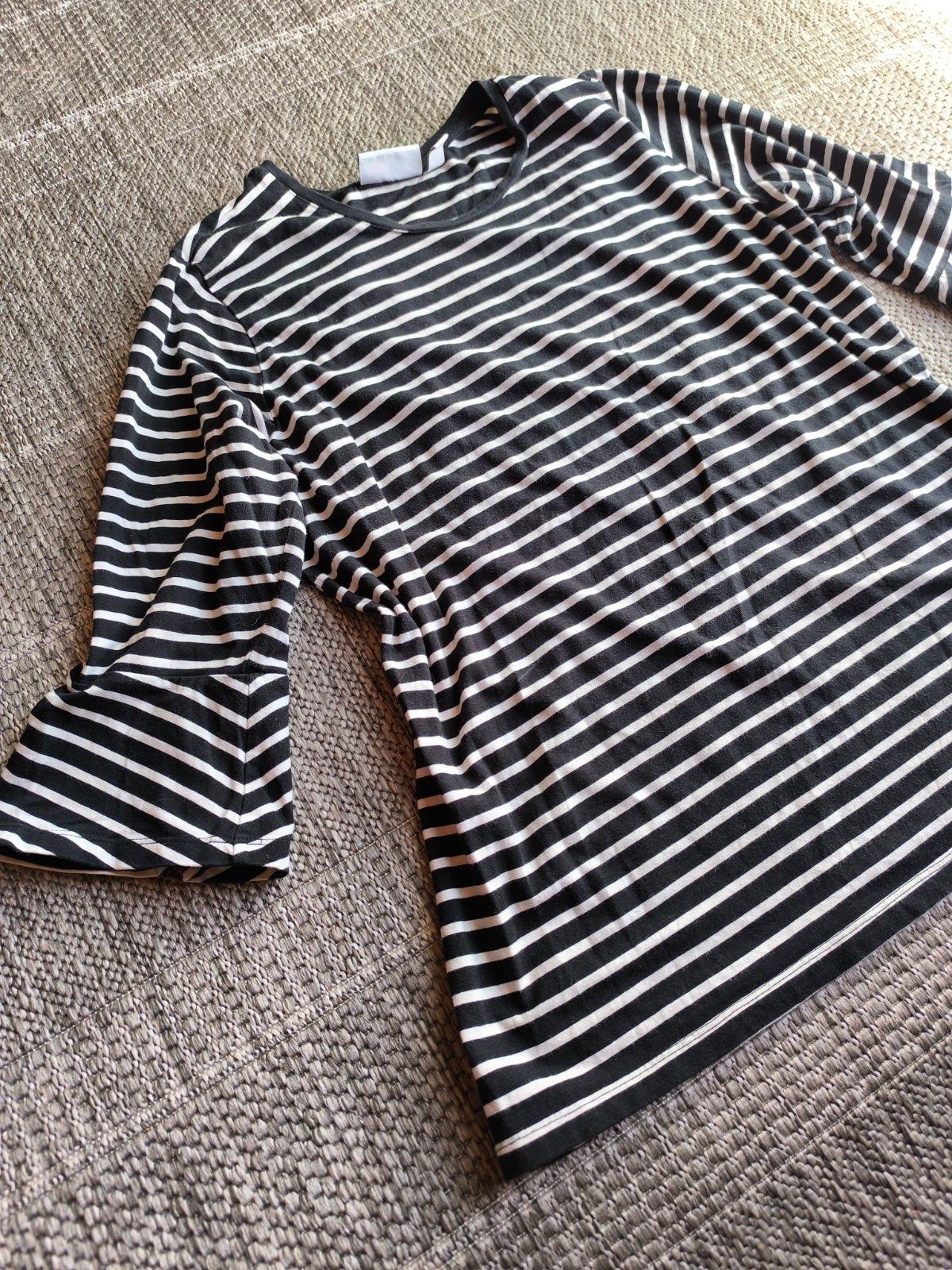 Čiernobiele pásikavé tričko, top s rozšírenými zvonovými 3/4 rukávmi. Hodí sa k džínsom aj do elegantného outfitu. Príjemný materiál, zmes bavlny, viskózy a elastanu. Veľkosť M/L, dĺžka 72cm, šírka 53-60cm, je elastické, prispôsobí sa. V super stave.