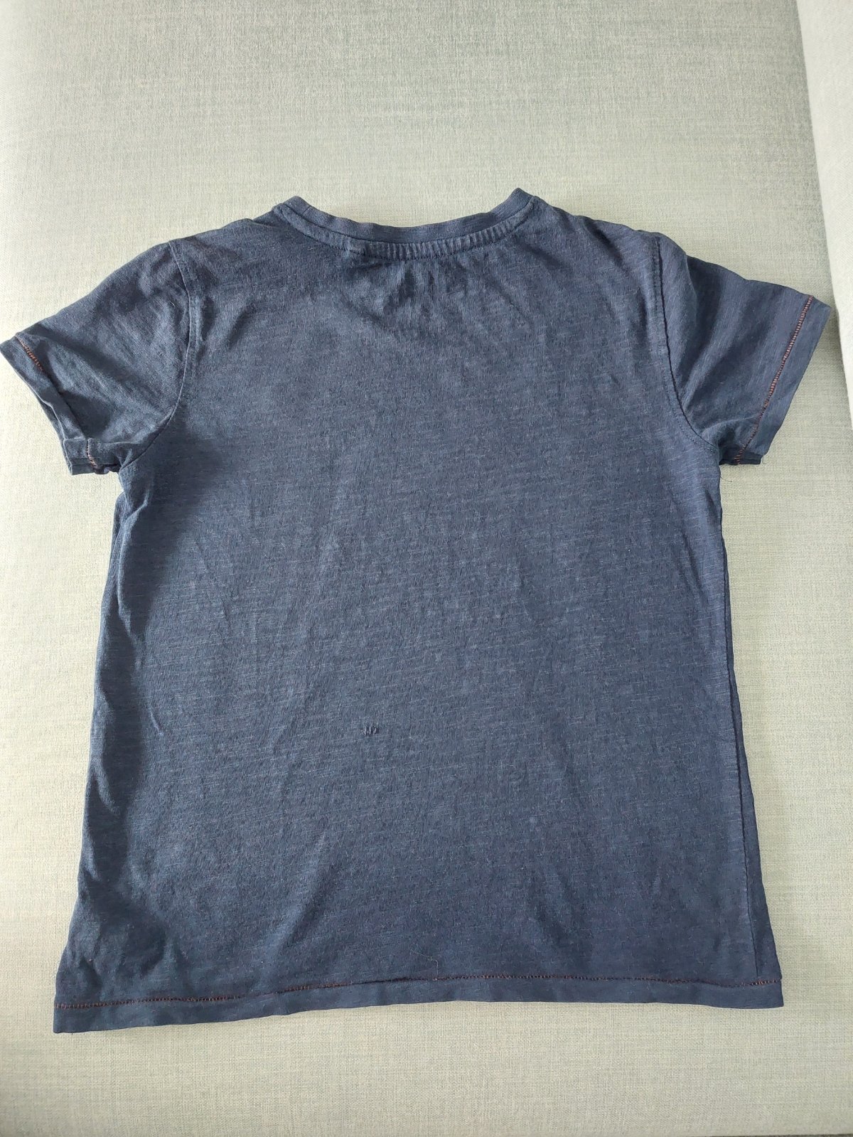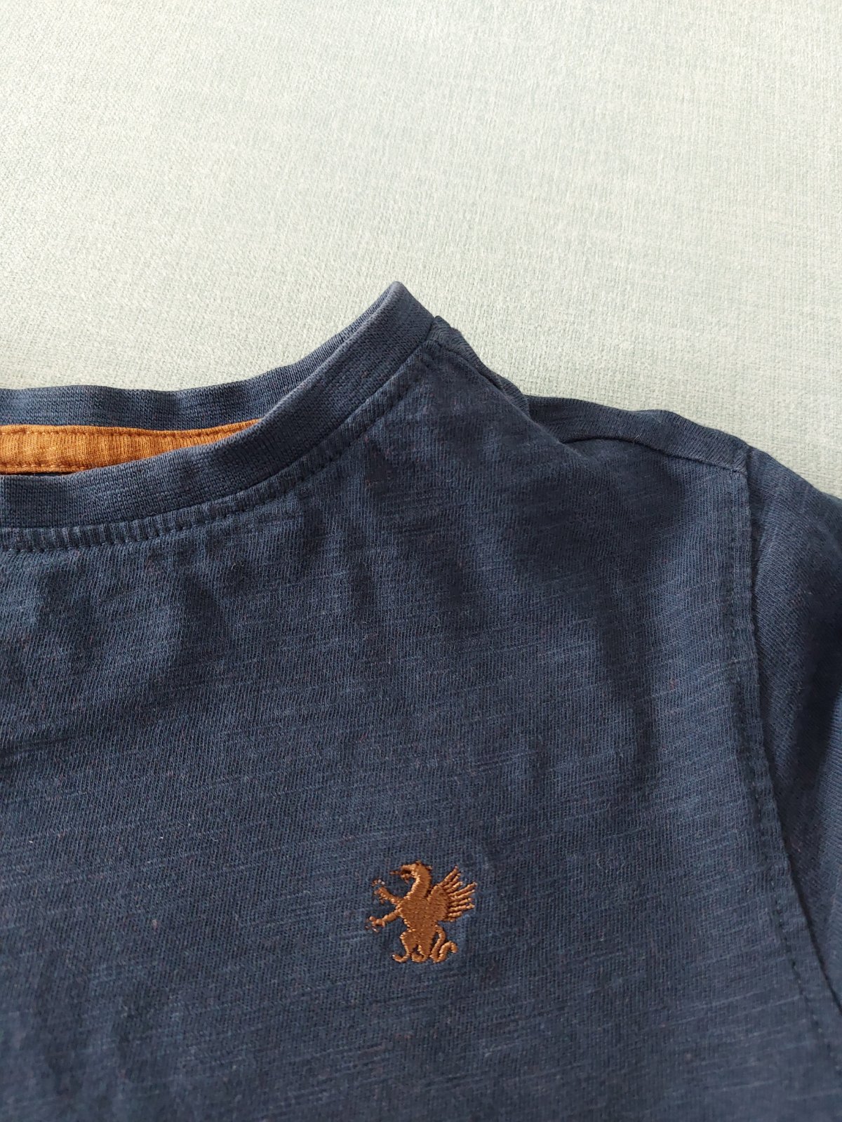 Krásne tmavomodre tricko (fotak mi zosvetluje,farba este tmavsia ako na detaile s tym zverom), vždy mi prišlo s tým vysitym levom,fenixom ci co to je :) take elegantnejsie. Takže ho nosil na oslavy,nez na dvor. Ale podarilo sa mu ho zatrhnut,tak vznikla mala dierka,ktorú som zasila.