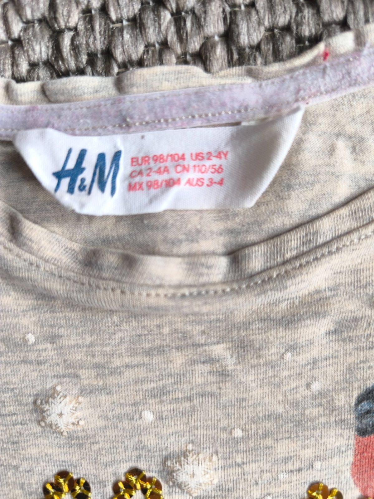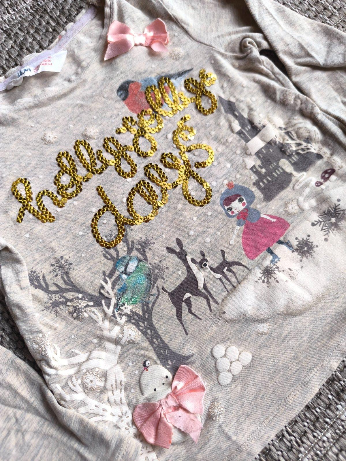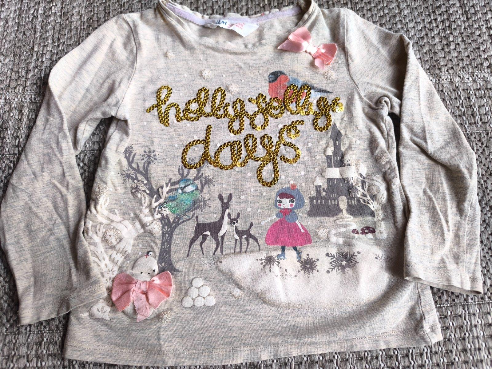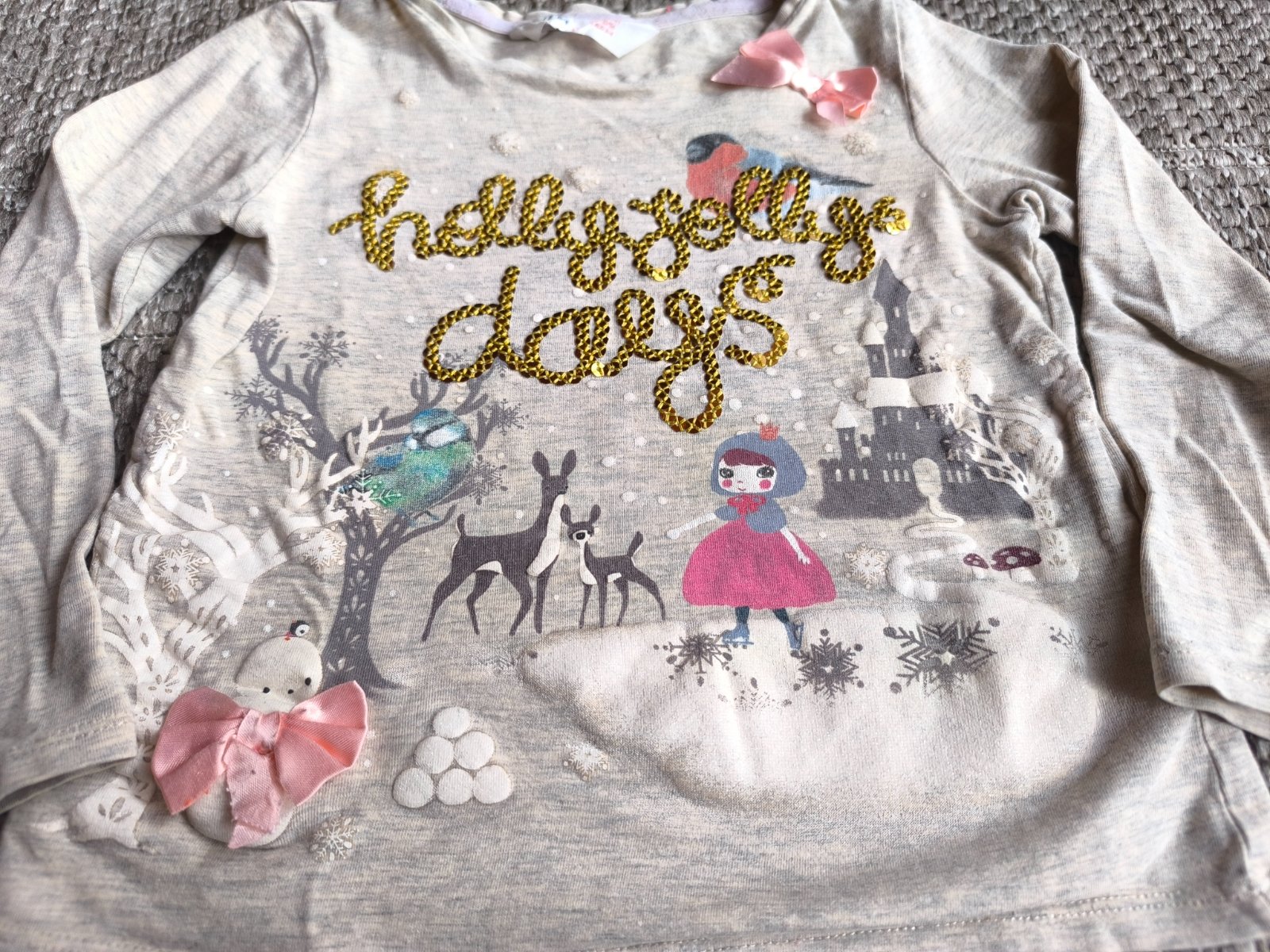Nádherné tričko s potlačou a flitrami so zimnou sviatočnou tématikou, vhodné nielen na každodenné nosenie, ale aj sviatočné príležitosti, či vianočné fotenie. V super stave. Veľkosť 98/104, 2-4 roky. Dĺžka 35cm, šírka 30vm, rukáv od ramena 32cm.