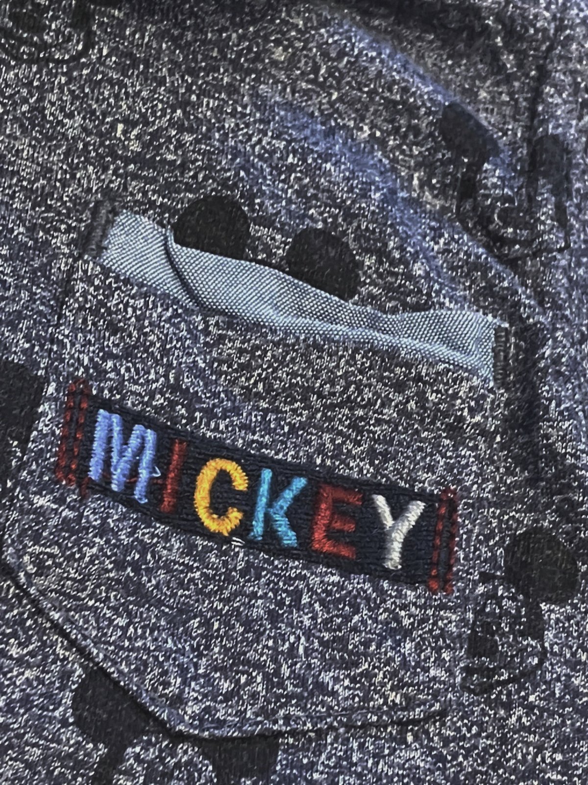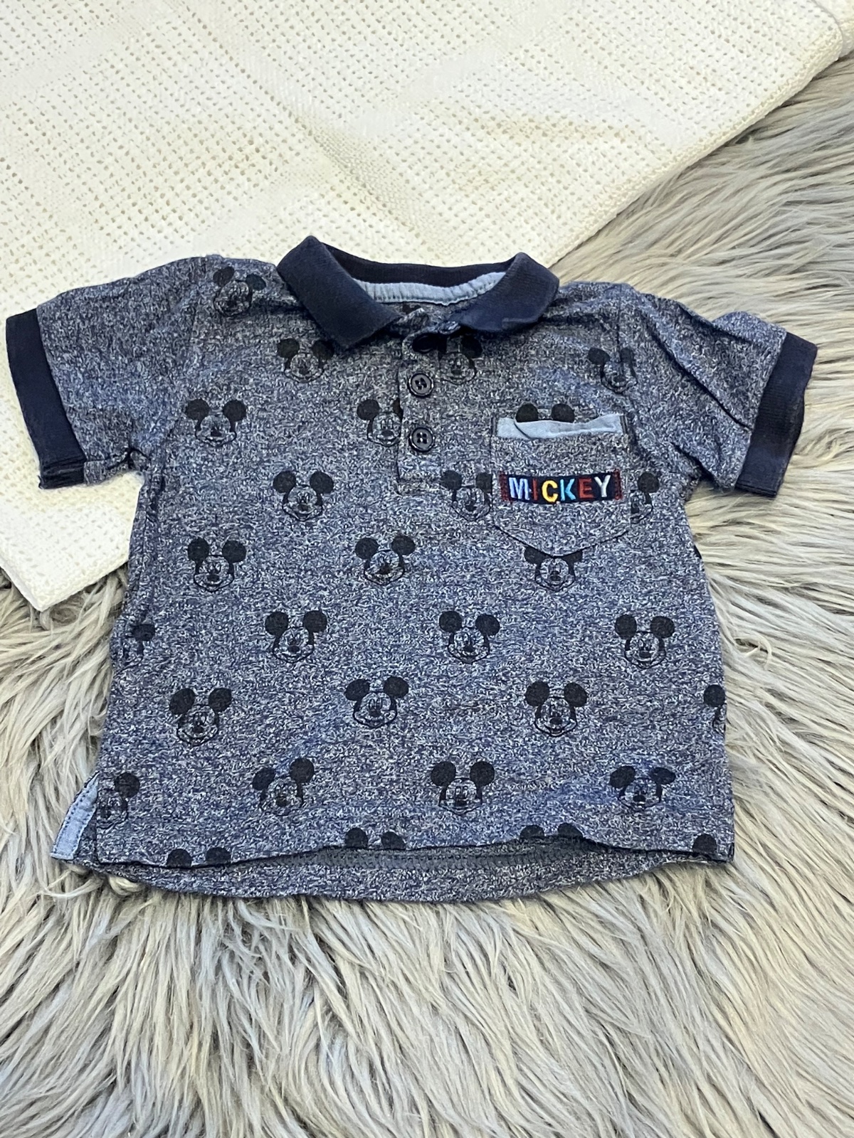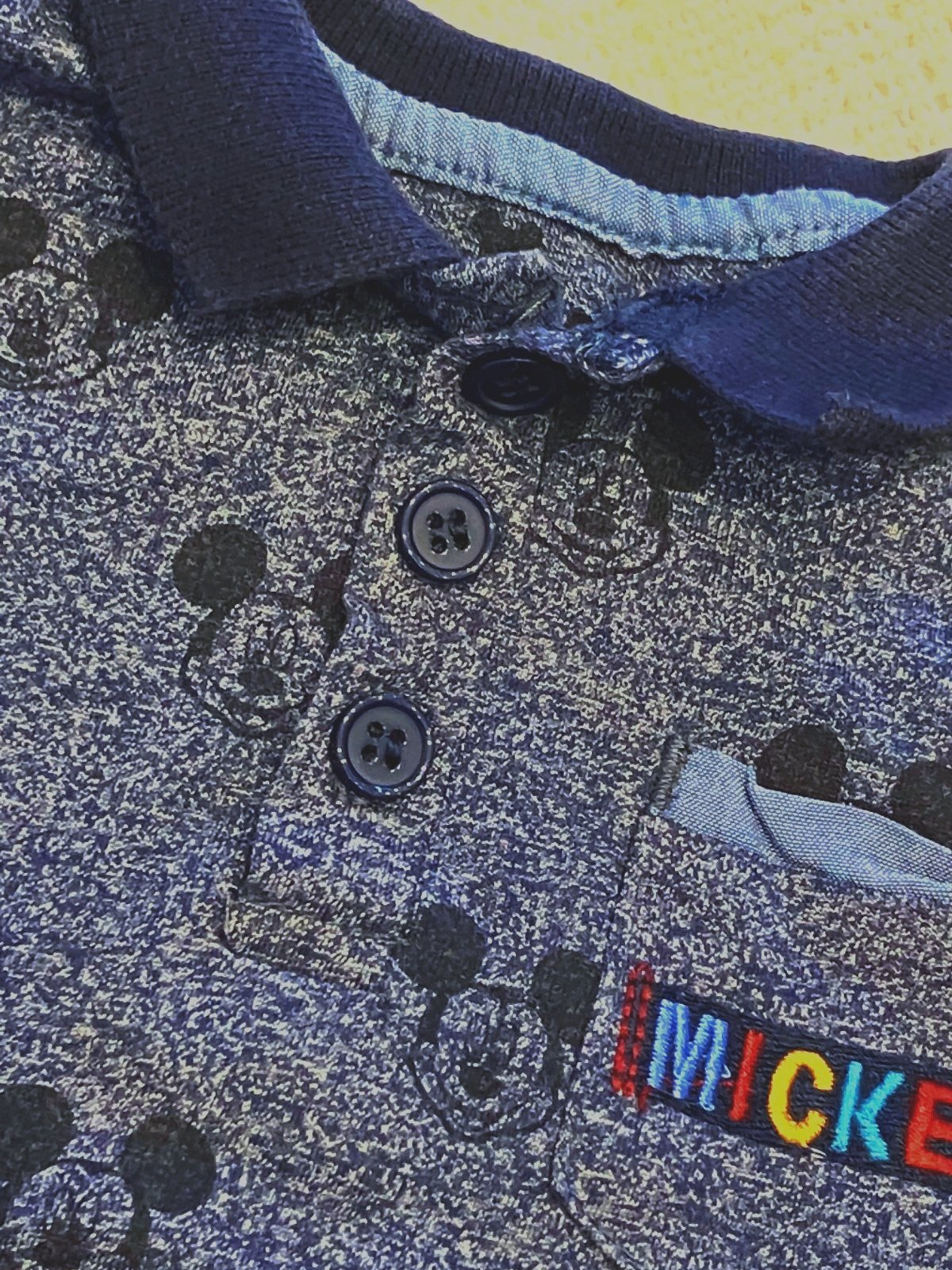 Chlapčenské tričko s krátkym rukávom a golierom, melírované, so vzorom Mickey, jedno vrecko na hrudi, zapínanie na tri gombíky, elastické, pre 3-6 mes., materiál 52% bavlna 48% polyester.
