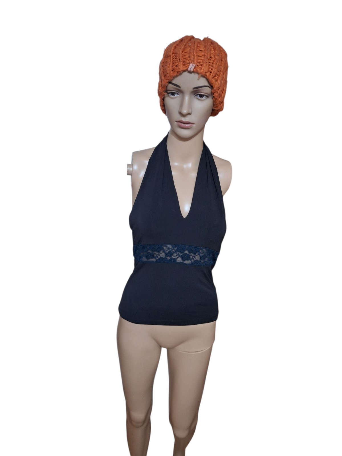 Čierny krajkový top, spodná časť s flitrami, zaväzovanie okolo krku. Sedí na XS-S. Flitre na niektorých miestach opadané. Zdarma k nákupu.
