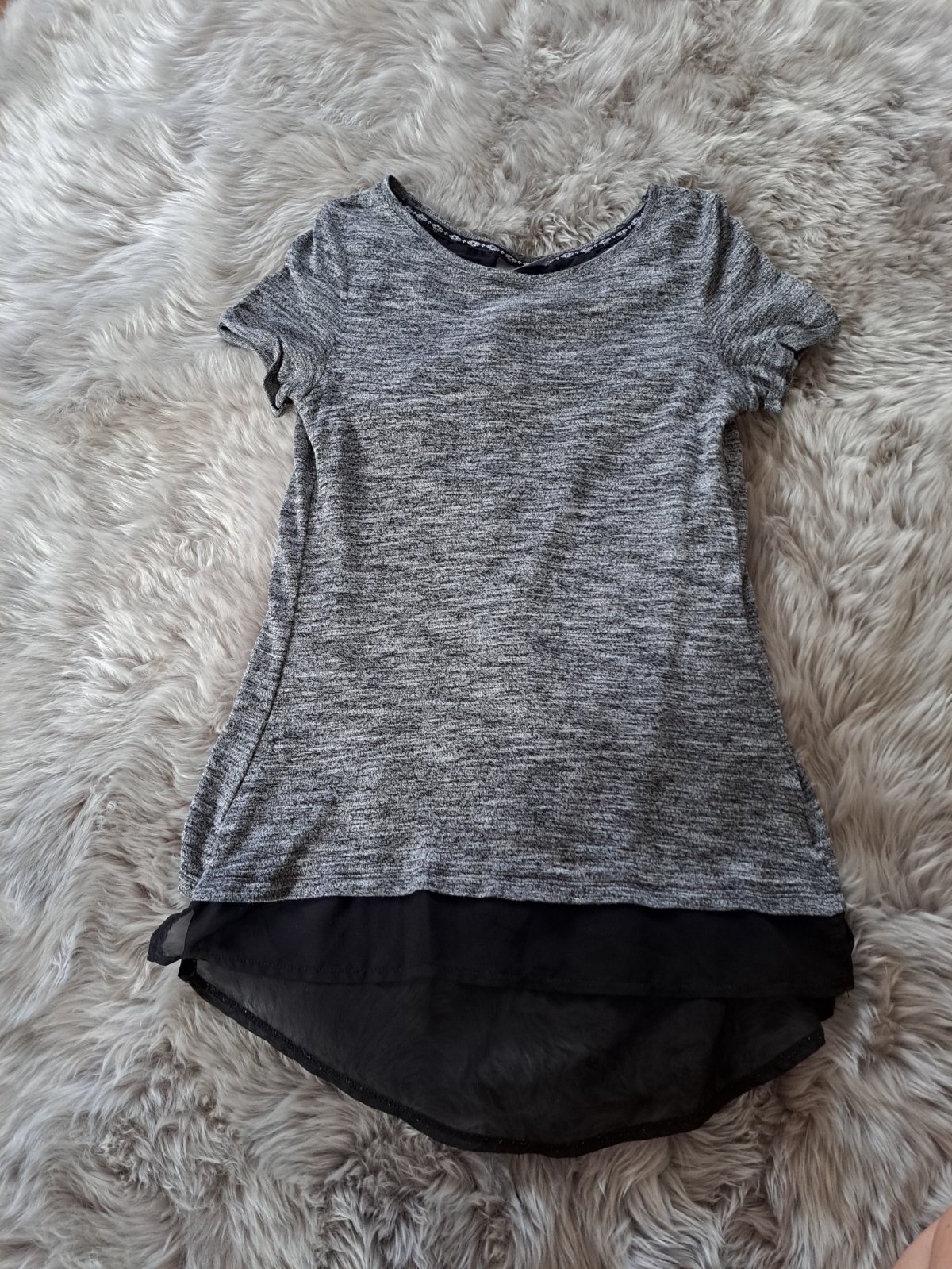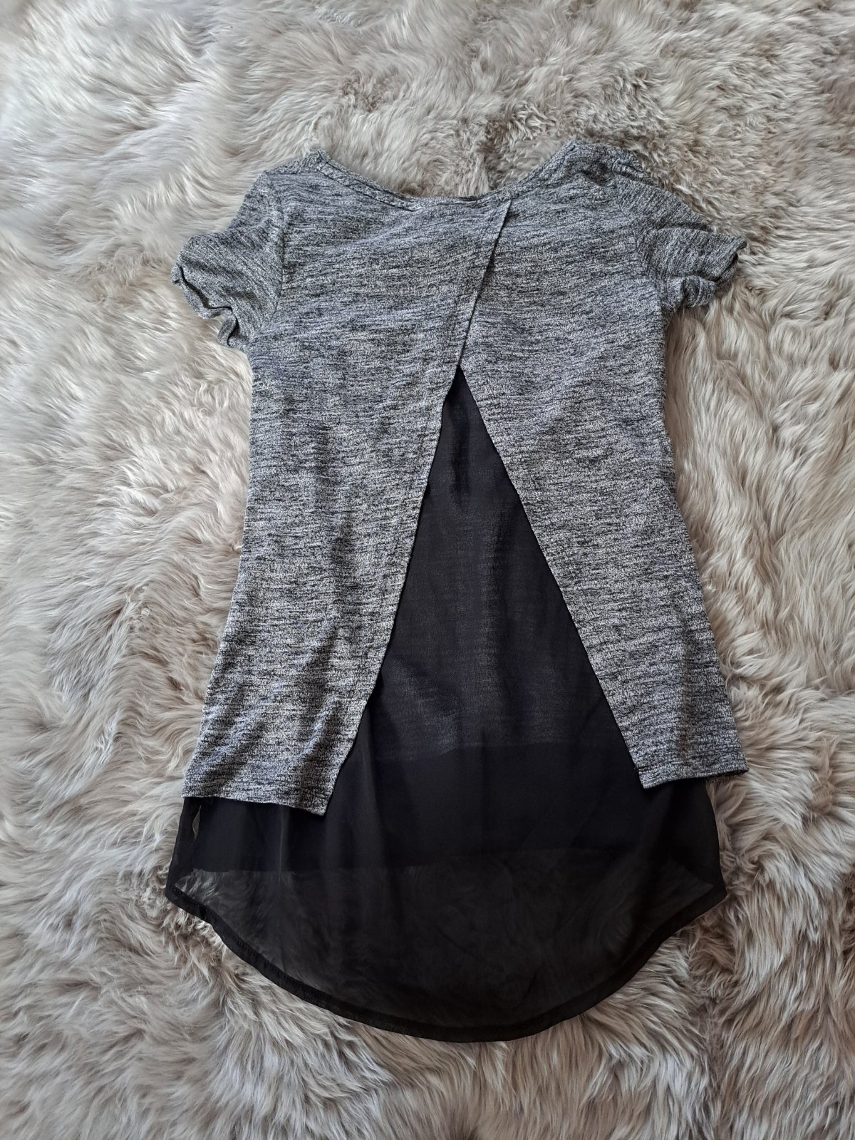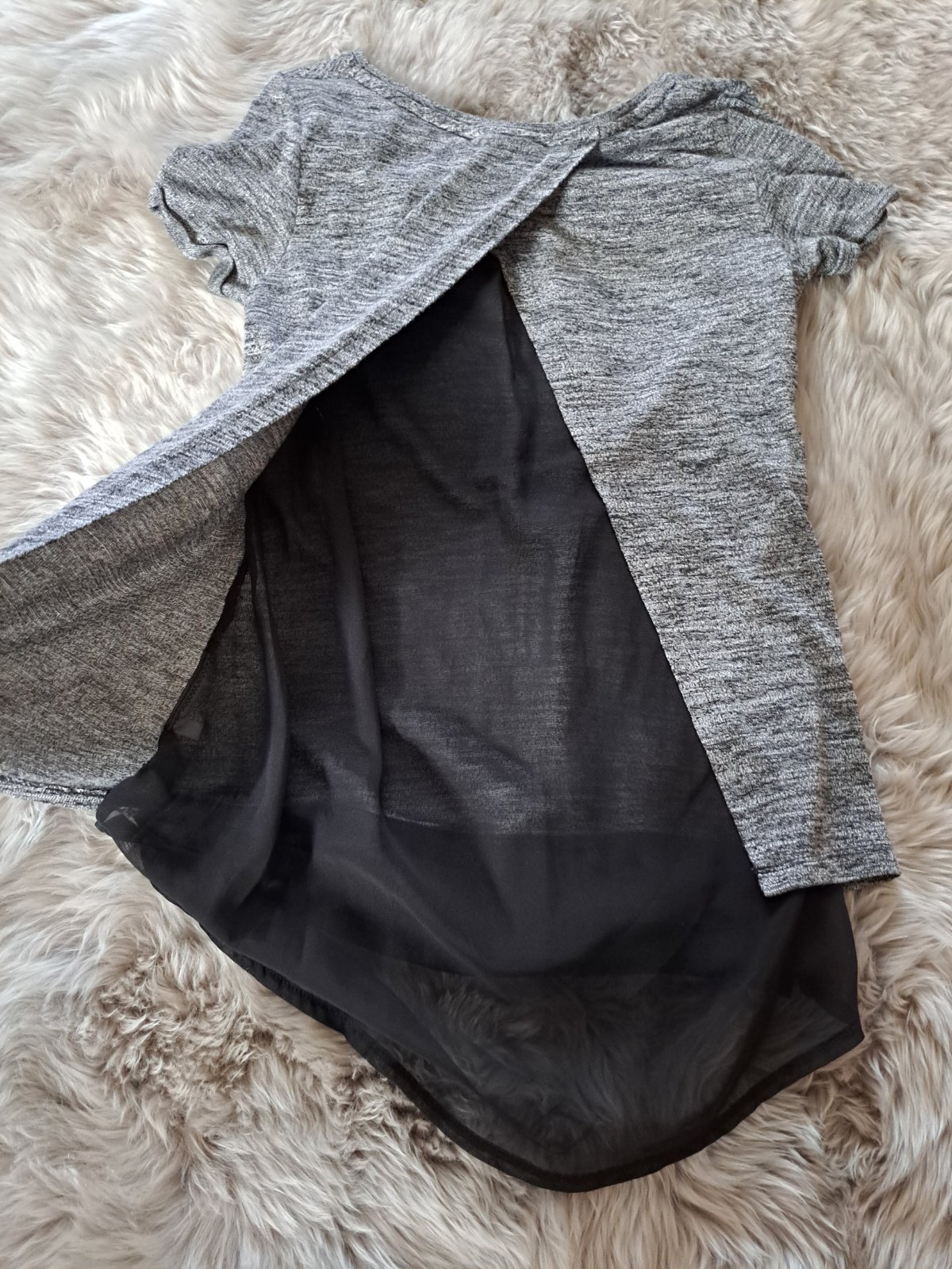 Prijemne zaujimave tricko/top s predlzenou zadnou castou. Zadna cast riesena ako jemna mesova vrstva s rozstrihnutou castou materialu predneho dielu. Velmi prijemne na nosenie, prisposobive. Sadne ako vel.34/36. Bez poskodenia ako nove