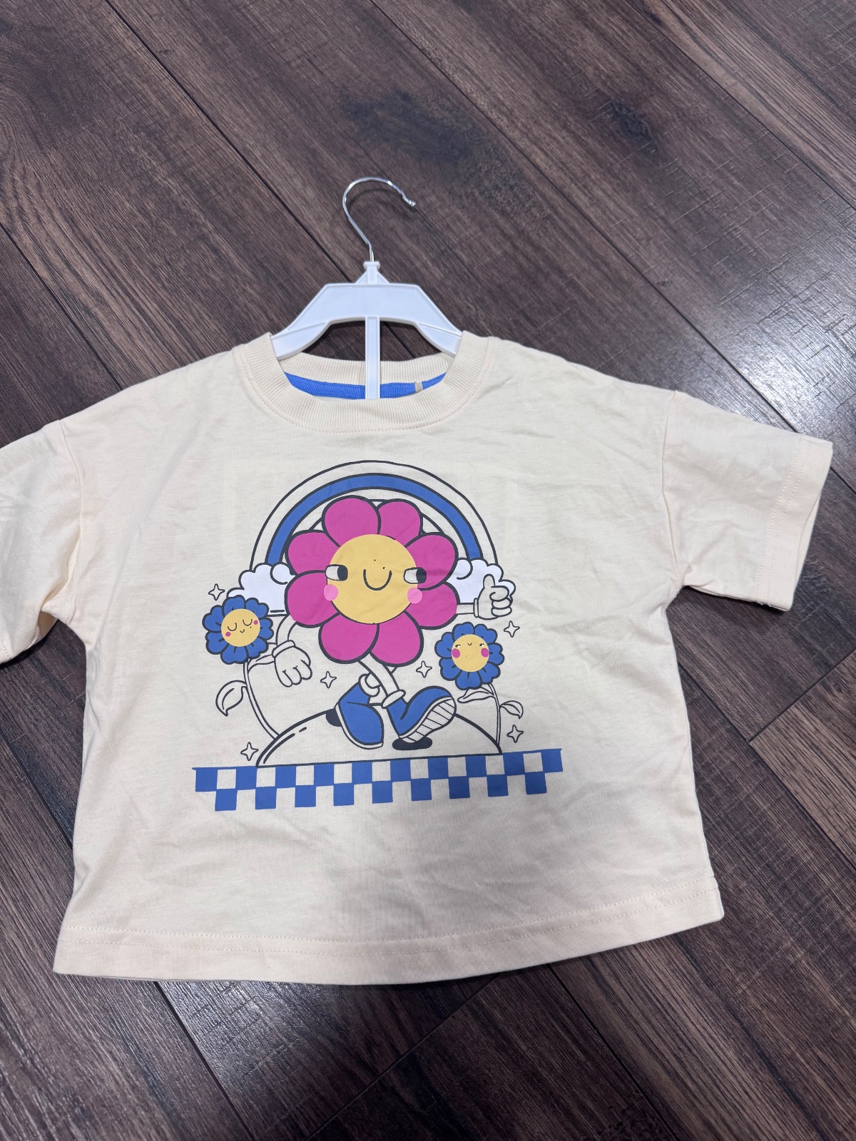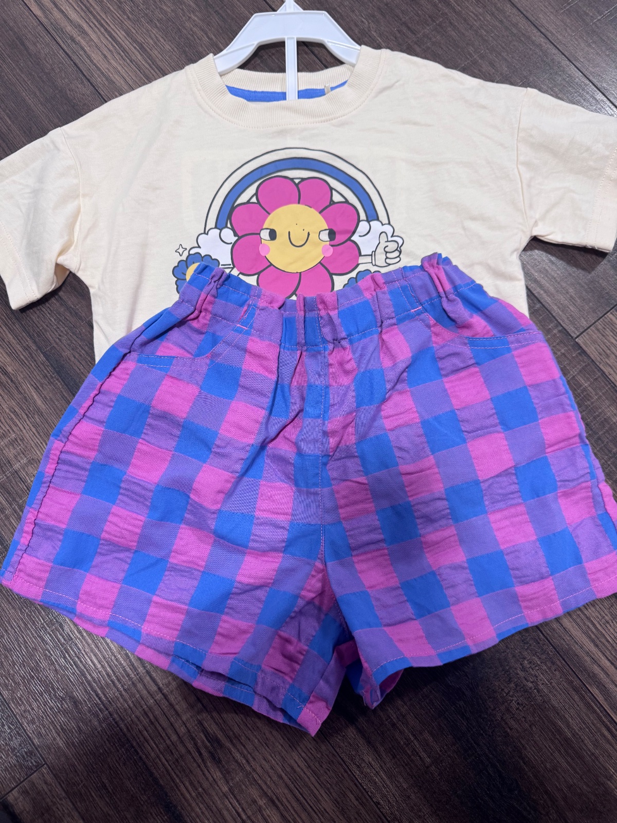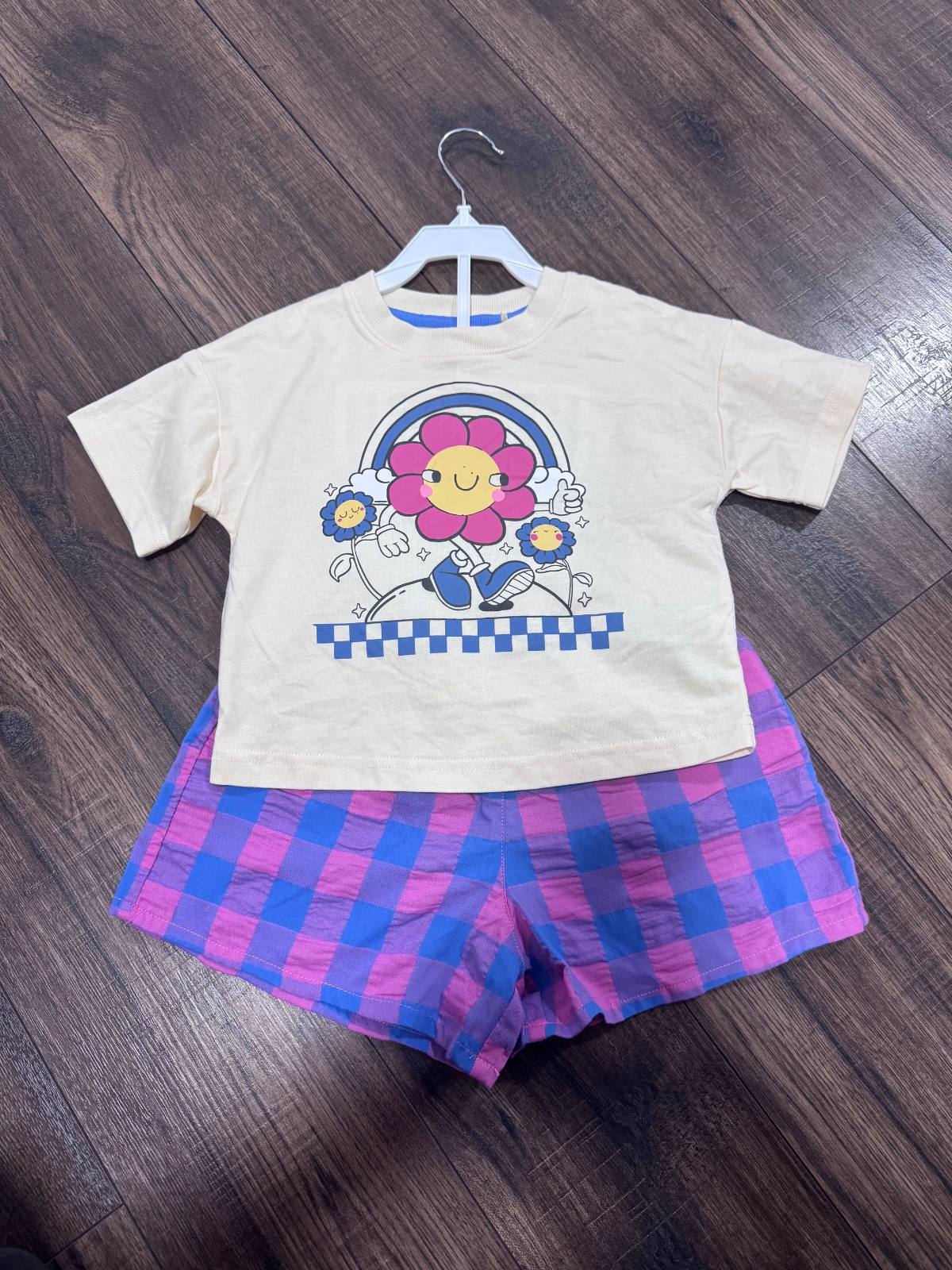 Tričko s veselou potlačou kvetinky a dúhy + farebné kárované kraťasy.