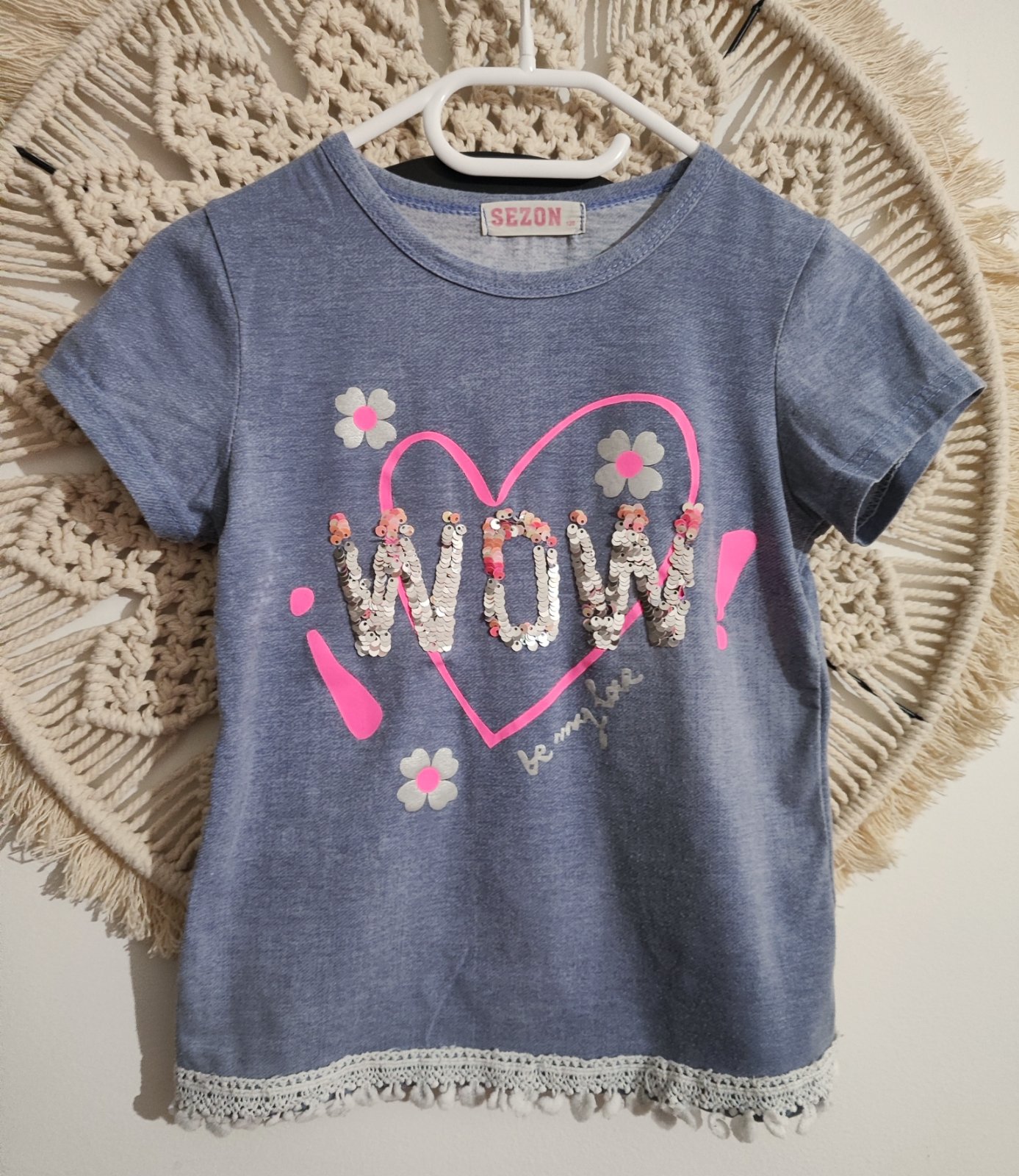 Predám málo nosené dievčenské bavlnené tričko. S aplikáciou a flitrami. Obvod hrudníka: 68cm. Obvod pásu: 72cm a Dĺžka: 50cm.