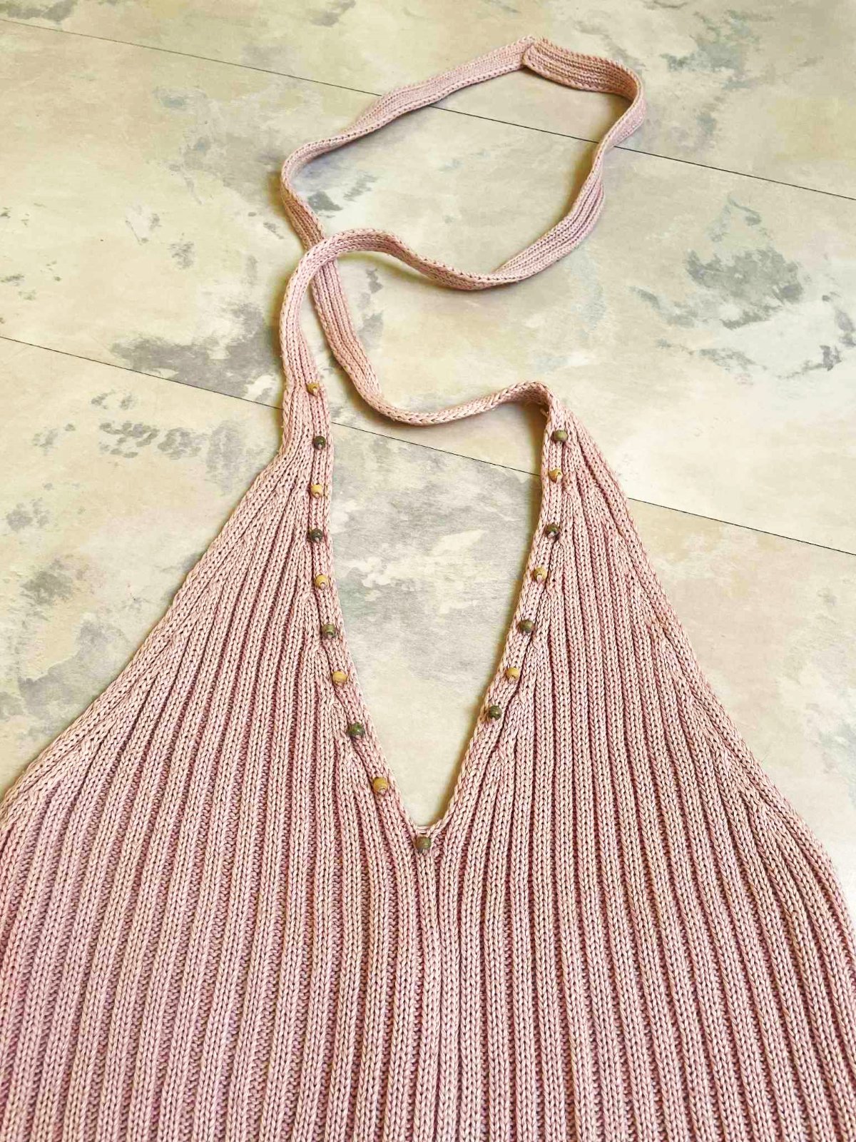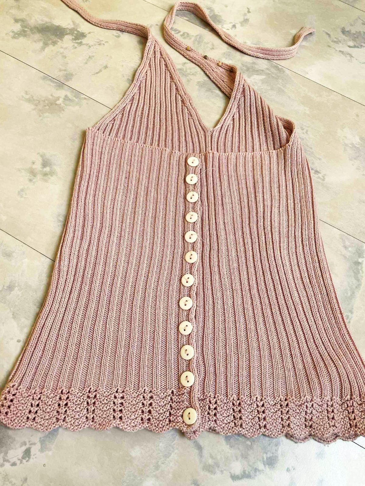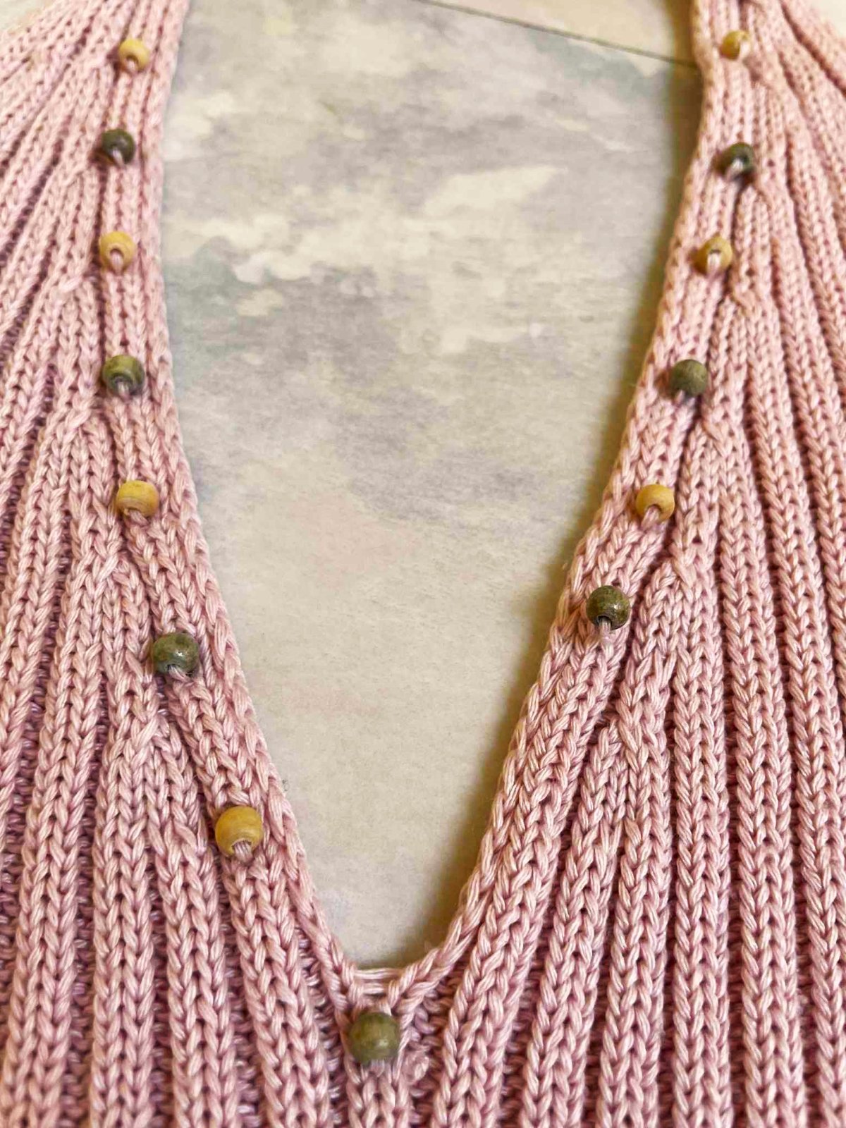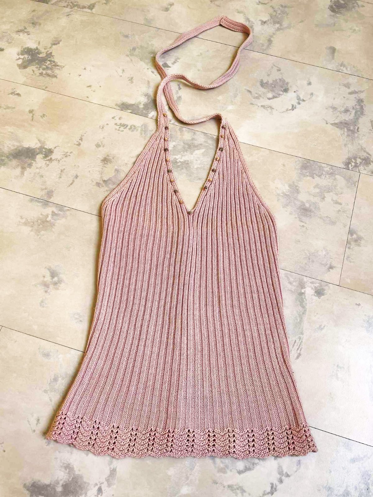 nevšedné cvernové pletené tielko s holým chrbátom,ukončené krásnou háčkovanou bordúrou,vzadu na gombíky- iba ako ozdoba púdrovo ružová farba