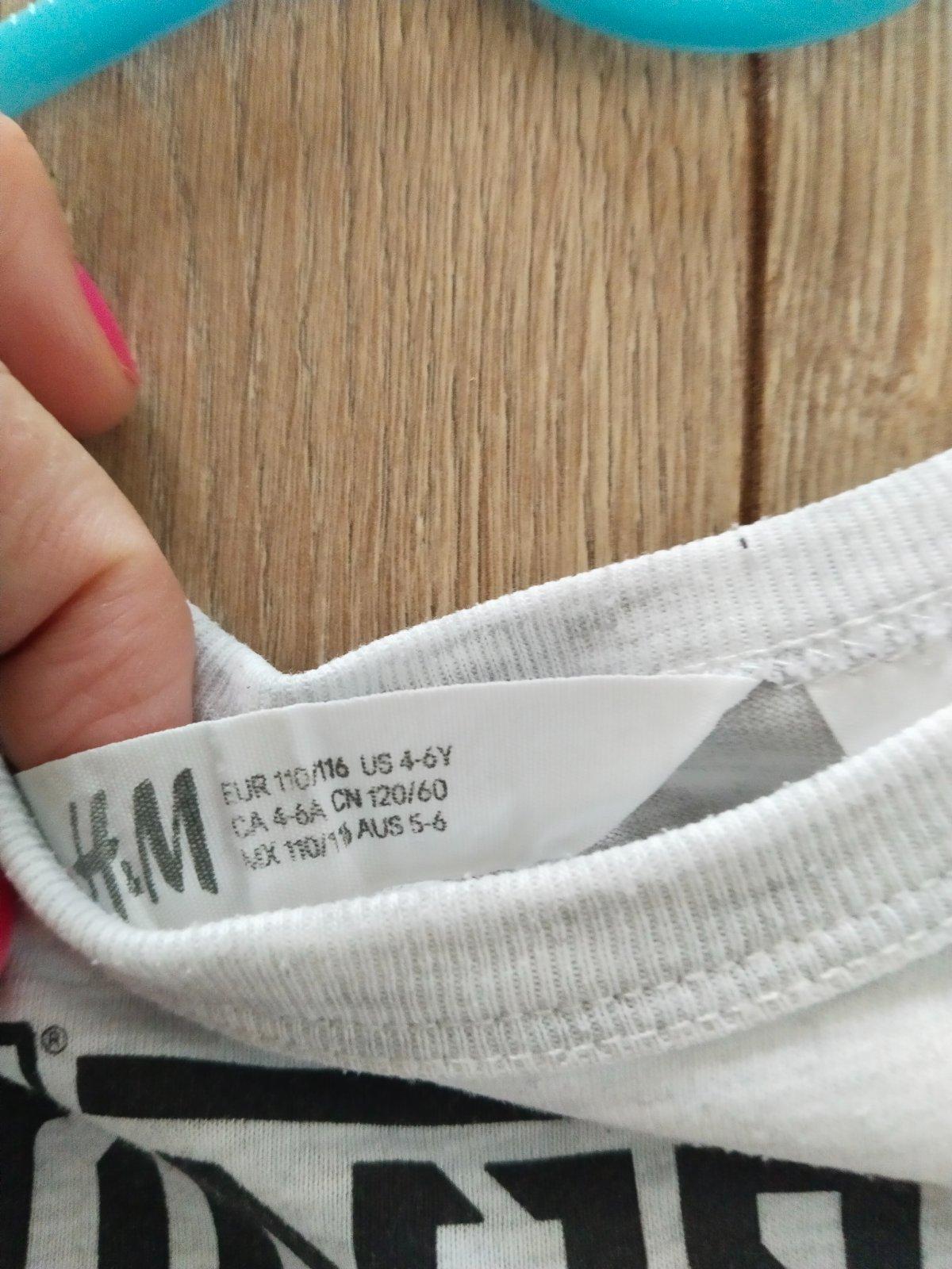 Predam tricko H&M nosene len mojím synom, bez poskodeni. Etiketa je vystrihnuta, kedze syna skrabala na krku. Velkost 110 dlzka: 48 cm, rukav: 40 cm, od krku: 47,5 cm