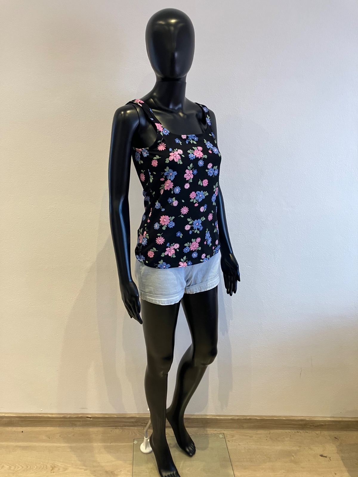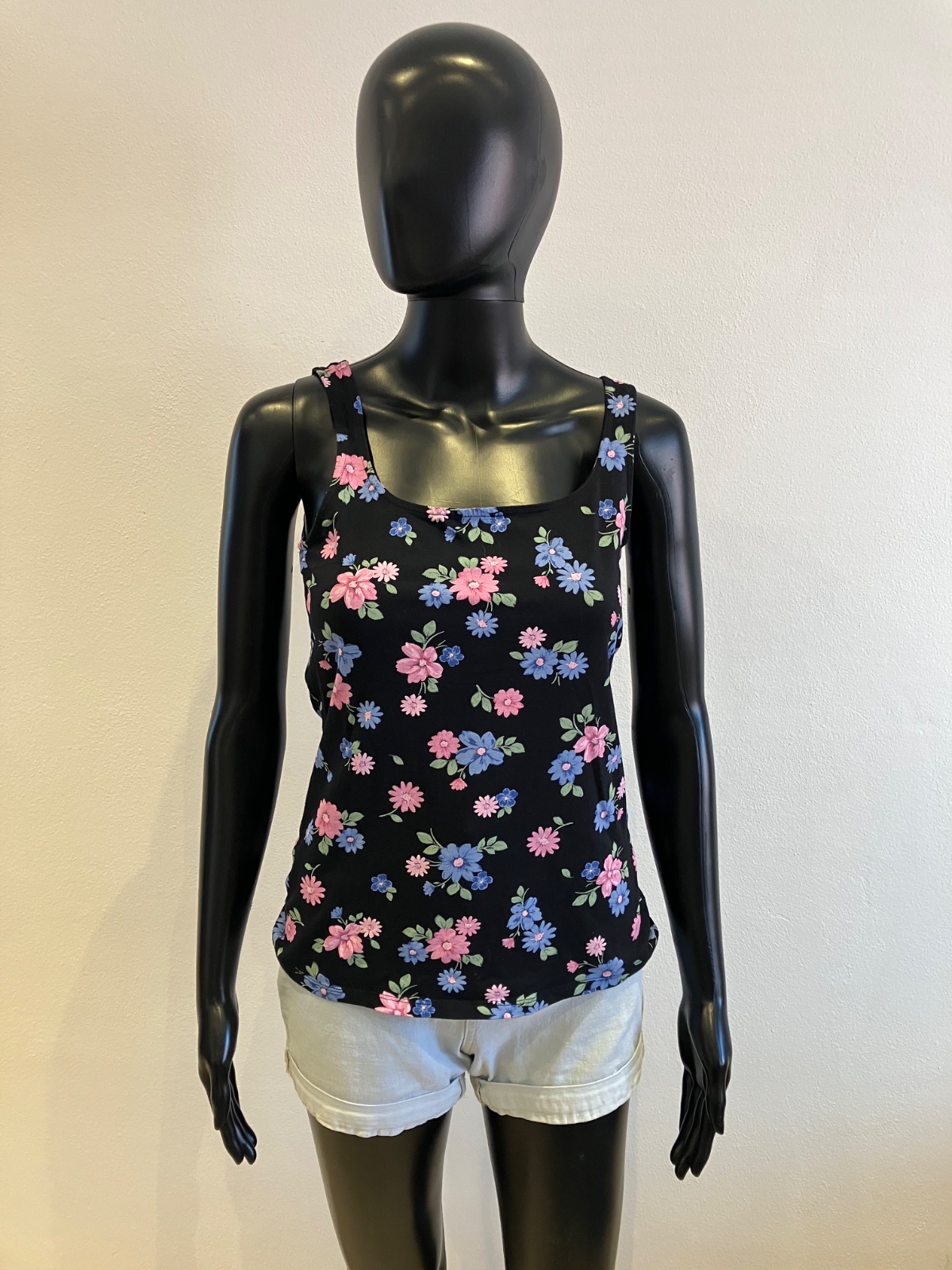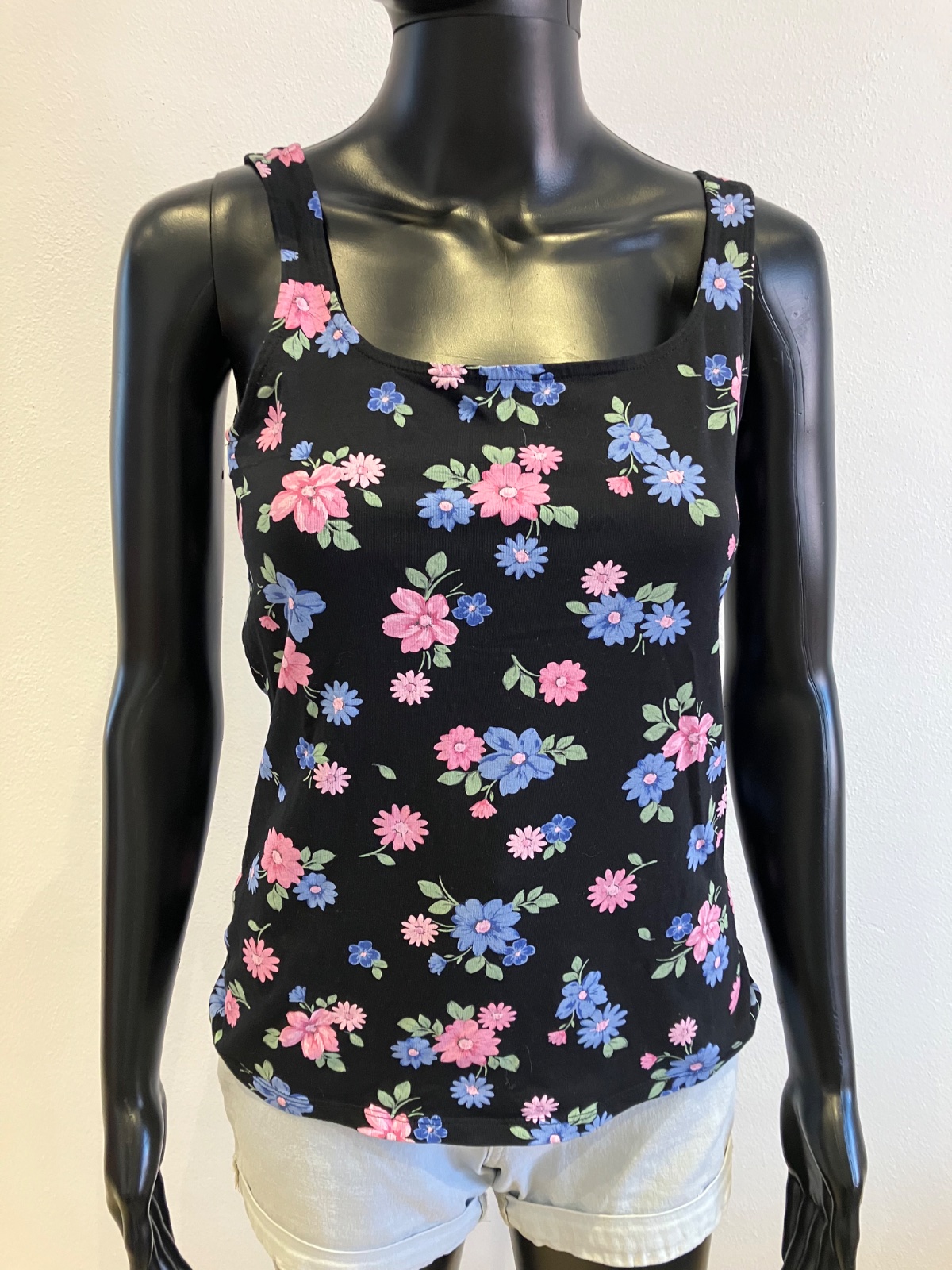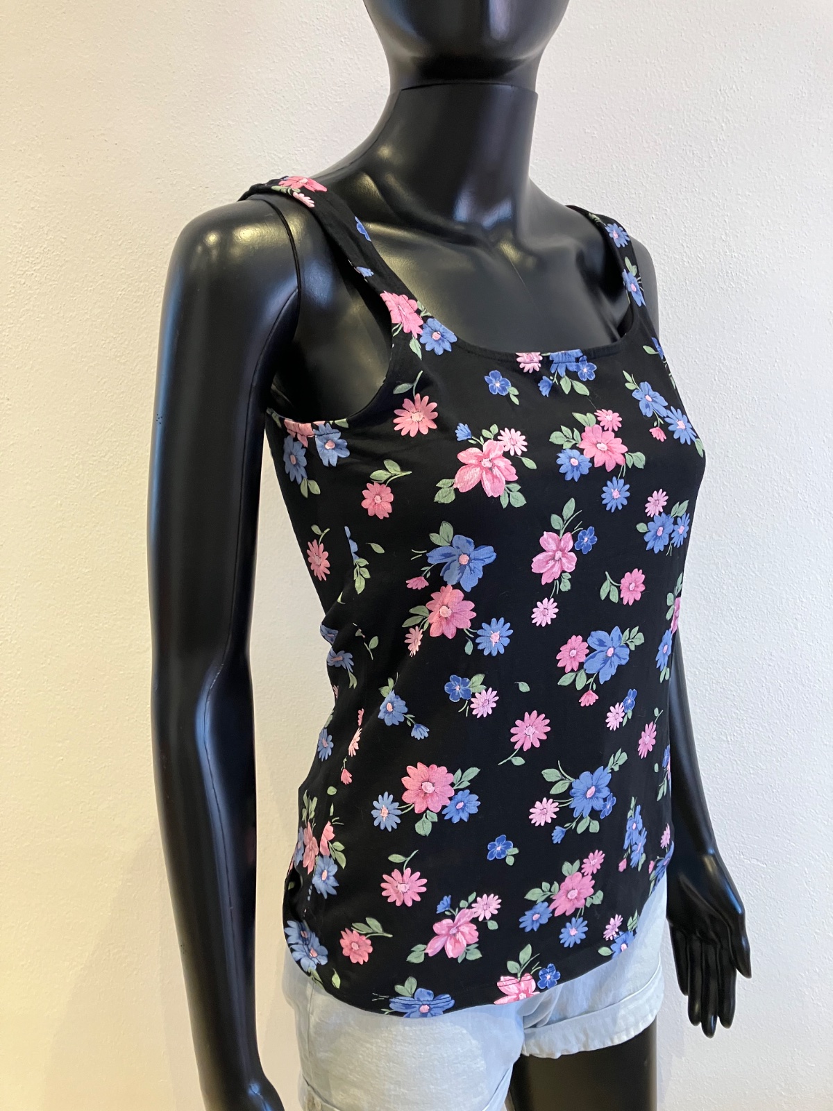 Dámske tričko bez rukávov na hrubé ramienka, kvetované, tenké, elastické, farba čierno-modro-ružovo-zelená, materiál 95%bavlna 5%elastan.