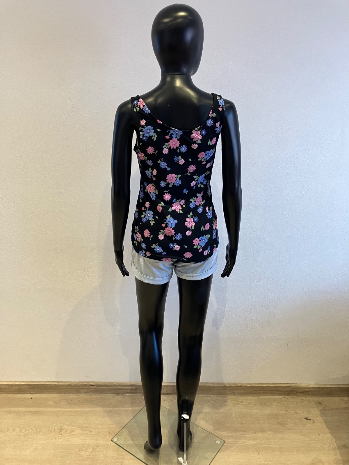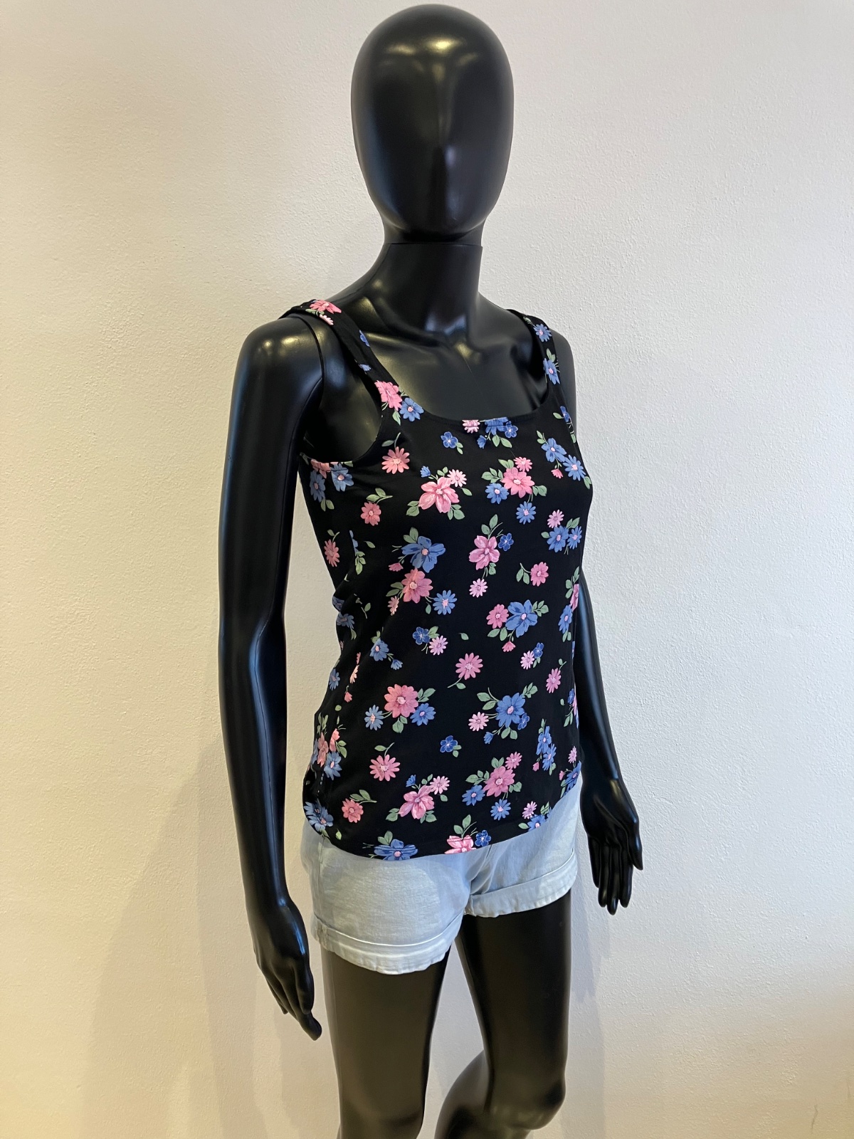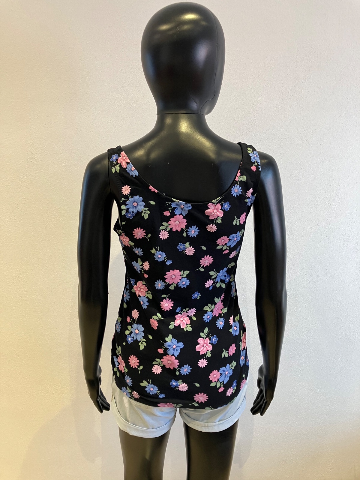 Dámske tričko bez rukávov na hrubé ramienka, kvetované, tenké, elastické, farba čierno-modro-ružovo-zelená, materiál 95%bavlna 5%elastan.