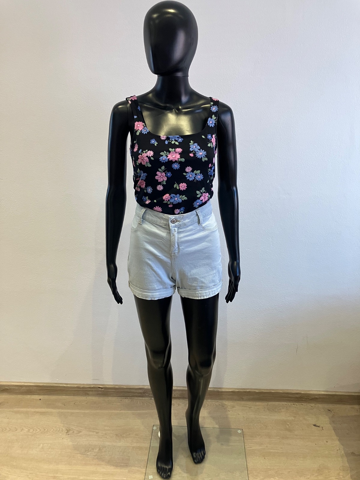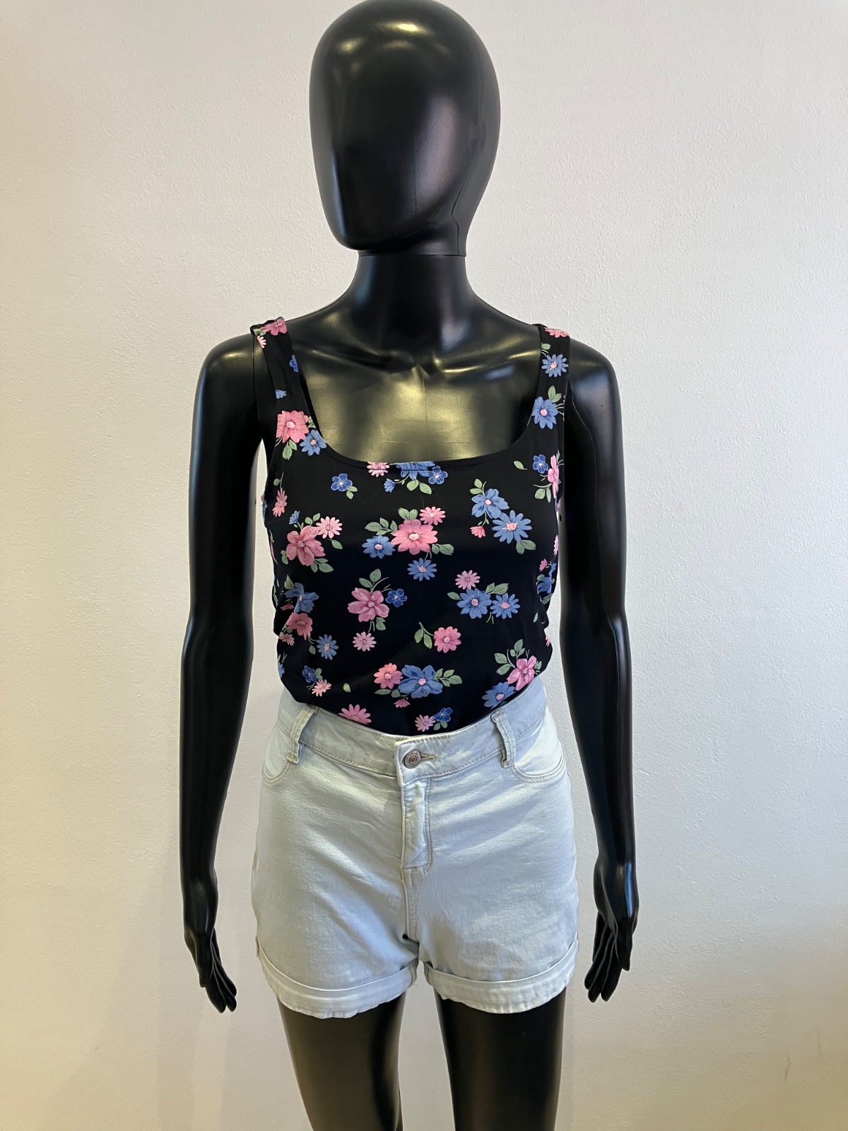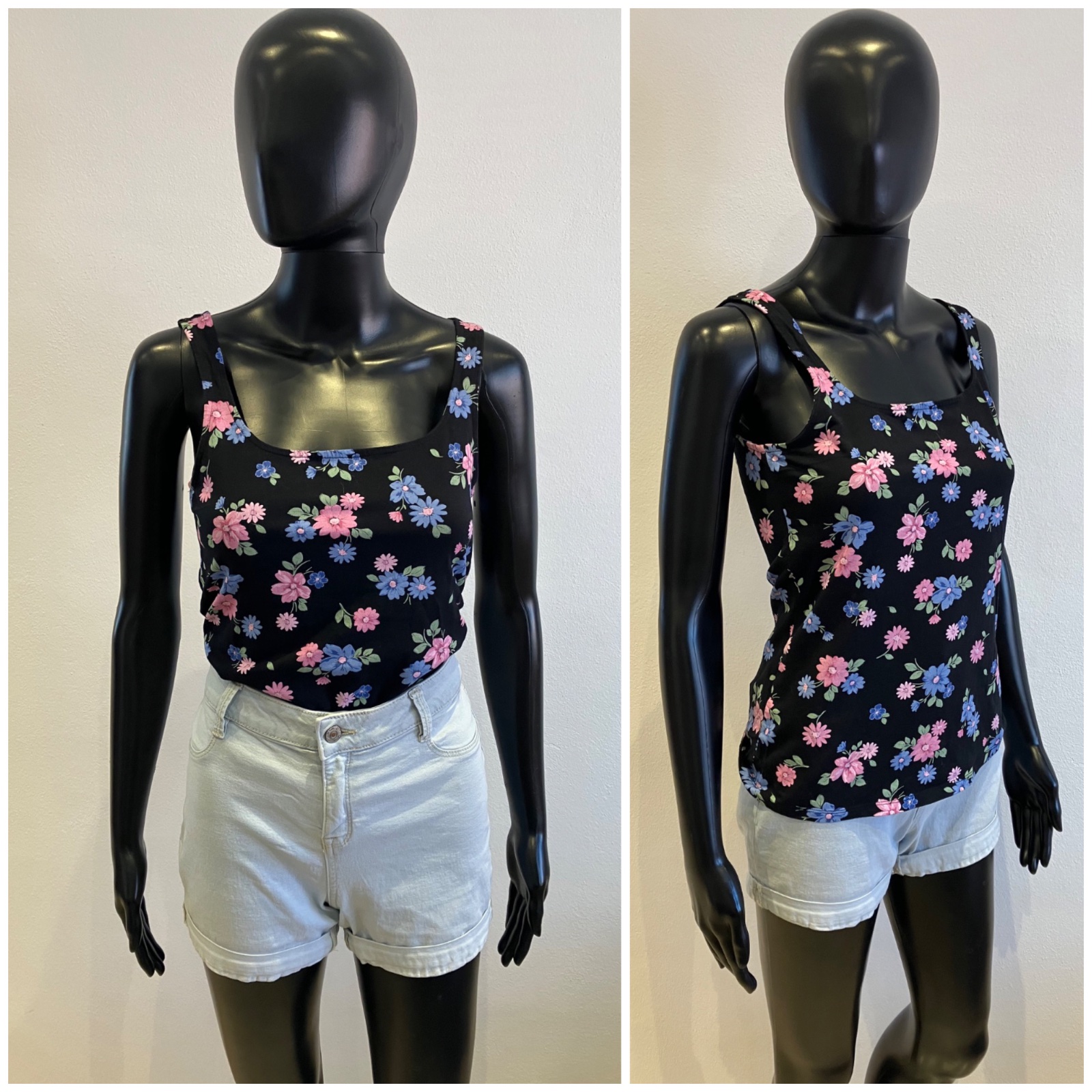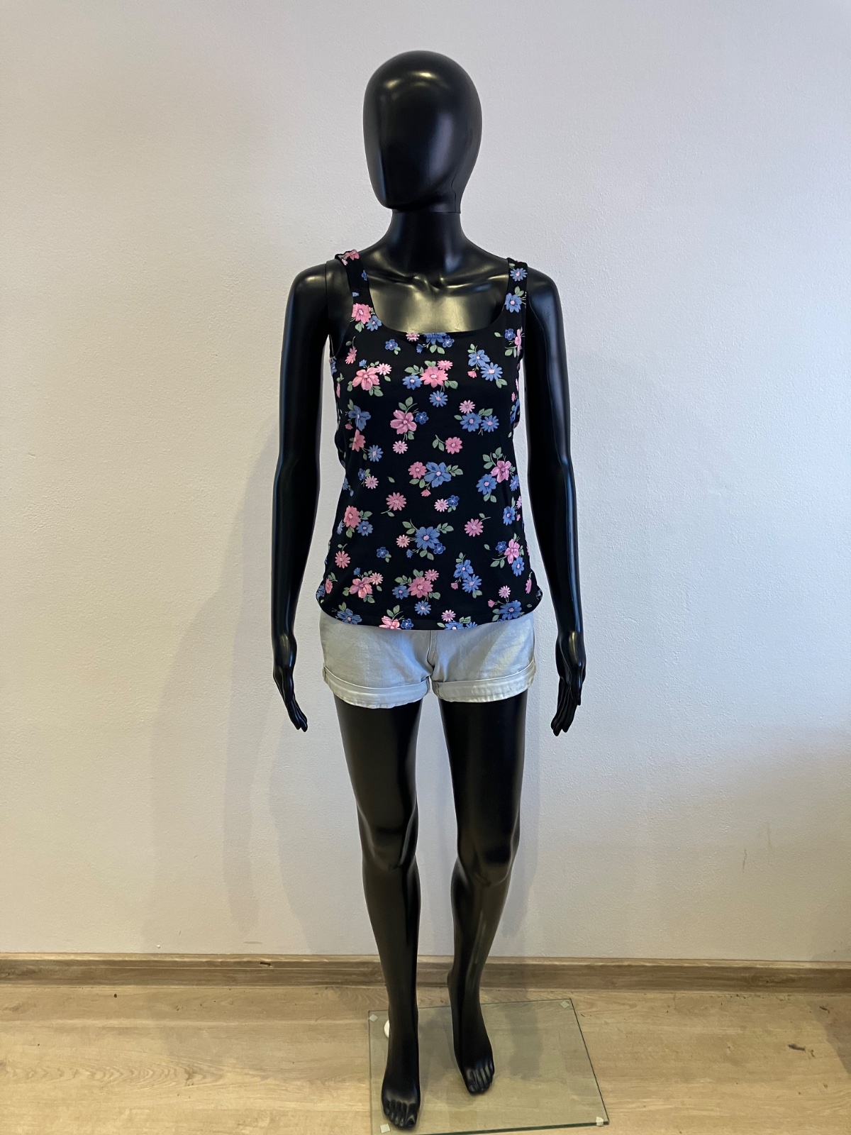 Dámske tričko bez rukávov na hrubé ramienka, kvetované, tenké, elastické, farba čierno-modro-ružovo-zelená, materiál 95%bavlna 5%elastan.
