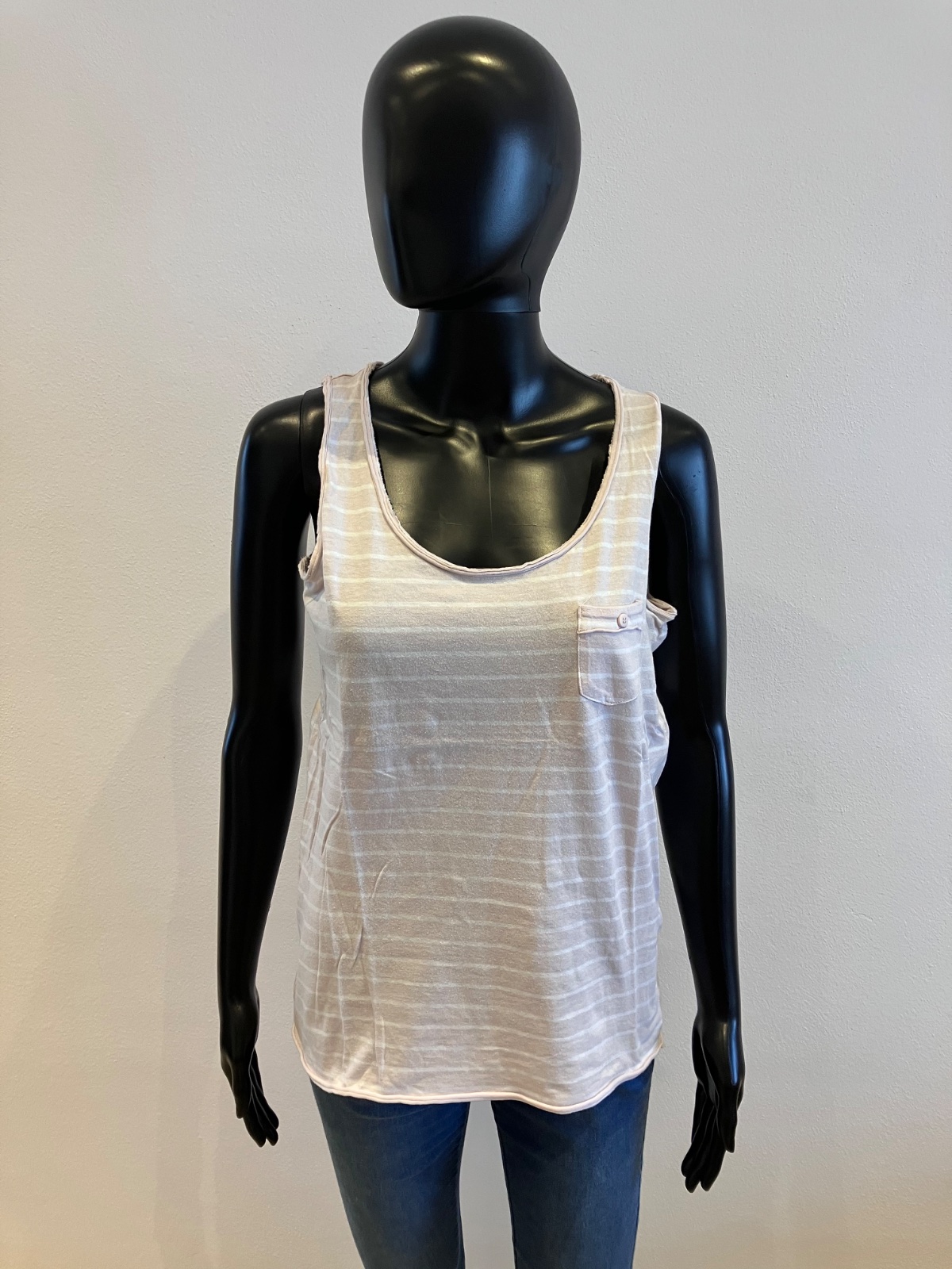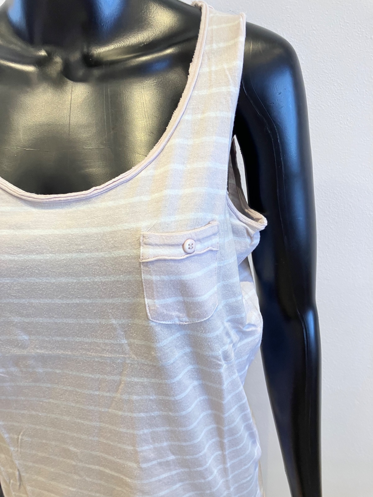 Dámske, dievčenské tričko bez rukávov, pásikavé, elastické, okrúhly výstrih, jedno malé vrecko na hrudi, materiál 100%bavlna.