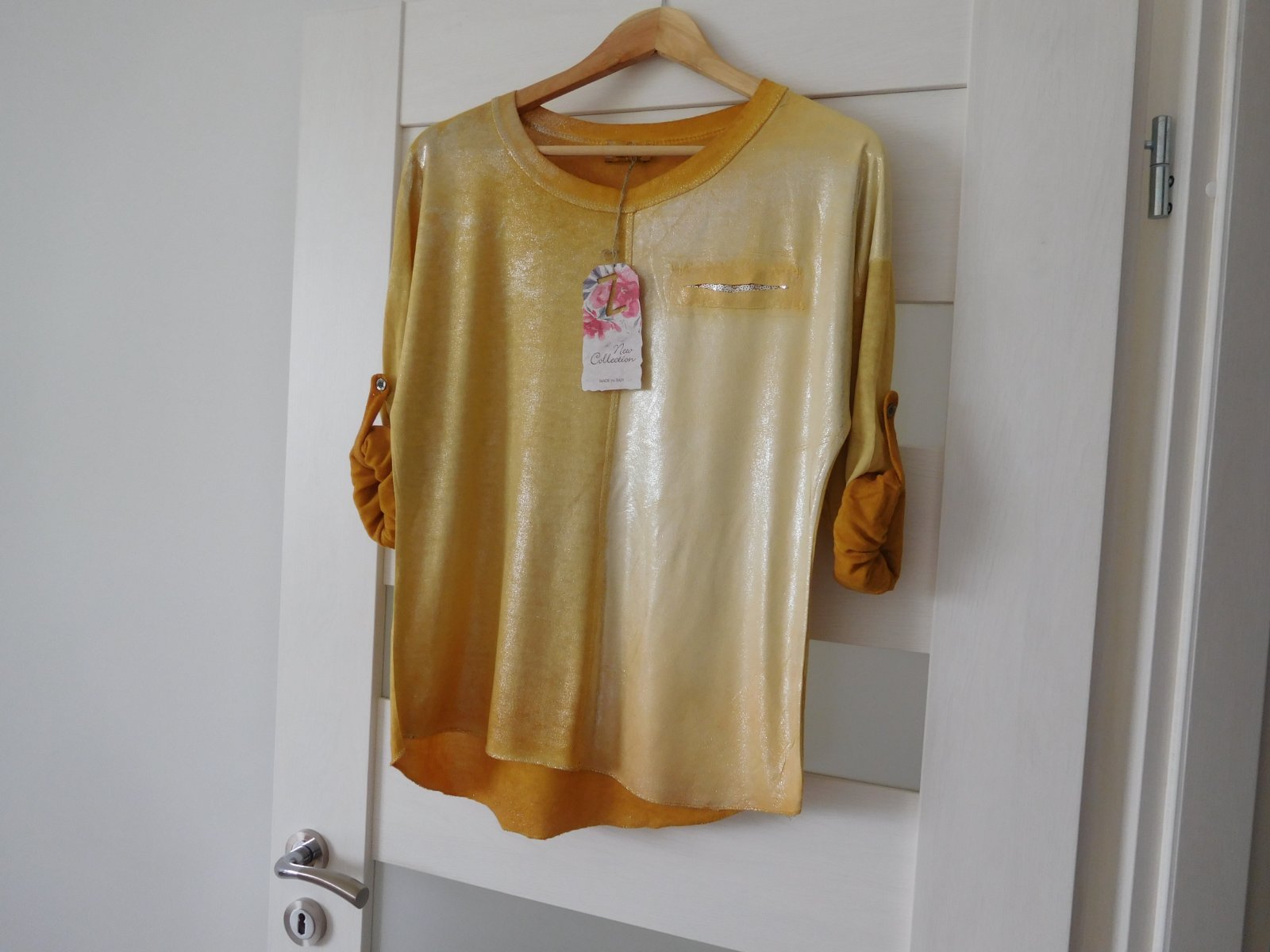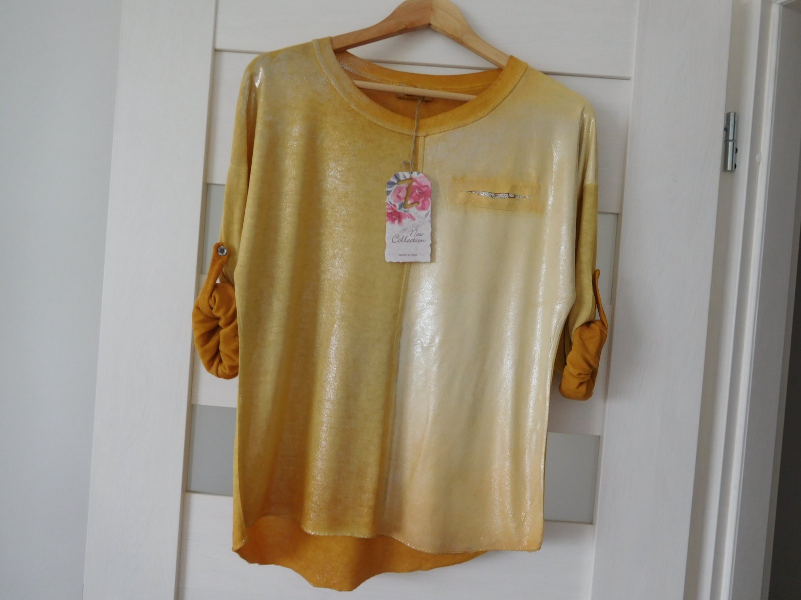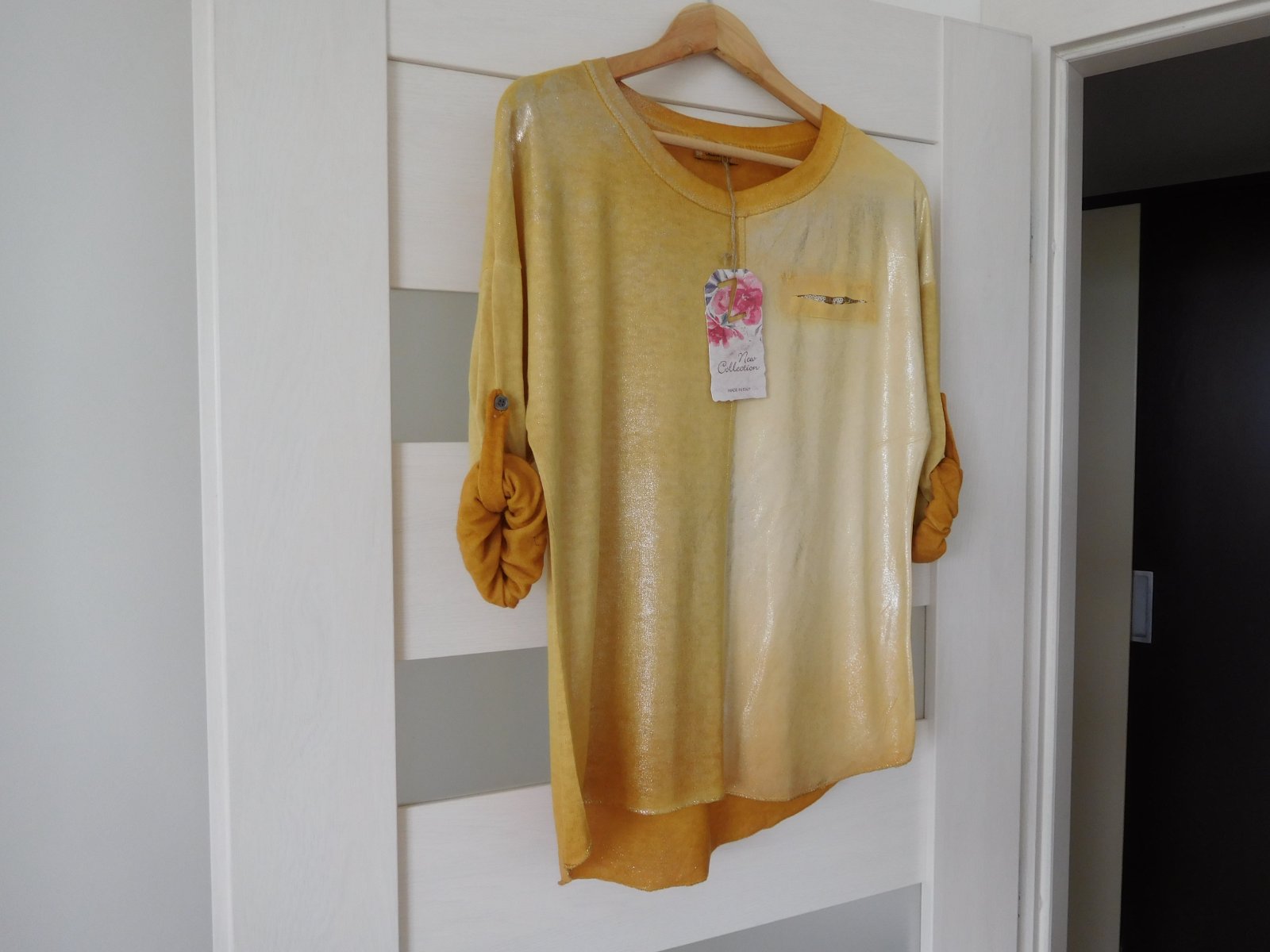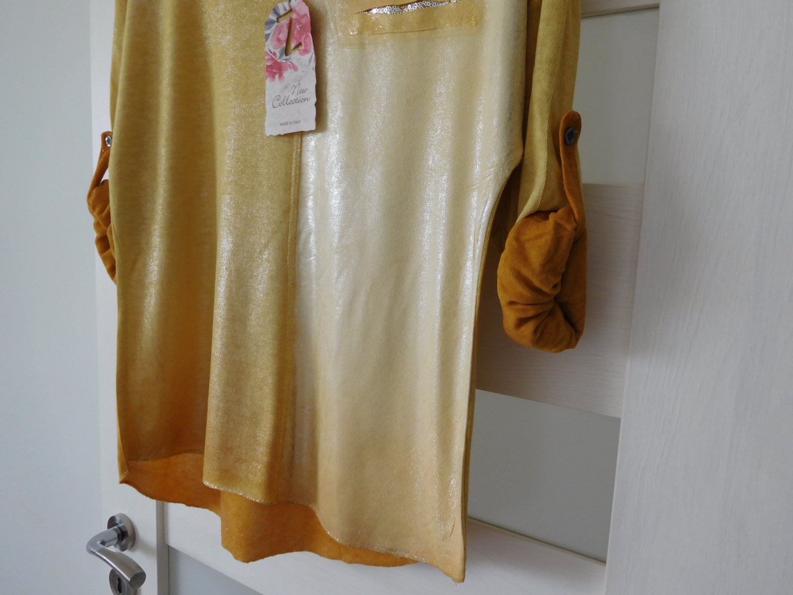 Ponúkam na predaj tričko z padavého materiálu s dlhým rukávom,ktorý sa dá ale zapnutím gombíku upraviť na 3/4 vý, viď foto.