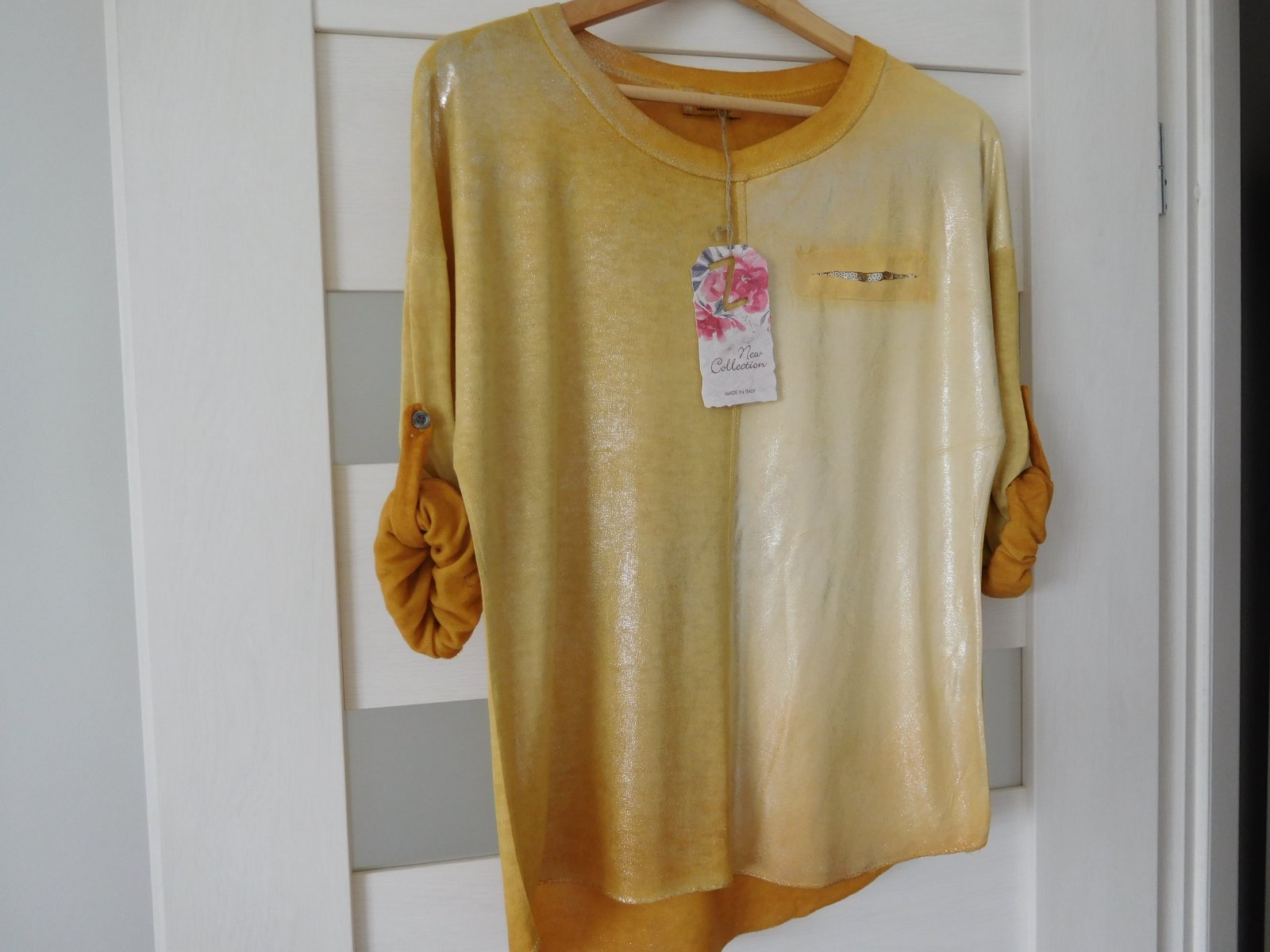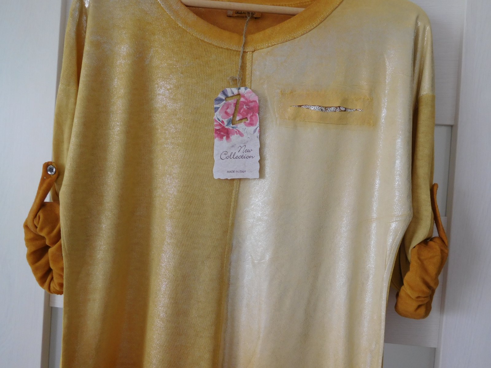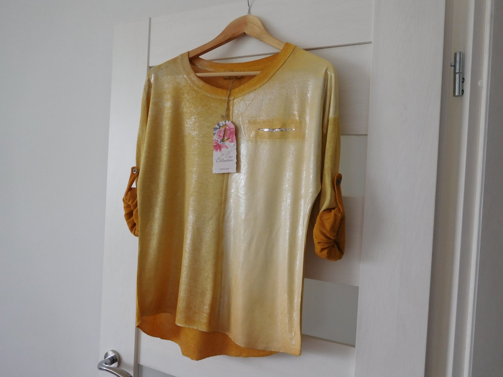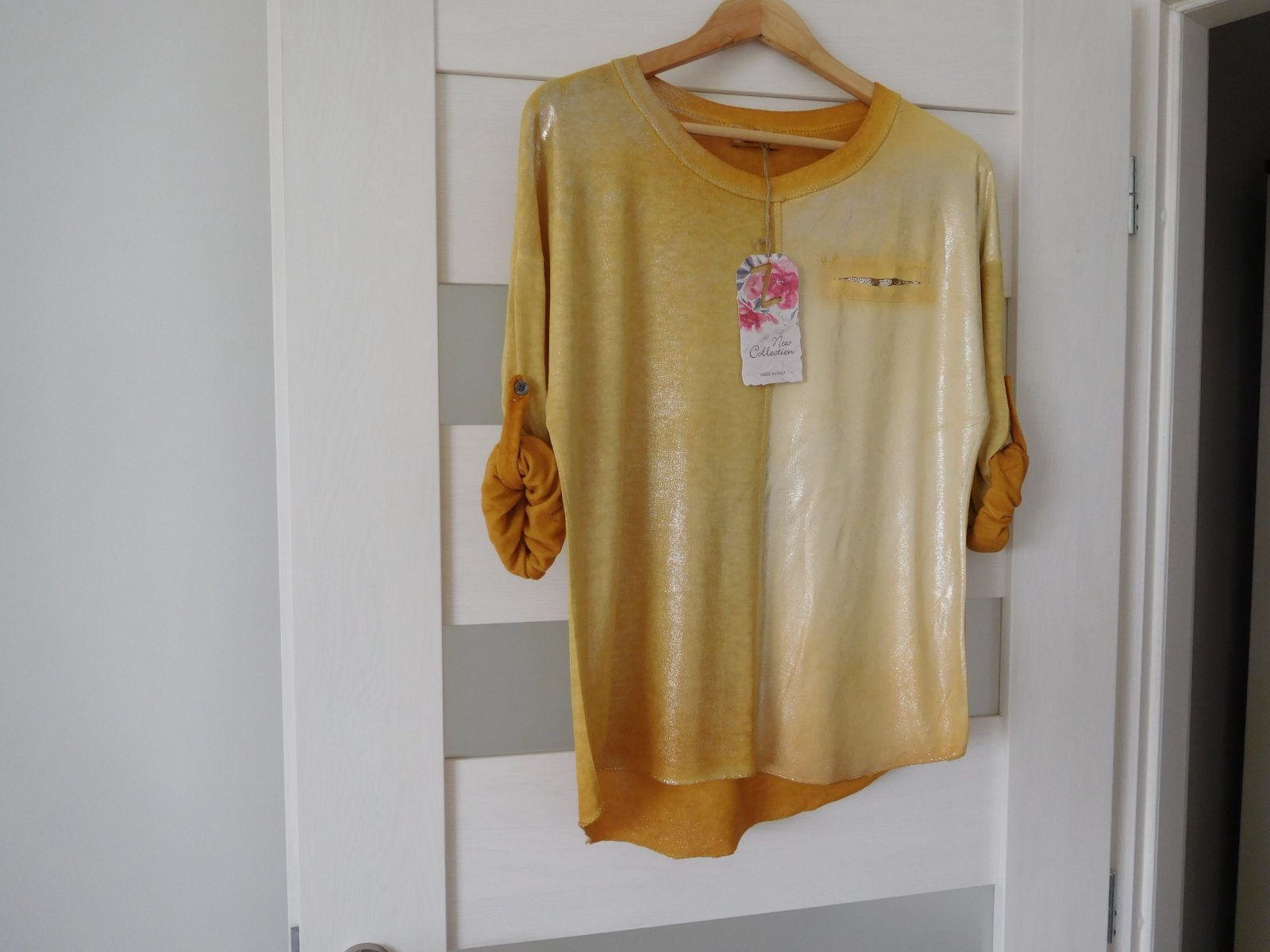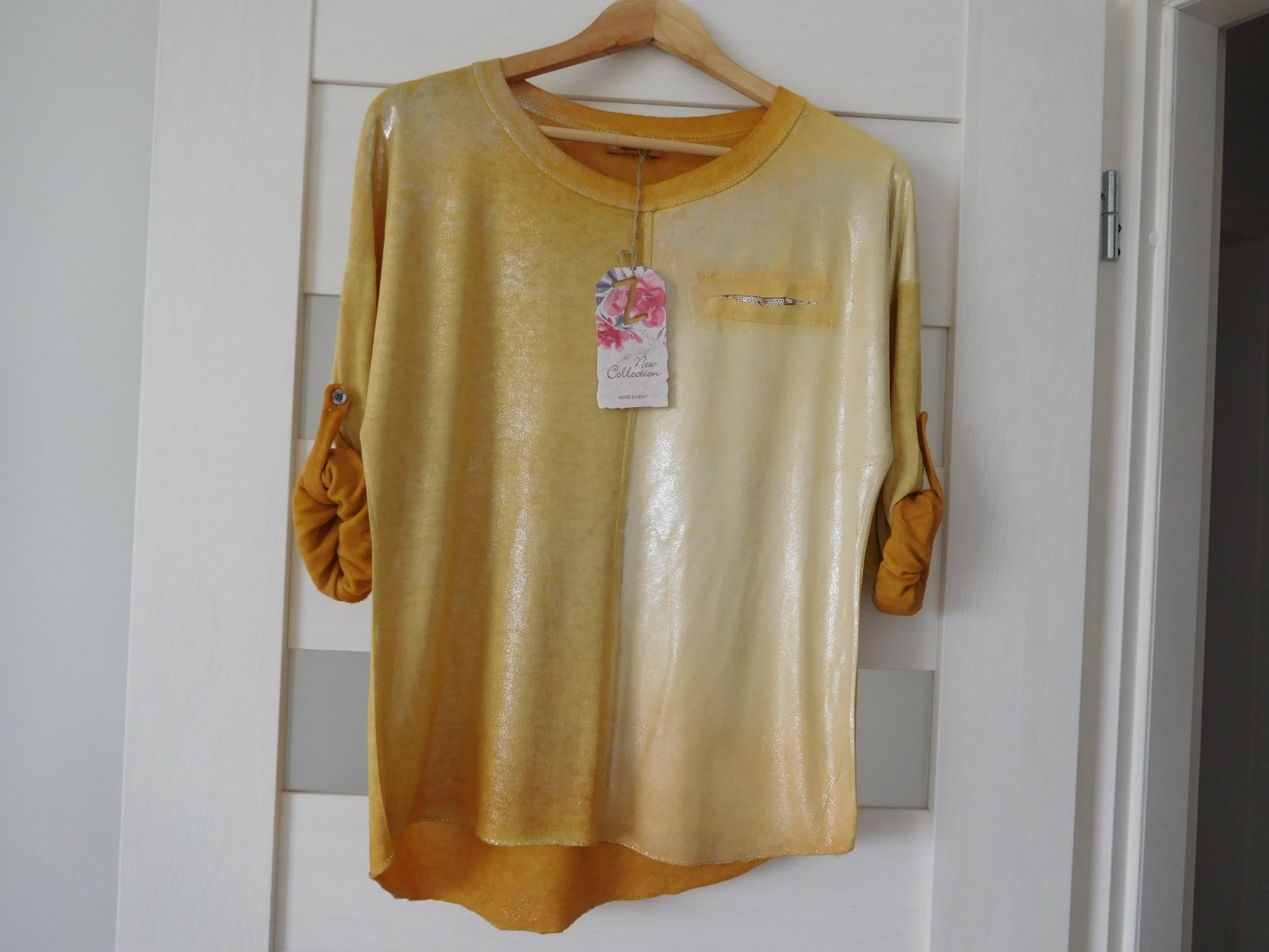 Ponúkam na predaj tričko z padavého materiálu s dlhým rukávom,ktorý sa dá ale zapnutím gombíku upraviť na 3/4 vý, viď foto.
