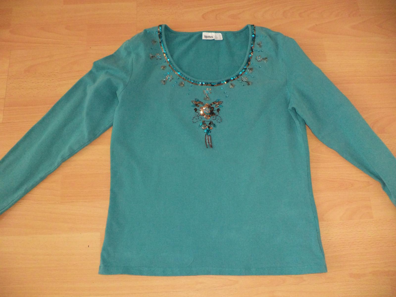 Predam pekne damske tričko s aplikaciou okolo vystrihu,dlhy rukav ,nove nenosene prijemny material dlžka 59cm dlžka rukava 57cm ,obvod hrude 96cm (pôvodna cena 45eur)