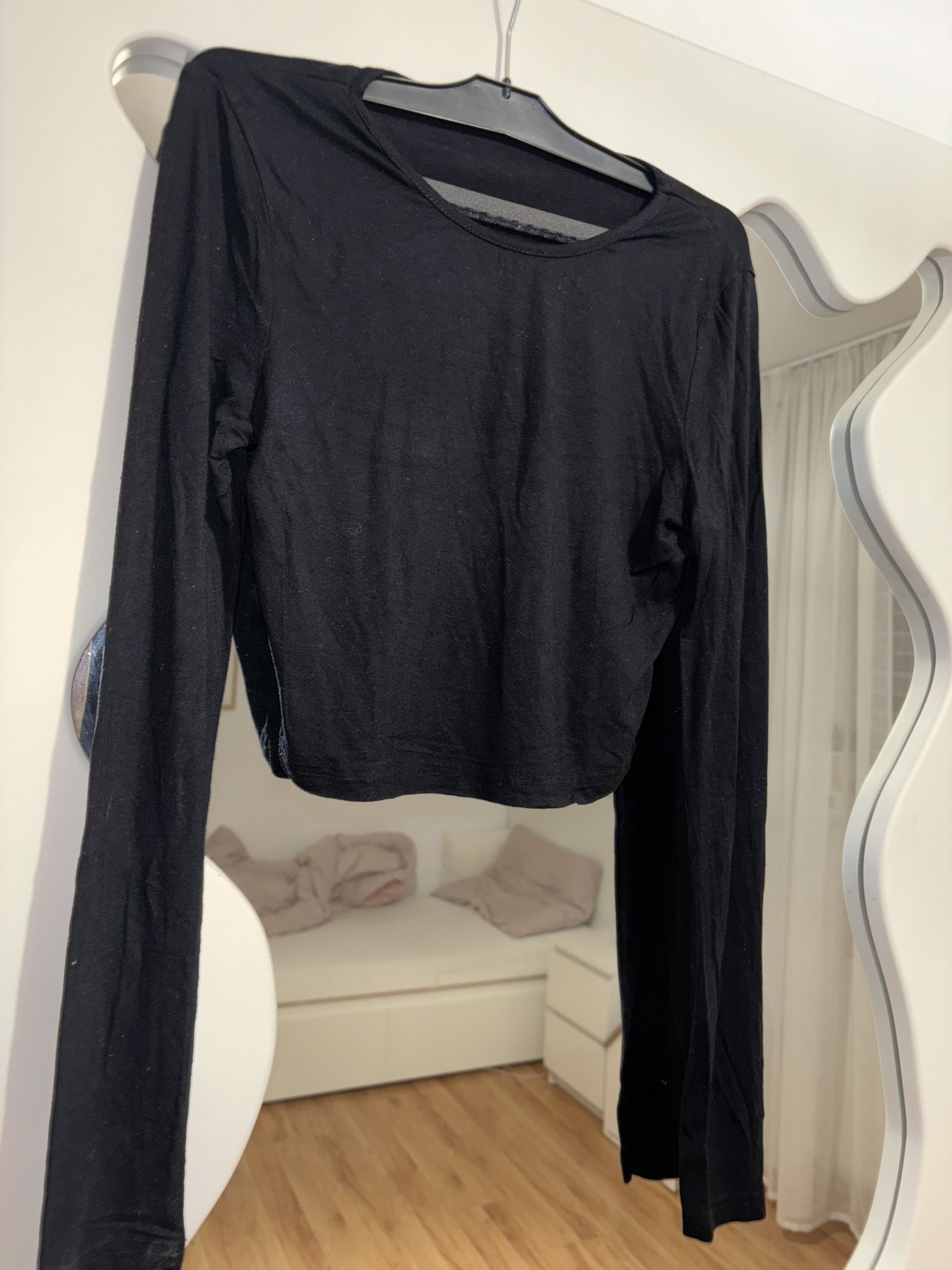 Raz oblečené, crop dĺžka, pružný, čierny, odstrihnute štítky, sedí na S, šírka pod pazuchami 43 cm, dĺžka 40 cm