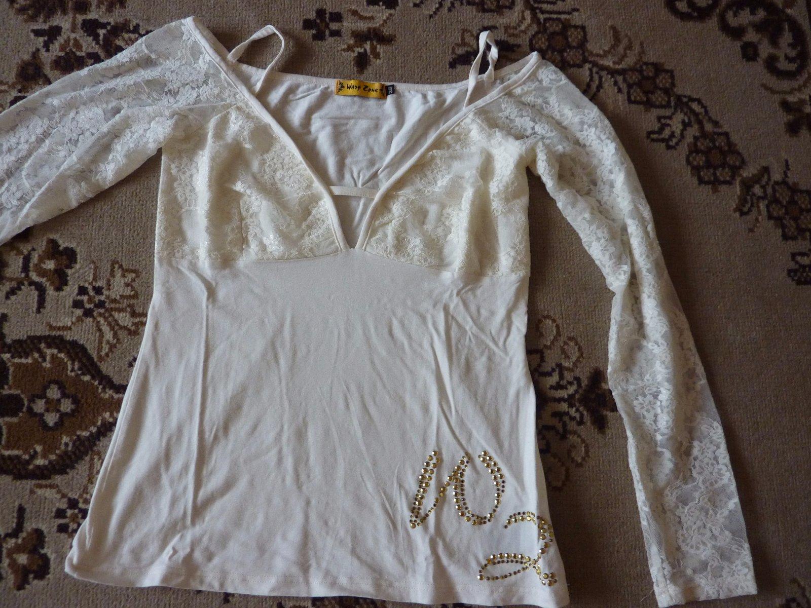 Ma cipkovane rukavy, mate v nom hole plecia a vidiet pekne vystrich. je kremovej farby. bolo oblecene 1x na oslave. cipka je prijemna mekka nepicha. Znacka Warp Zone.