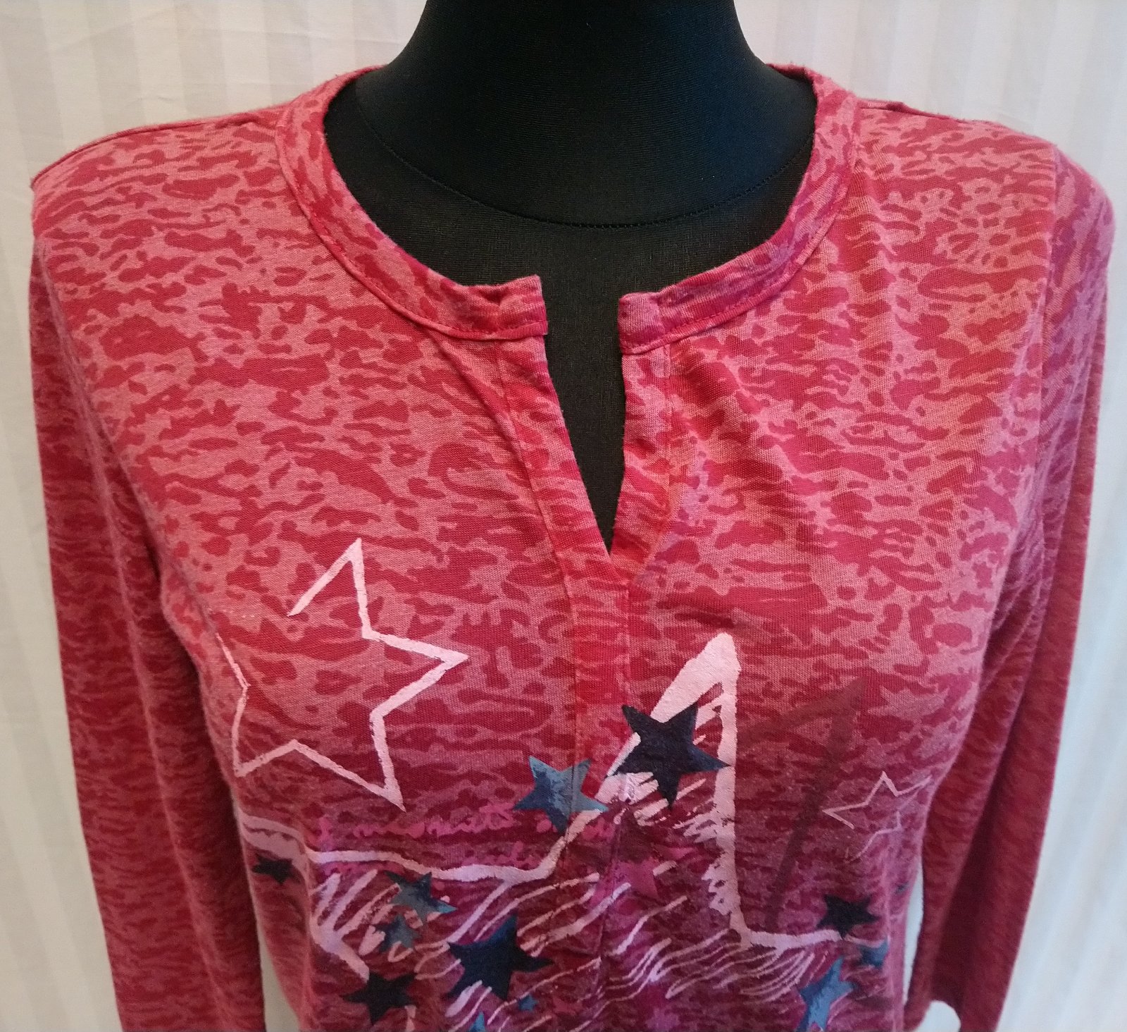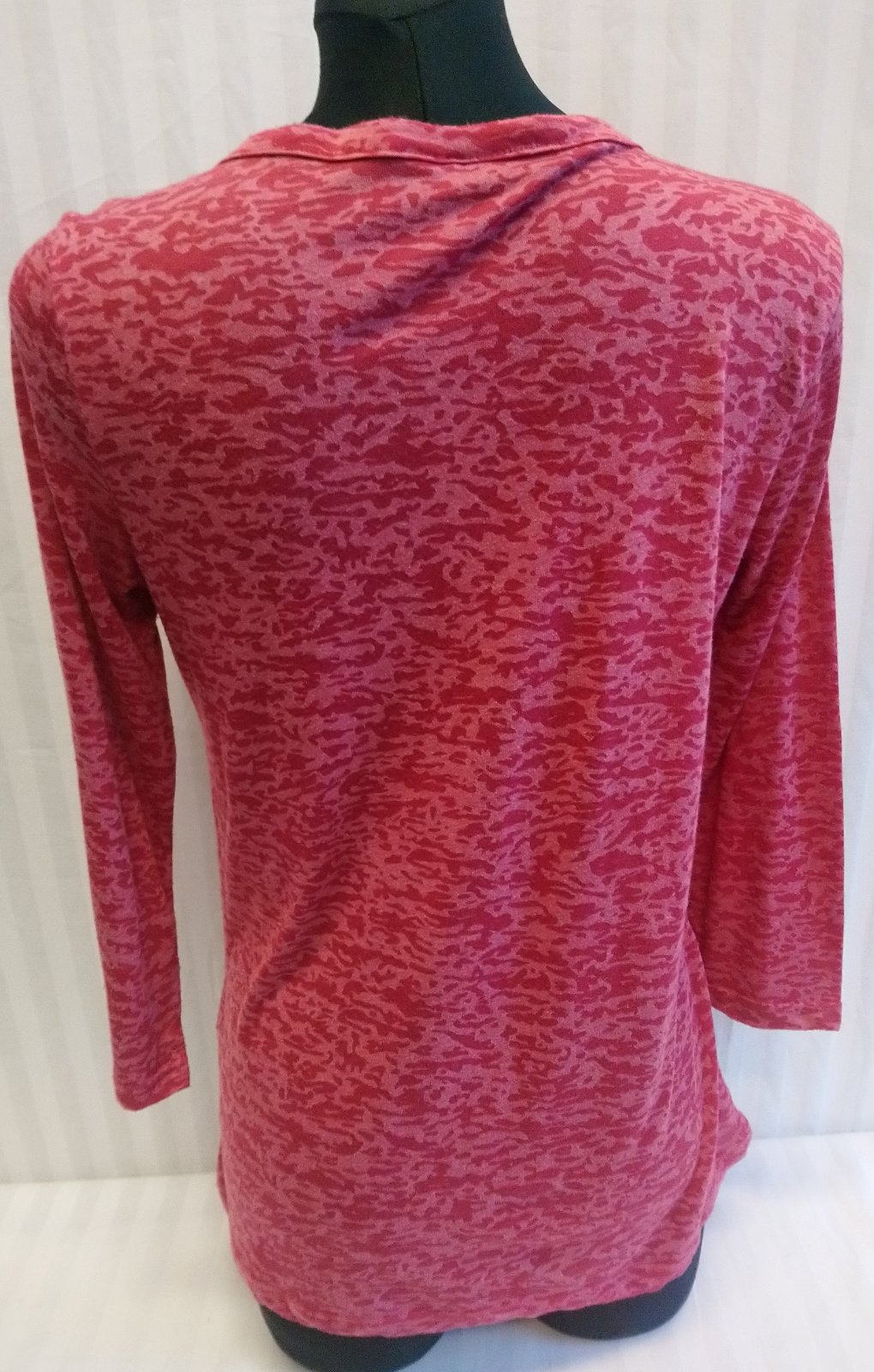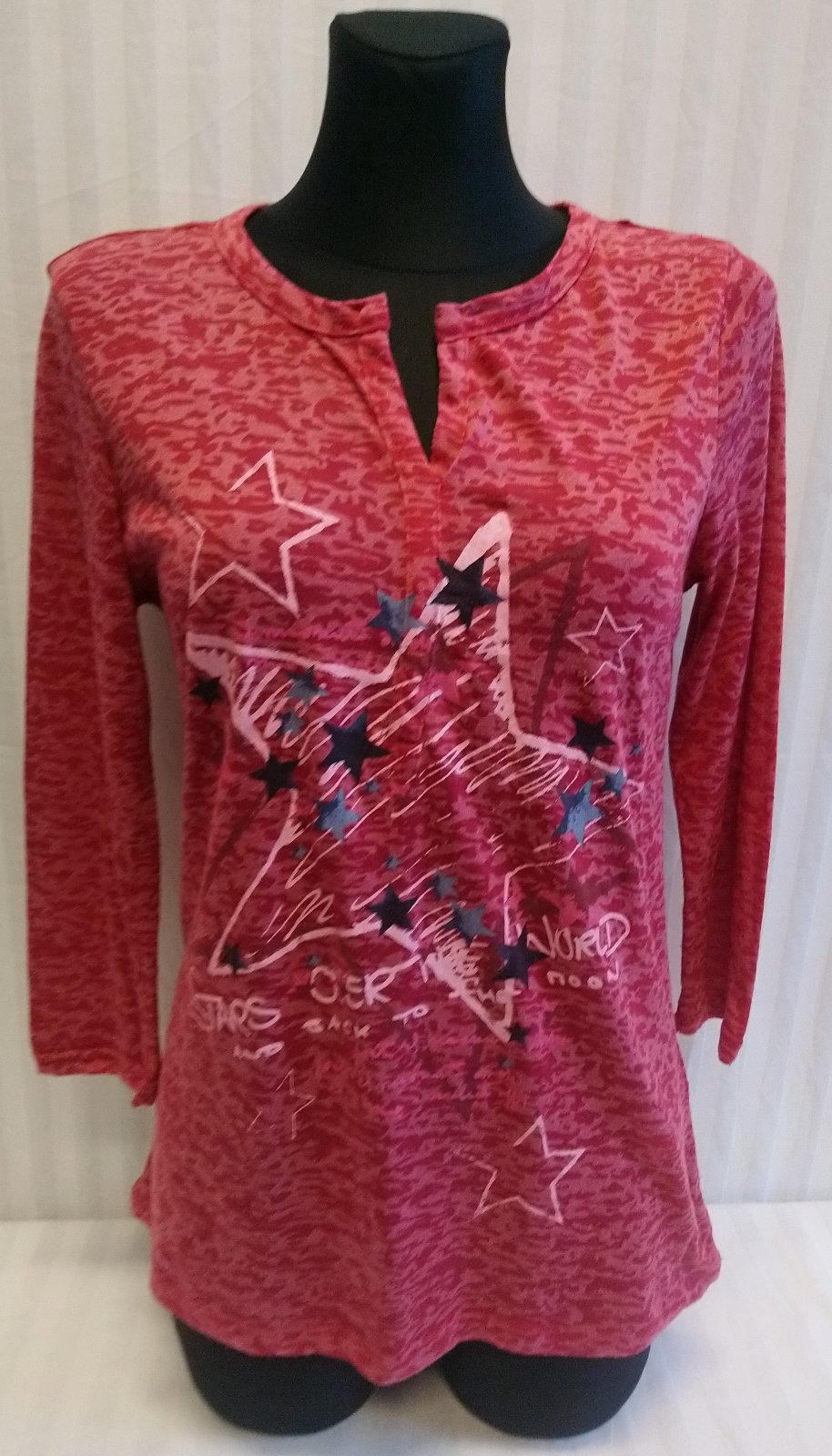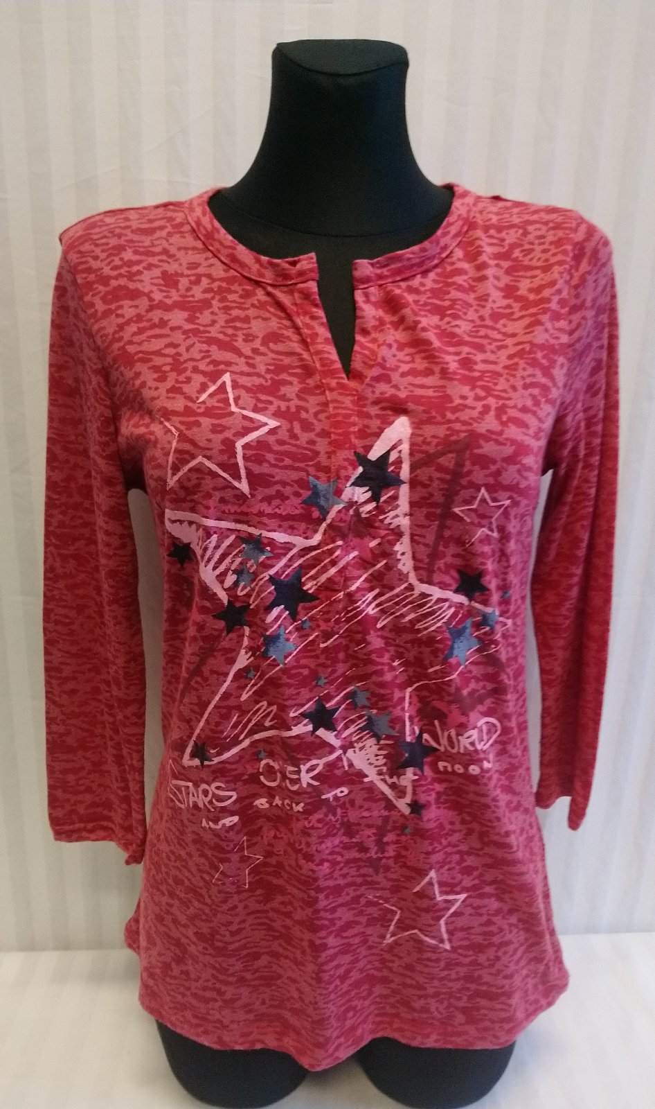 dámsky bordovo ružový top s motívom, 3/4 rukáv, mierne presvitá,