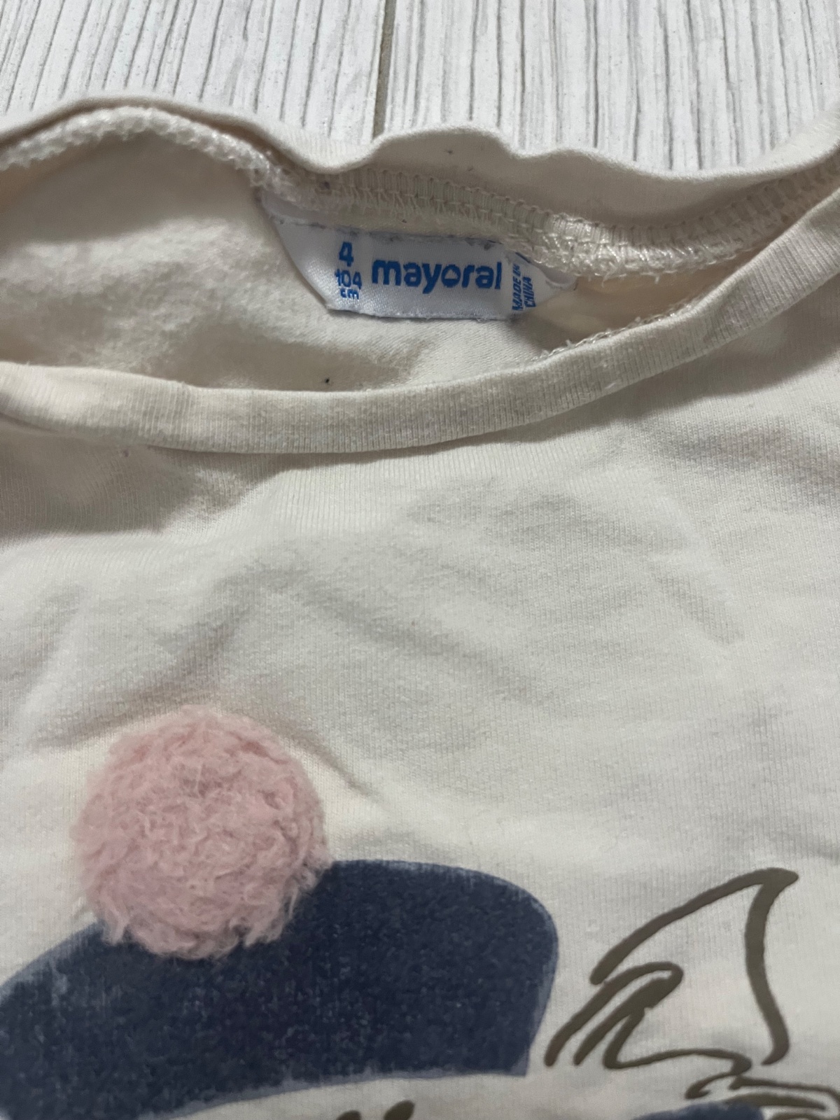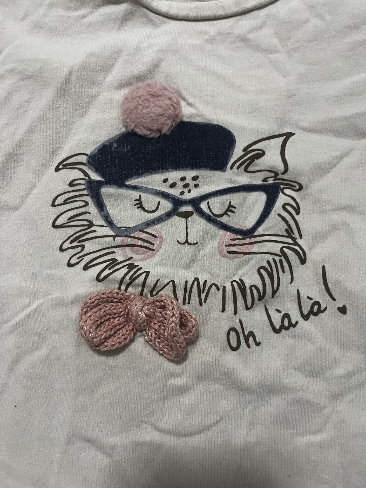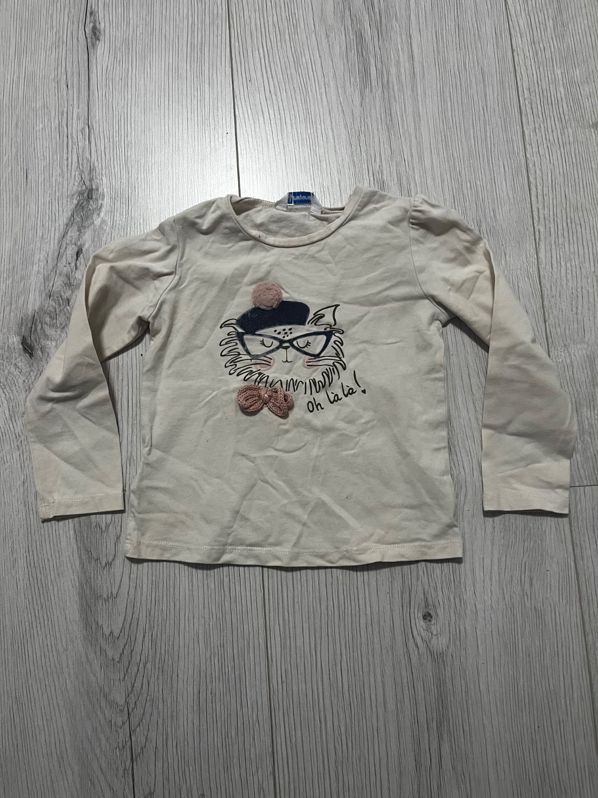 Predám krémový dlhorukávový top s obrázkom mačičky značky Mayoral, veľkosť: 104. Plyš na okuliaroch je na niektorých miestach mierne ošúchaný, ale pôsobí to prirodzene.