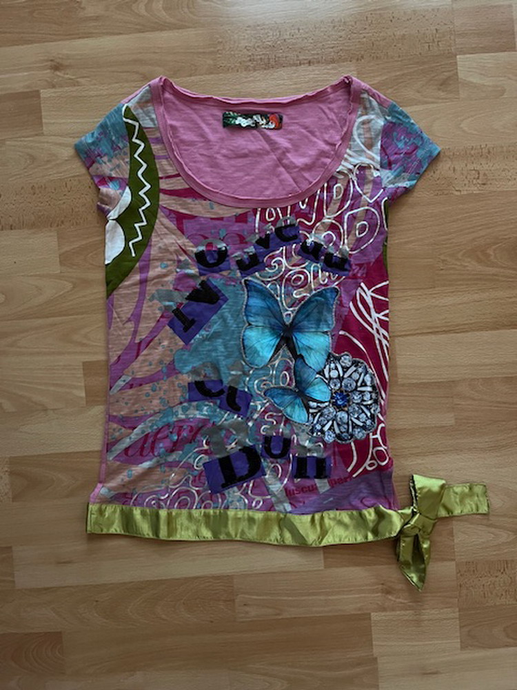 Elegantné tričko s potlačou (čierne flitre) značky Desigual vo veľkosti XS s krátkymi rukávmi, má okrúhly výstrih a šnúrku v páse, materiál: 55% bavlna, 45% viskóza