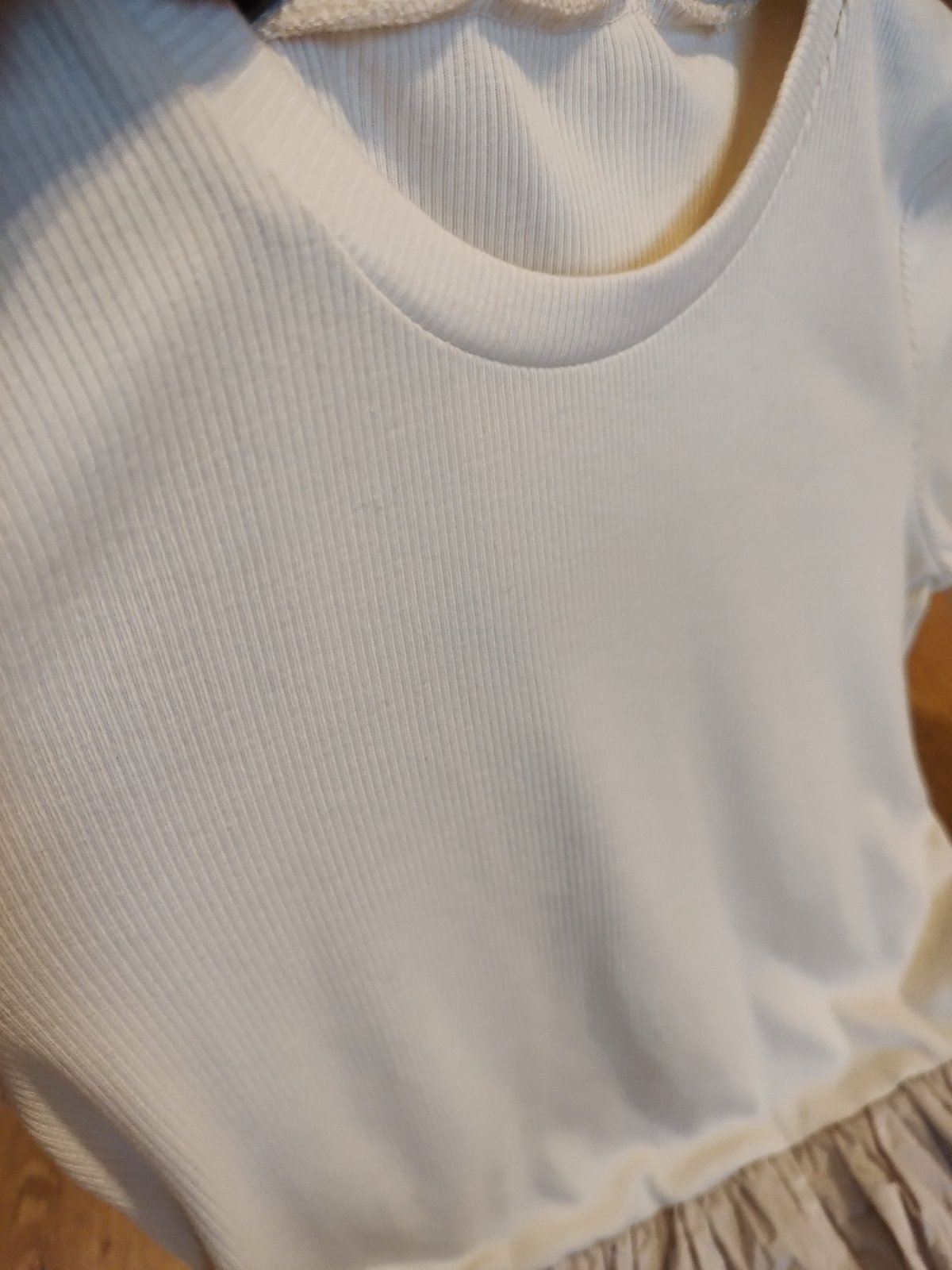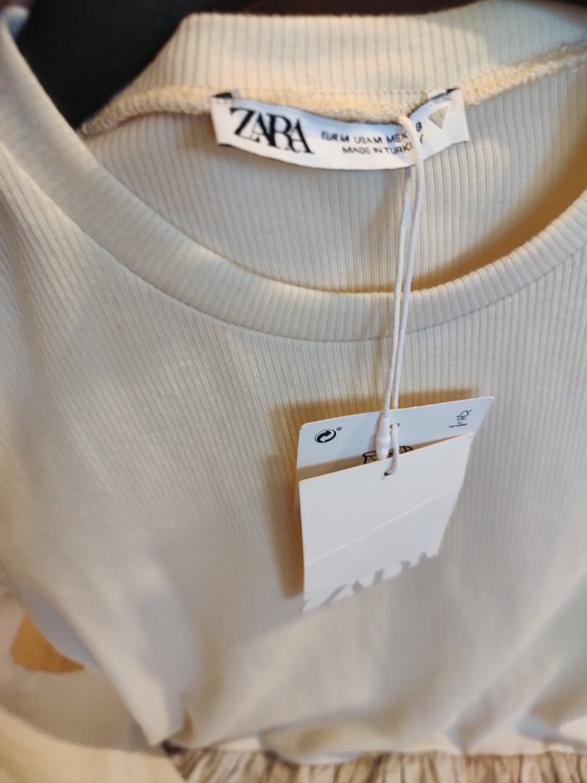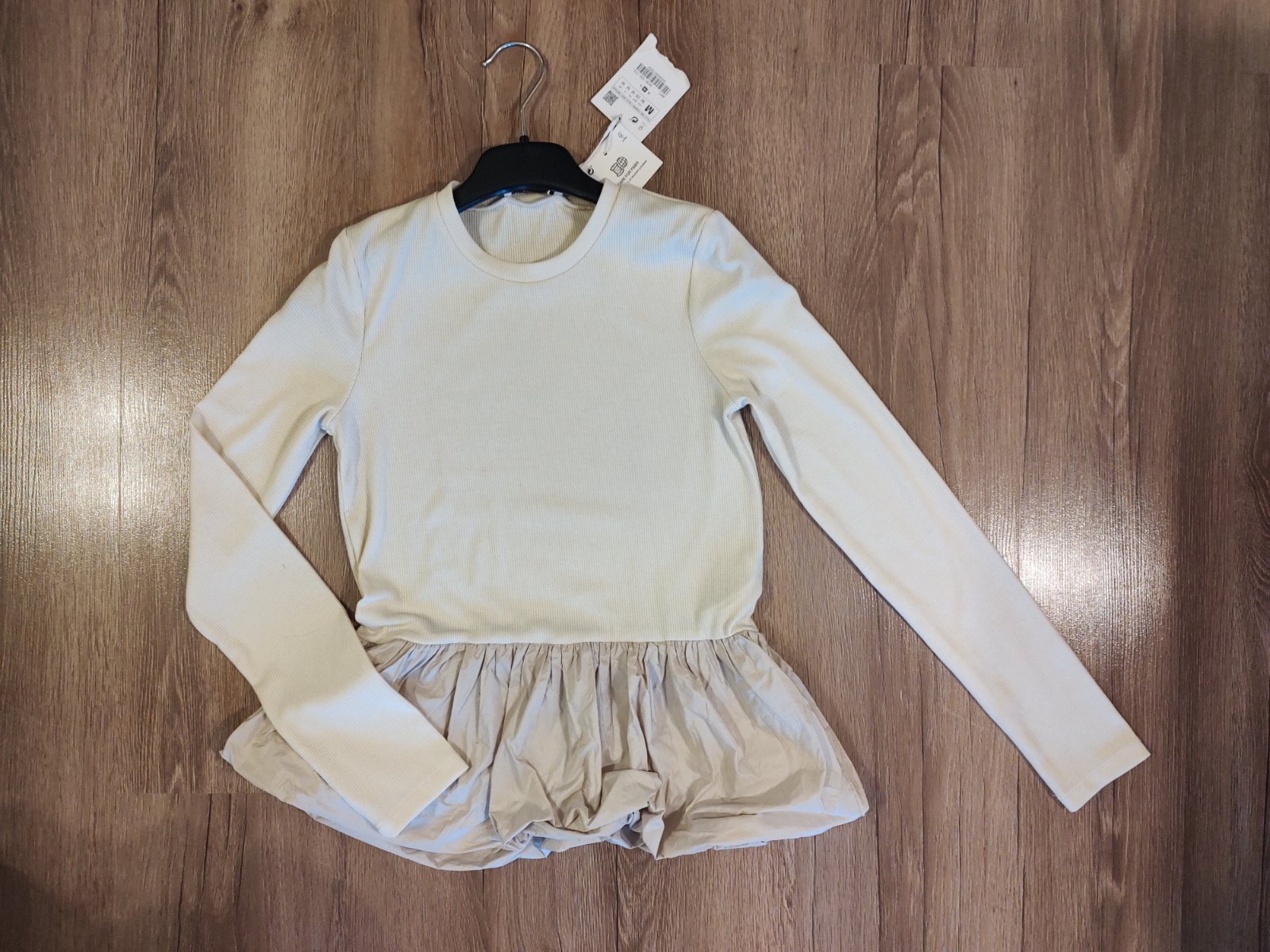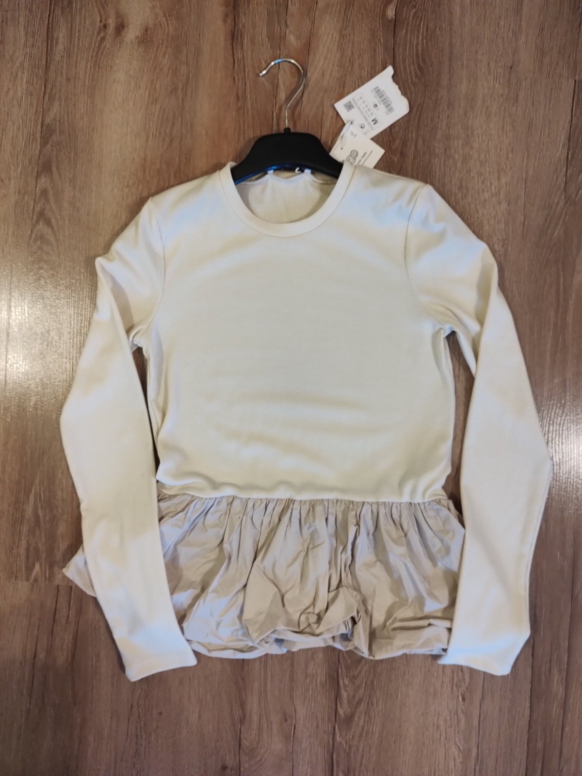 Nové tričko s dlhým rukávom, s visačkou, so zaujímavým nariasením v dolnej časti. Veľkosť uvedená na štítku je M. Podľa mňa však sedí skôr na S, možno aj XS.