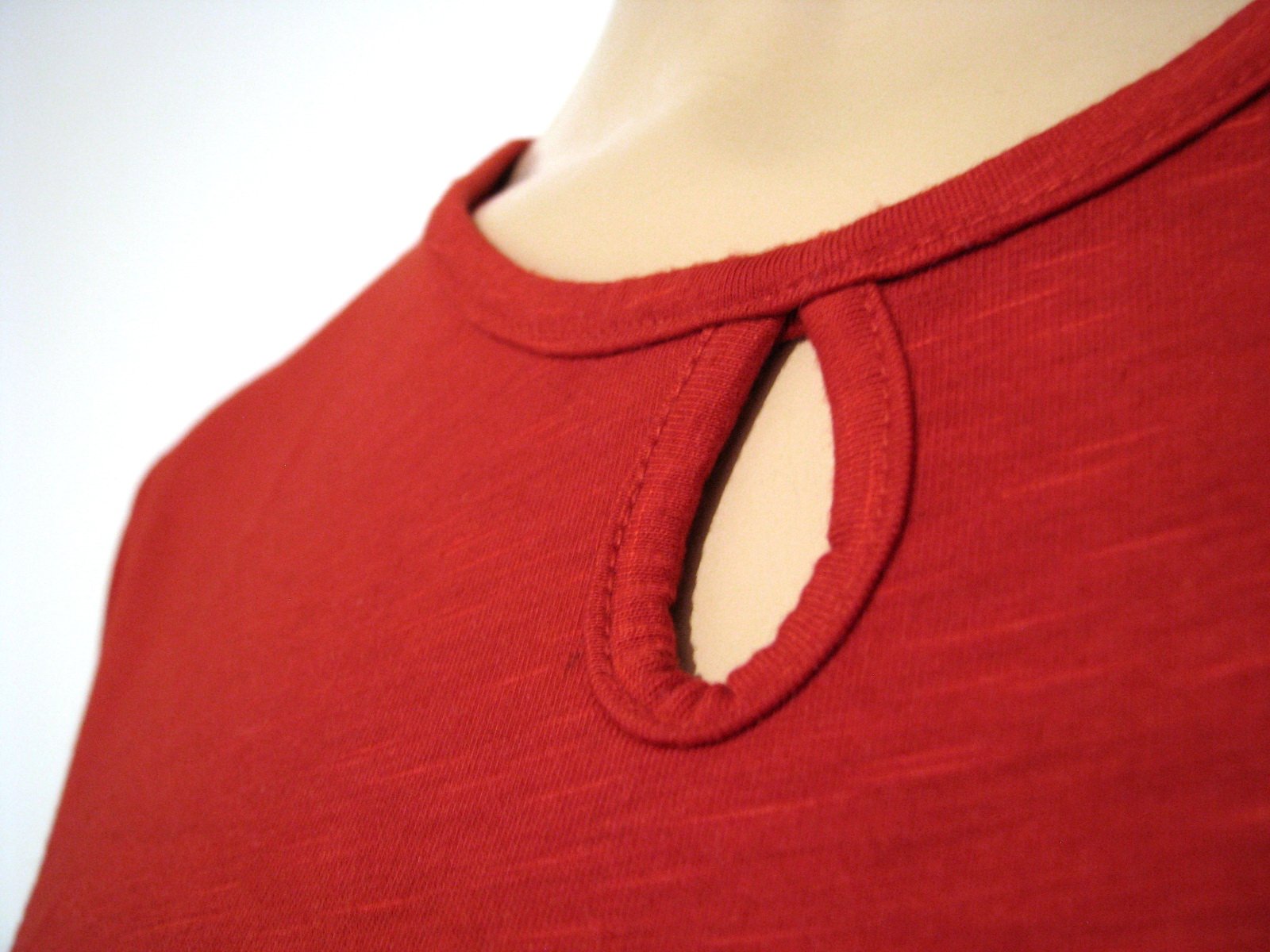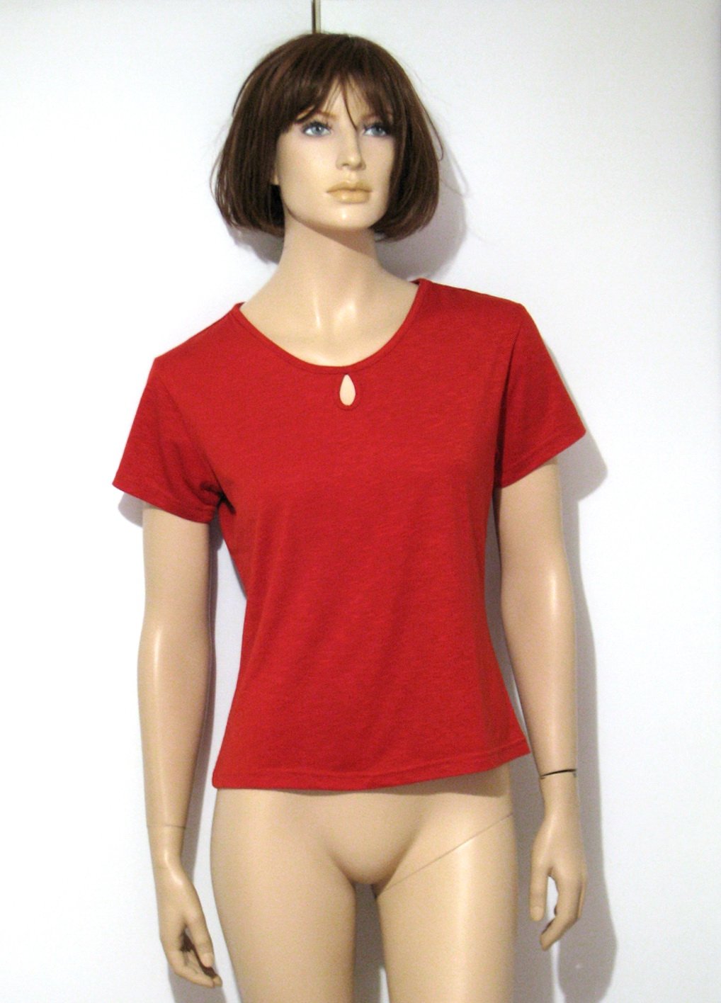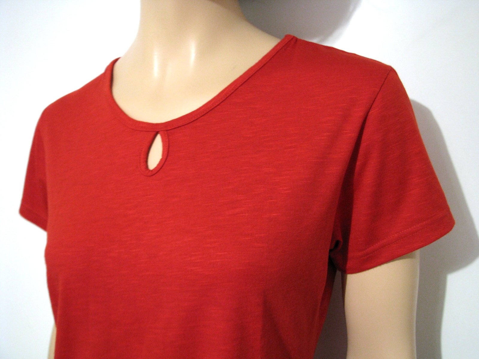 Sýto červené tričko so slzičkou vo výstrihu. Pri slzičke je bohužiaľ malý tmavý fliačik, viď. detailná fotka. Dalo by sa to zakryť napr. obšitím korálkami či flitrami, keby sa s tým niekomu chcelo pohrať. Štítok s materiálovým zložením je odstrihnutý, no je to príjemný materiál a je elastické. Veľkosť píše L, pokojne aj pre M. V prípade záujmu premeriam.