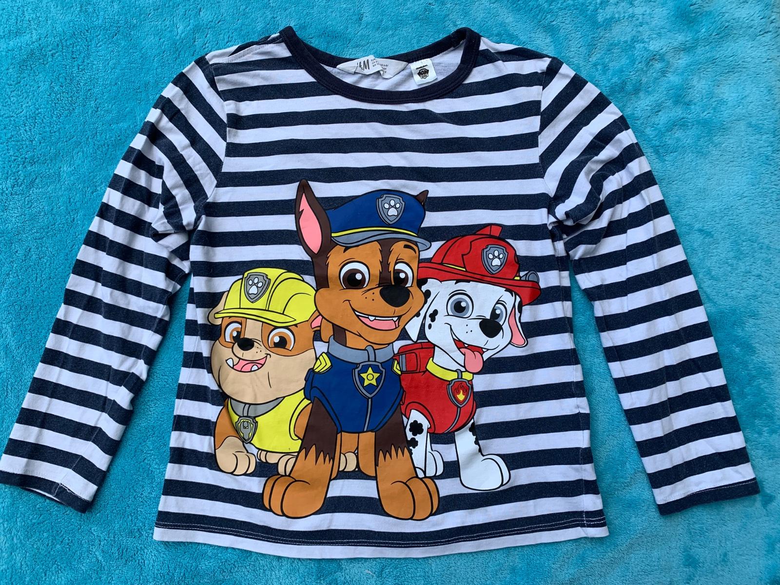 Tričko labkova patrola, viac nosené, na rukáve je malý oranžový fliačik. Šírka 35cm, dĺžka 45cm, rukáv 43cm.