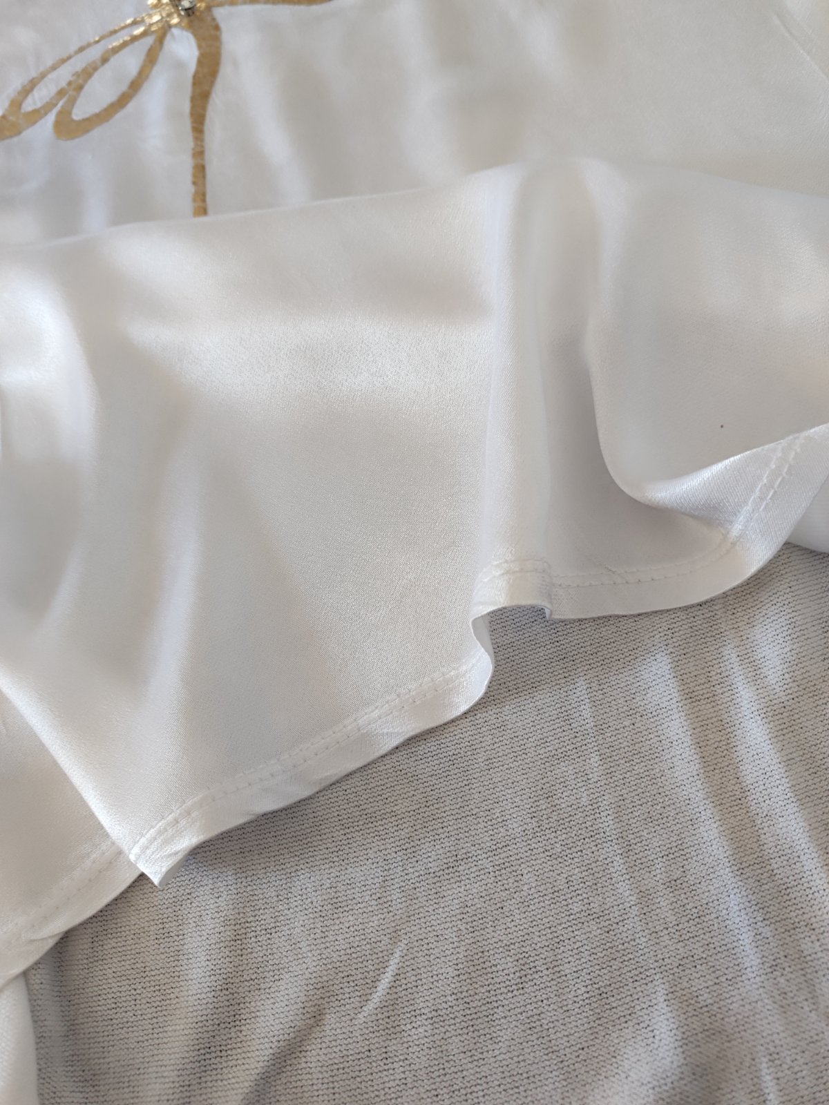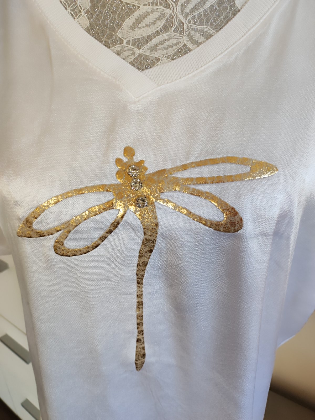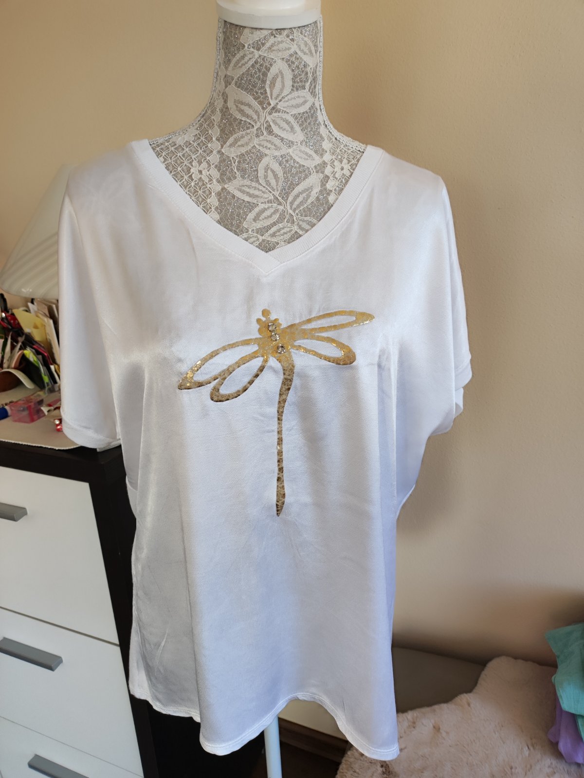 Dámske tričko s krátkym rukávom úzkeho strihu. Zlatá potlač je lesklá. Elastické. Materiál: 90%bavlna,10%elastan. Veľkosť UNI (vhodná pre S,M, menšie L). Krajina pôvodu: Taliansko. ROZMERY: celkov...