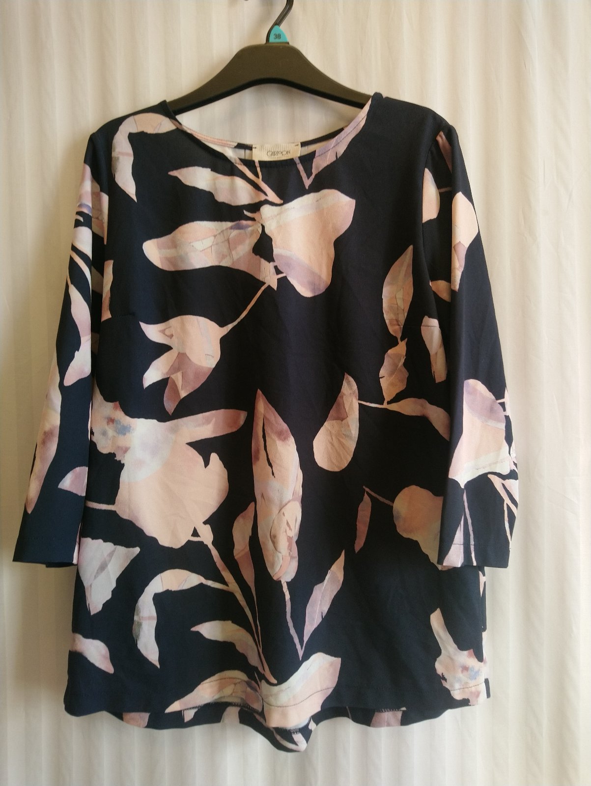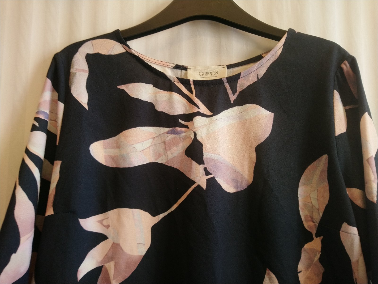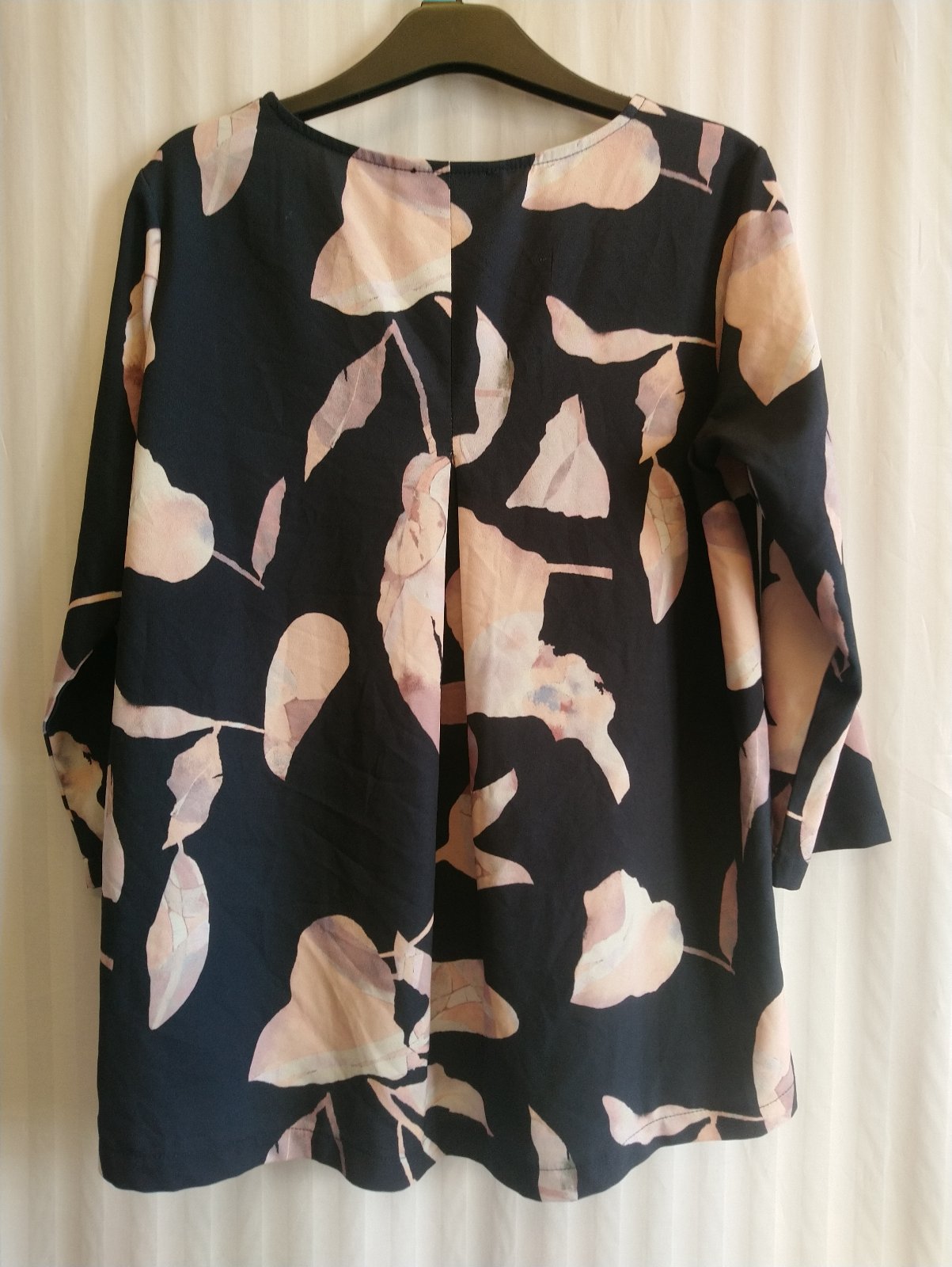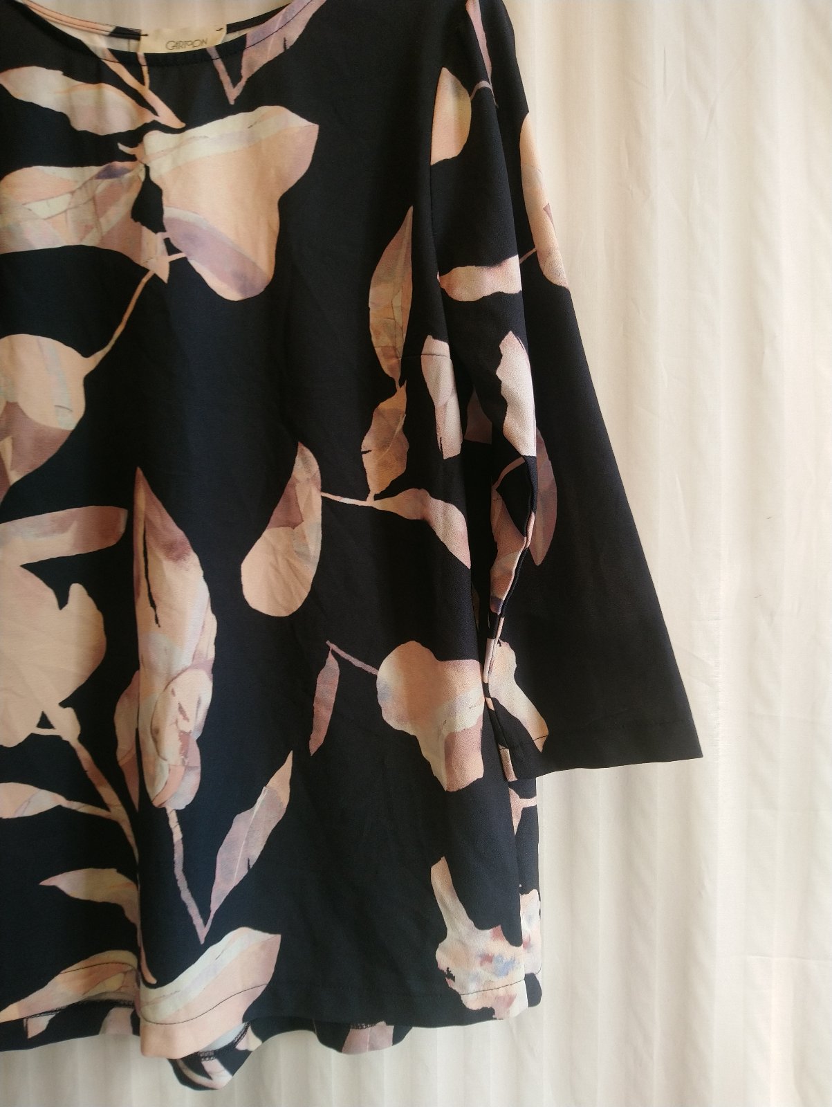 dámsky čierny top s farebným vzorom, 3/4 rukáv, mierne sa rozširuje,