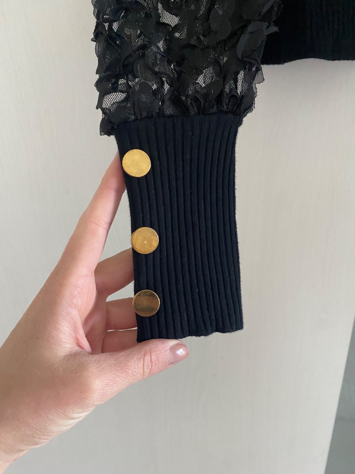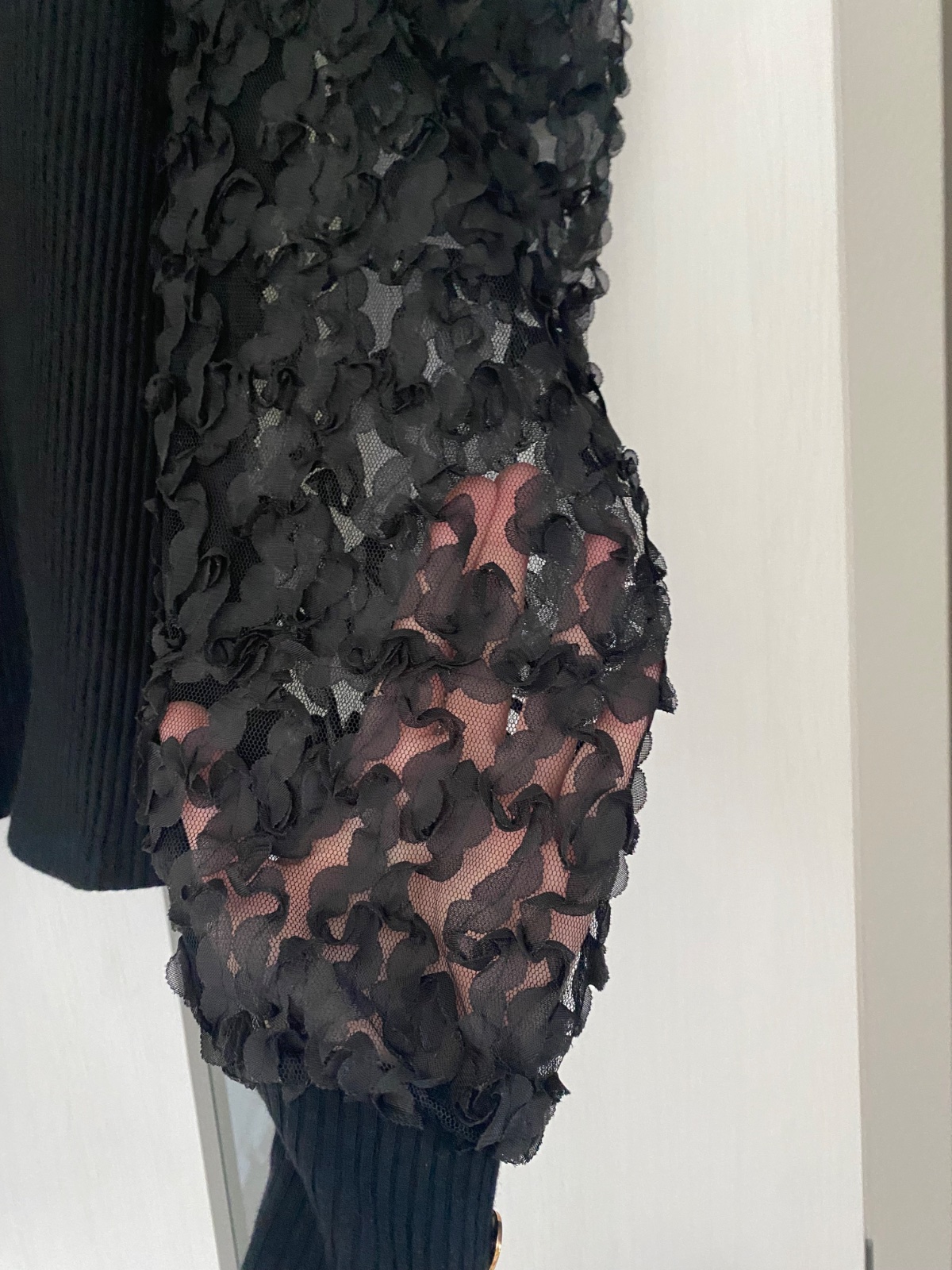 Posuniem nádherne body len oprane jeden rukáv je celý na druhom je krajka ktorá vedie od krku Sedi na s,M