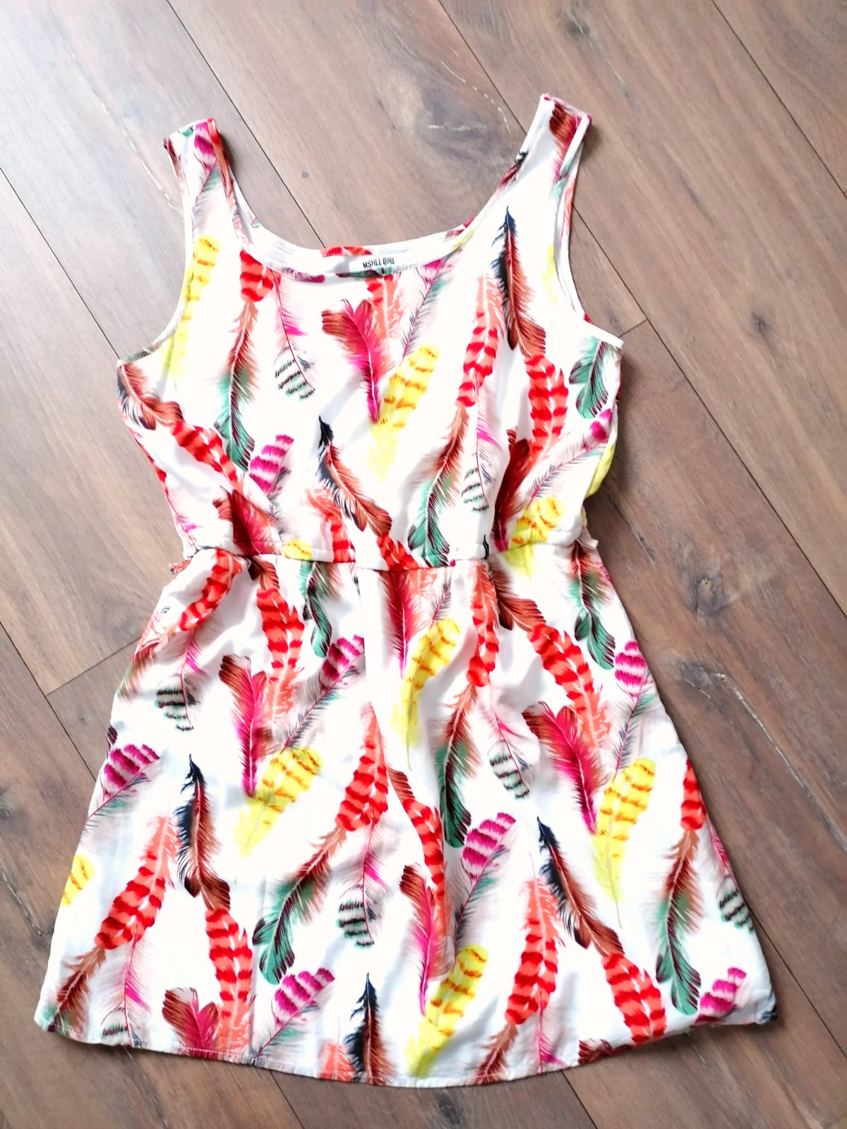 Pekná letná tunika, má pútka na opasok ale ja som nosila svoj od začiatku a neviem nájsť pôvodný. Odporúčam ale určite s opaskom, hnedý tenký pekne k nej ukáže :) Motív pierok na bezovom podklade. Celá podsita ešte jednou latkou, nepresvita. Bola viac nosená ale stále pekná. Dĺžka 78 cm, šírka v prsiach 44 cm.