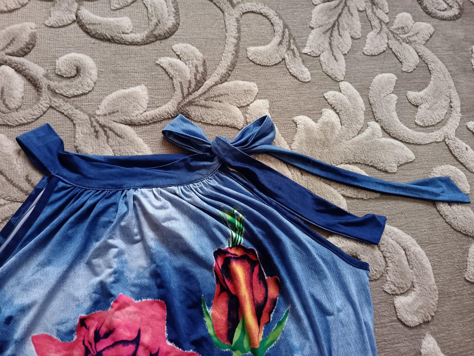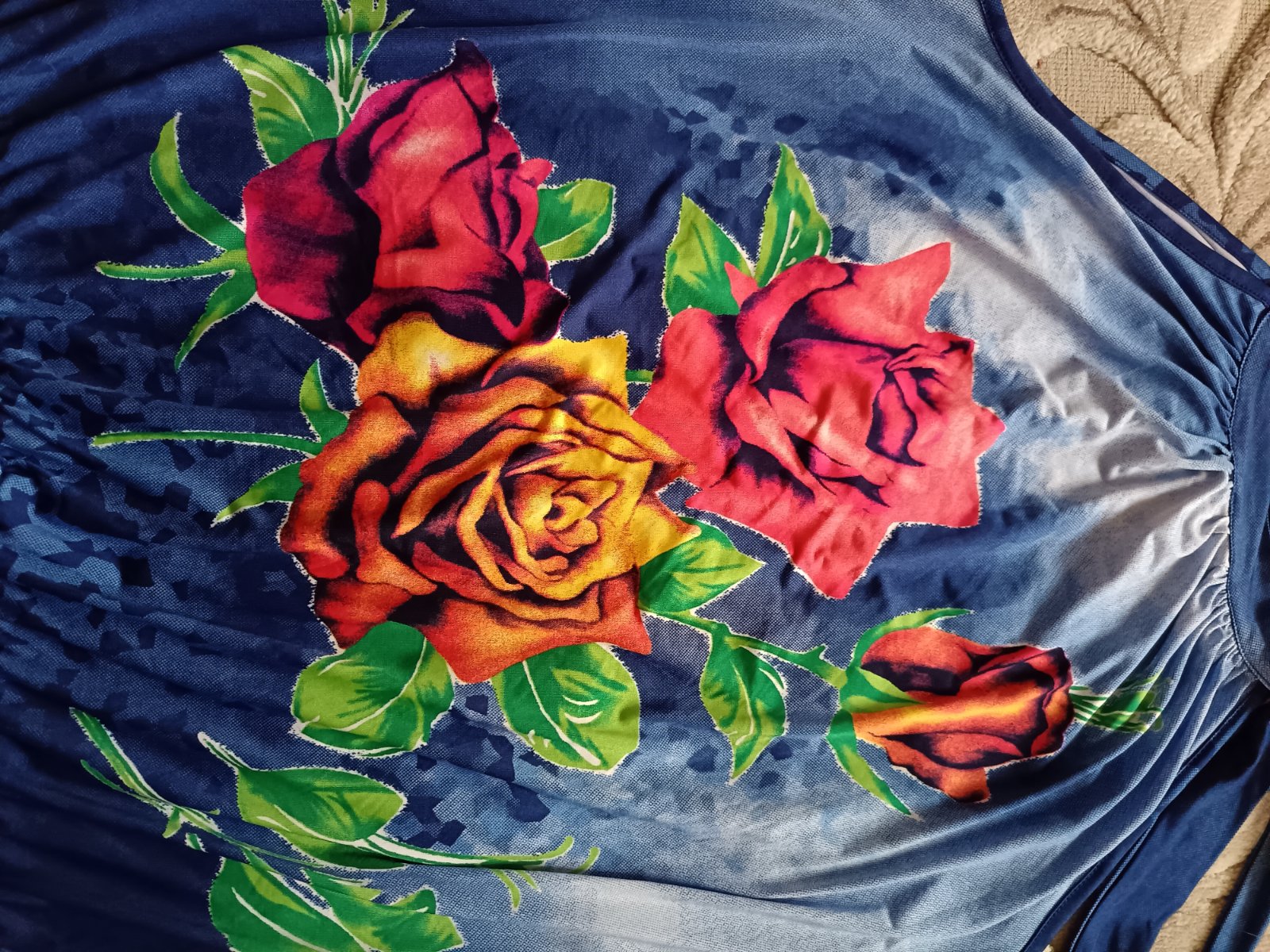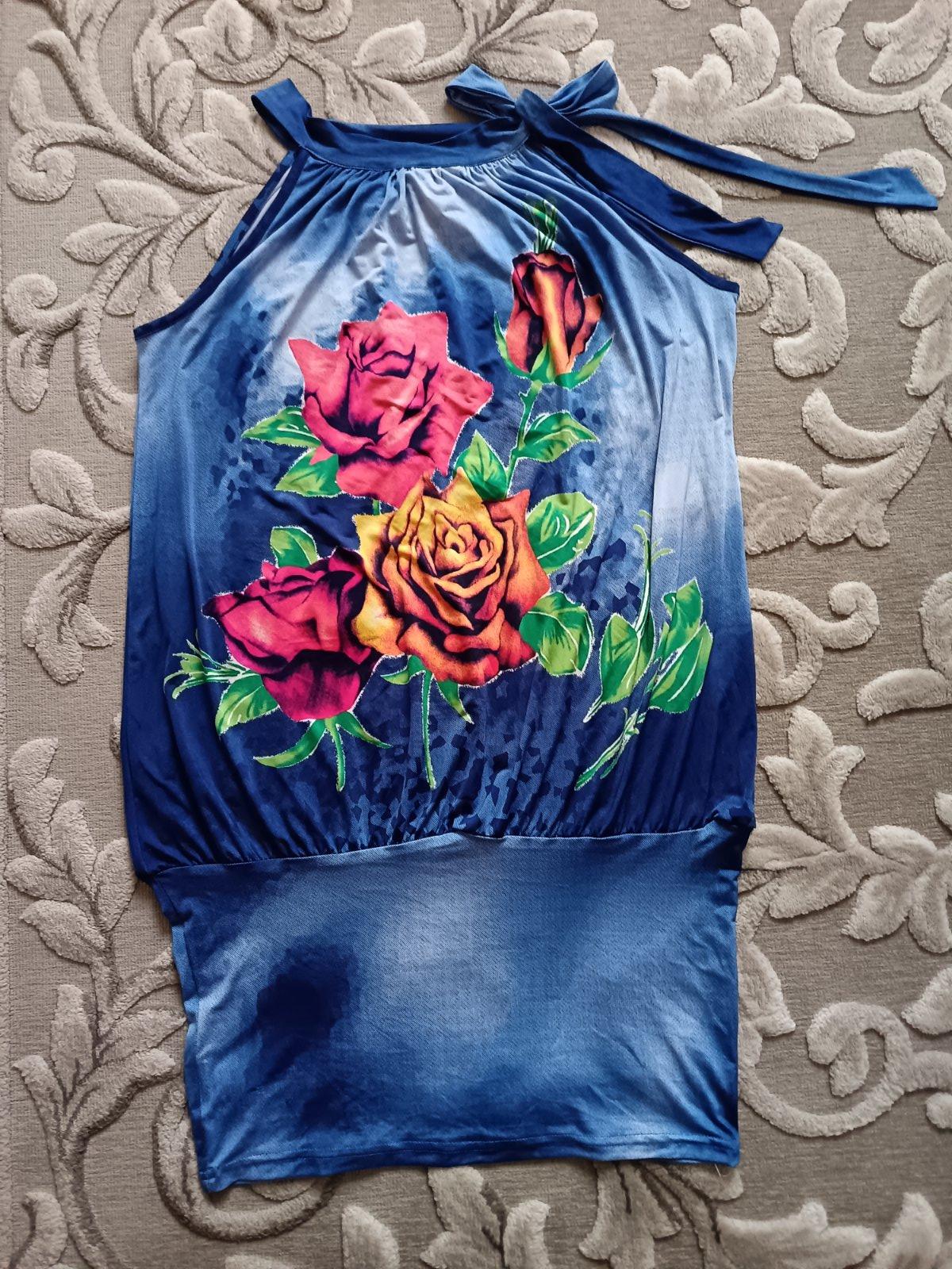 Predám dámske alebo dievčenské tričko s ružami. Na krku je zaväzovanie na mašľu. Celková dĺžka je 83,5cm. Šírka hrudníka je 52,5cm. Šírka dolnej časti je 39,5cm