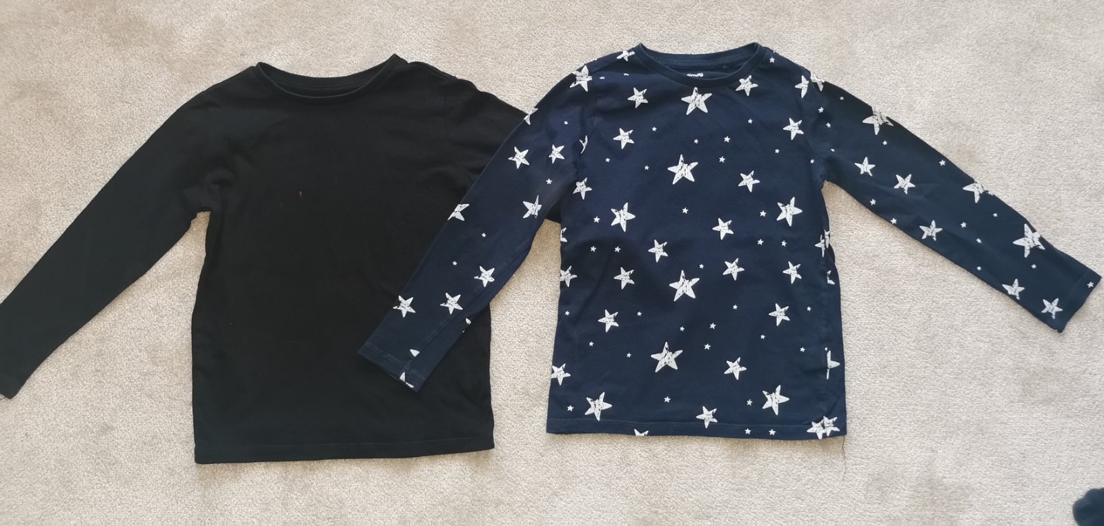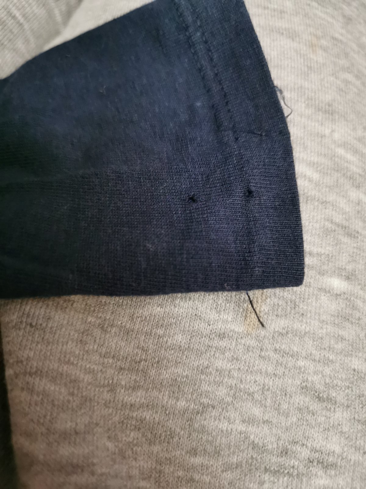 Nosený stav, jedno má fľak od farby a druhé na rukáve dierky.