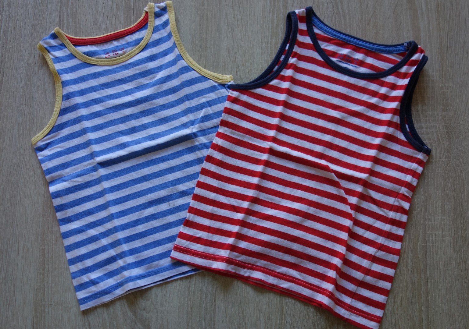 Pekné letné tielka. Nosené, na modrom vpredu malý fliačik, možno pôjde vyprať. Minižmolky na oboch.