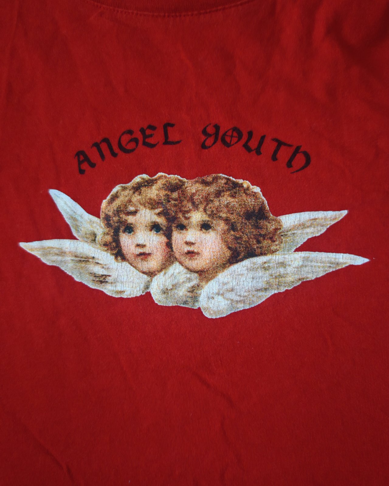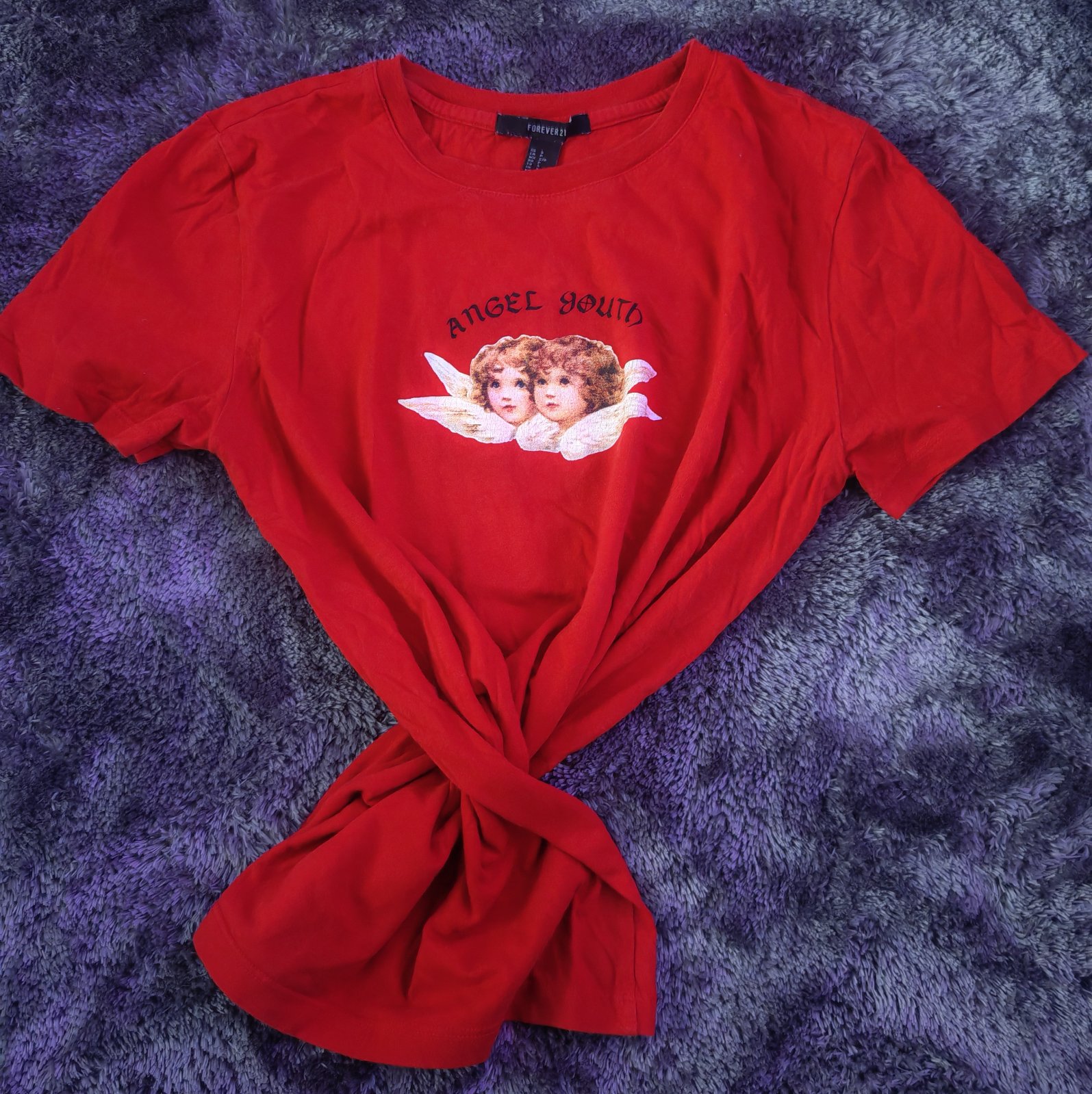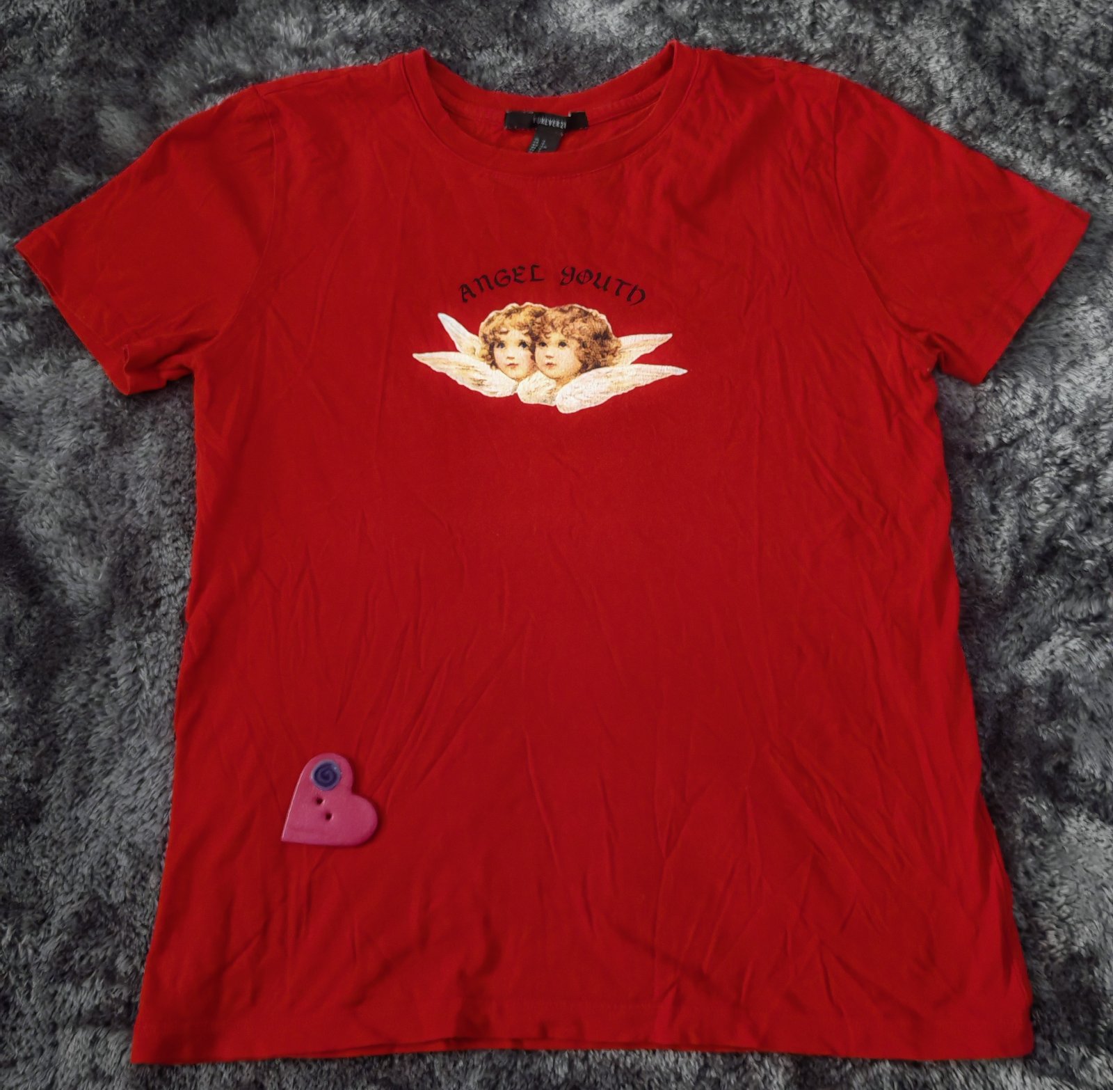 Červené tričko s obrázkom anjelov, nosené len dcérkou, pekne