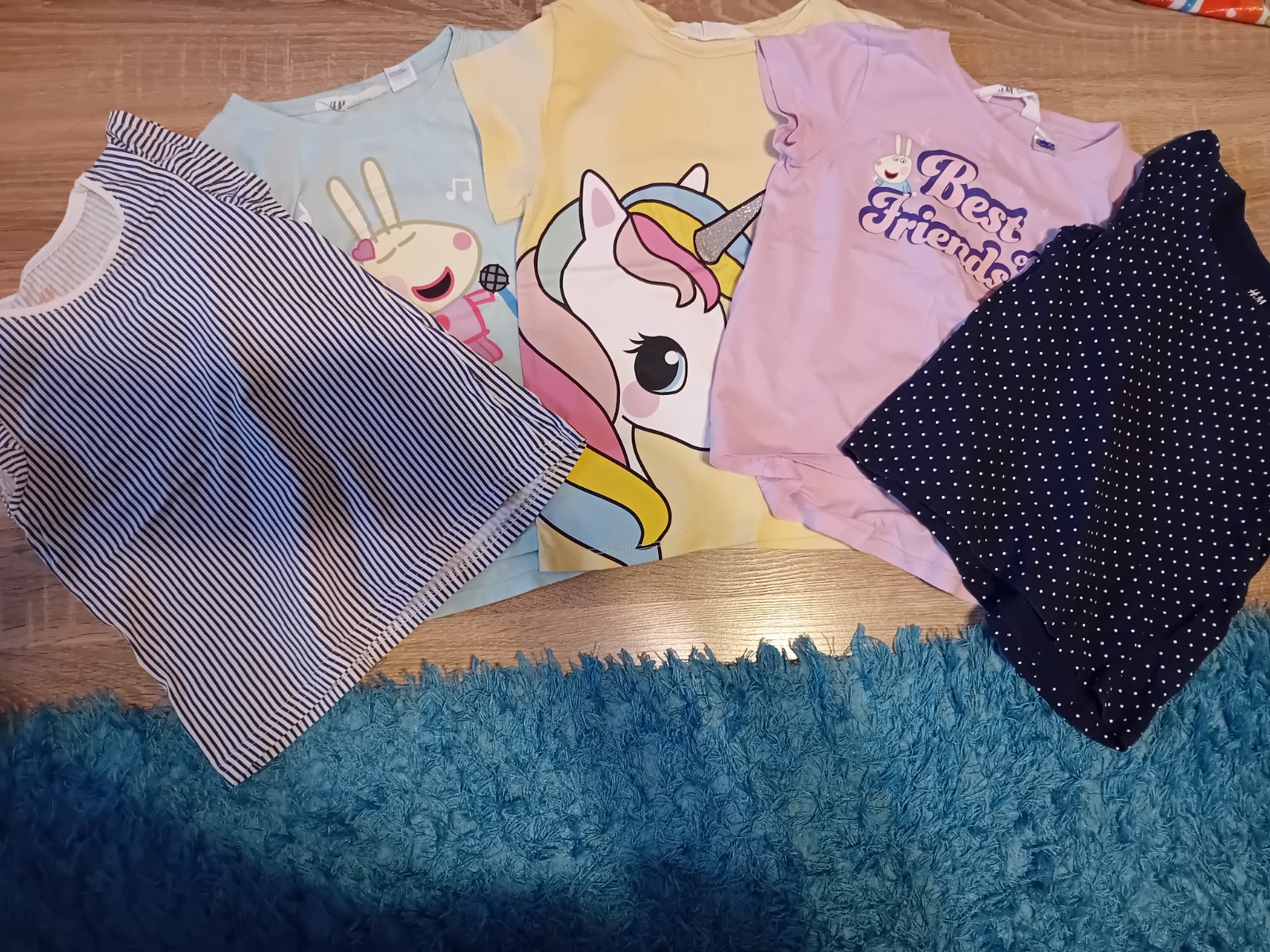 Predám 5 ks dievčenských letných tričiek značky H and M. Z toho 3 ks s krátkym rukávom a 2 ks bez rukávov. Veľkosť 110-116. Stav čisté a nepoškodené. Predávam všetky spolu.