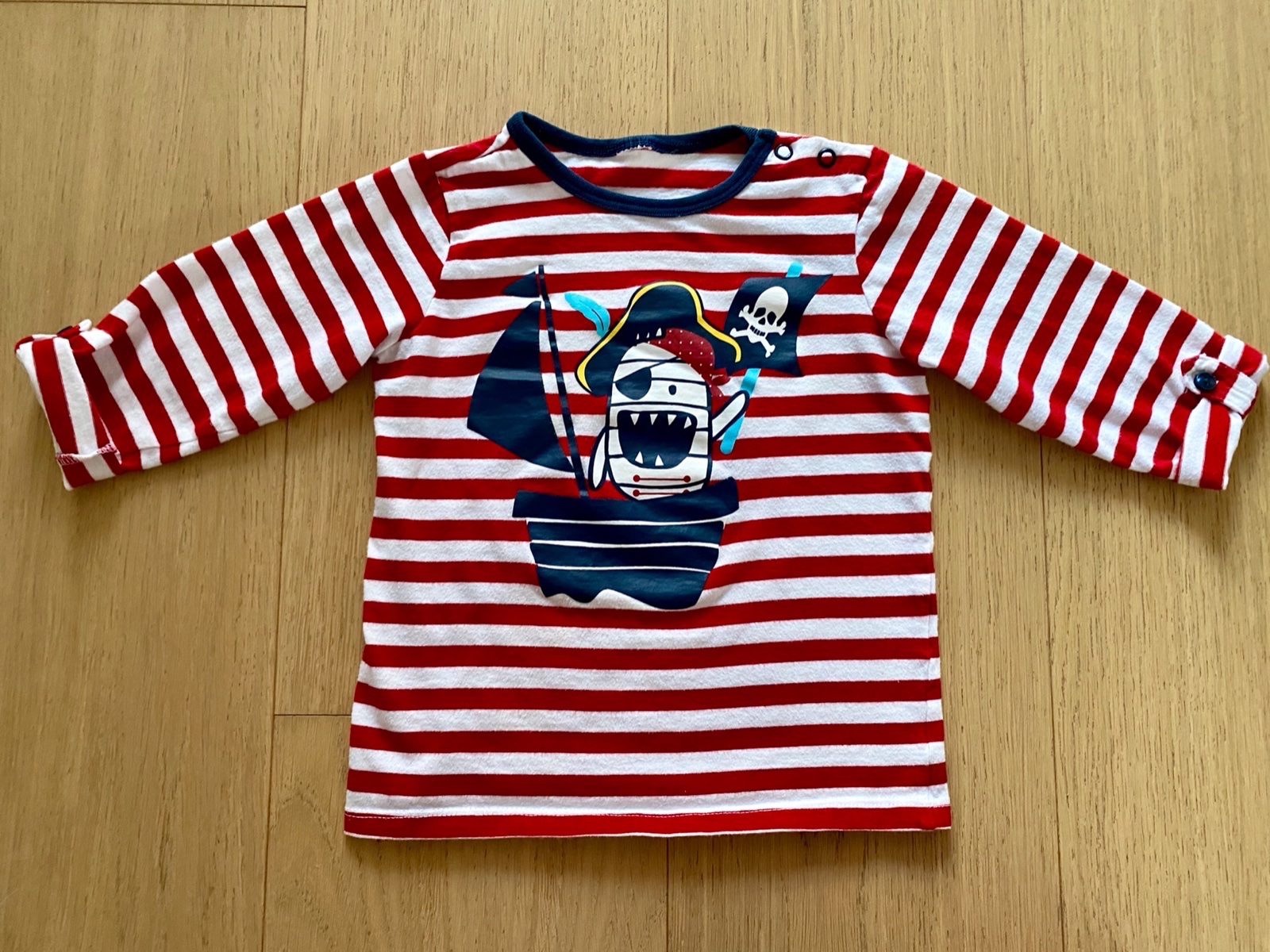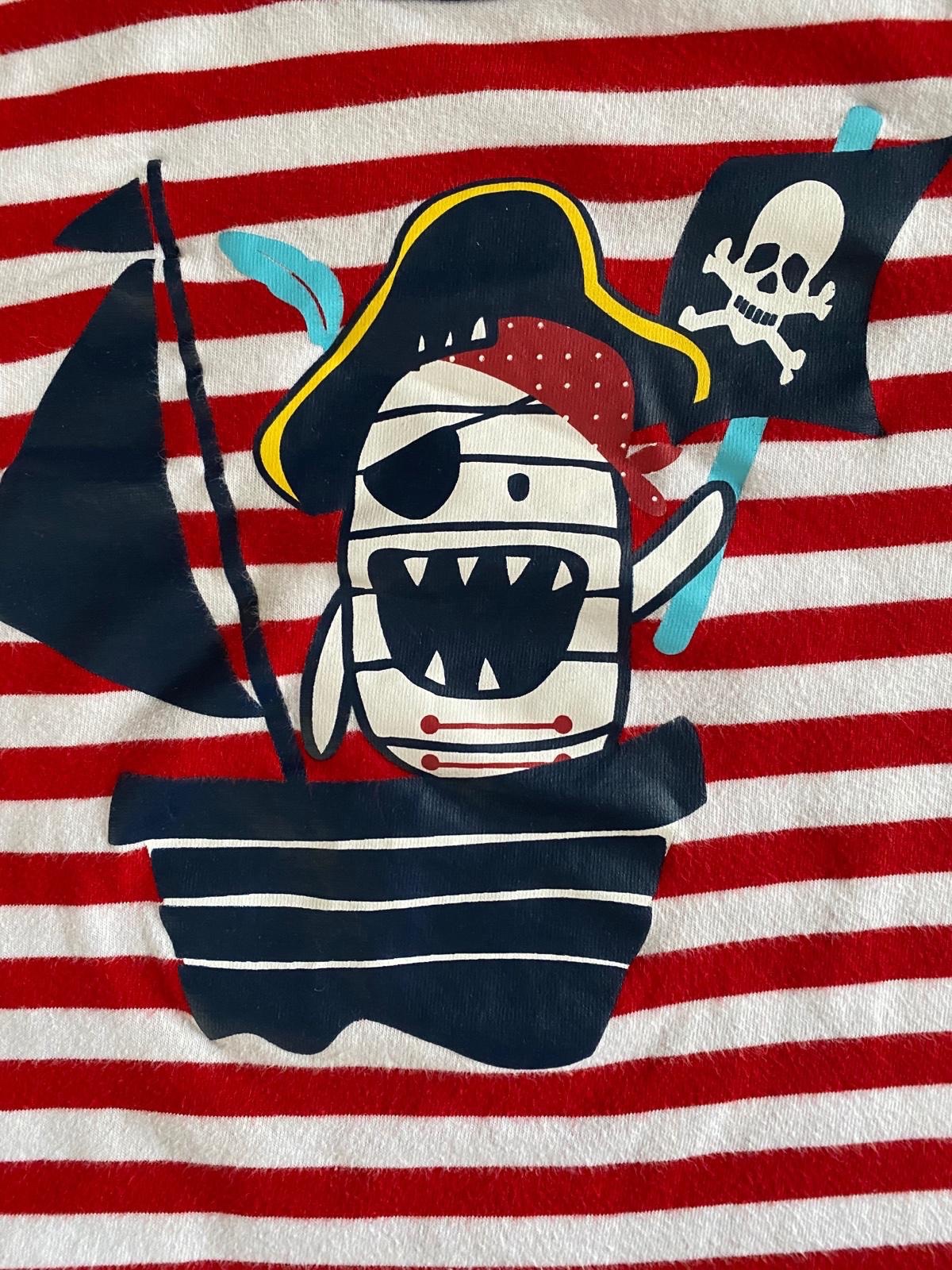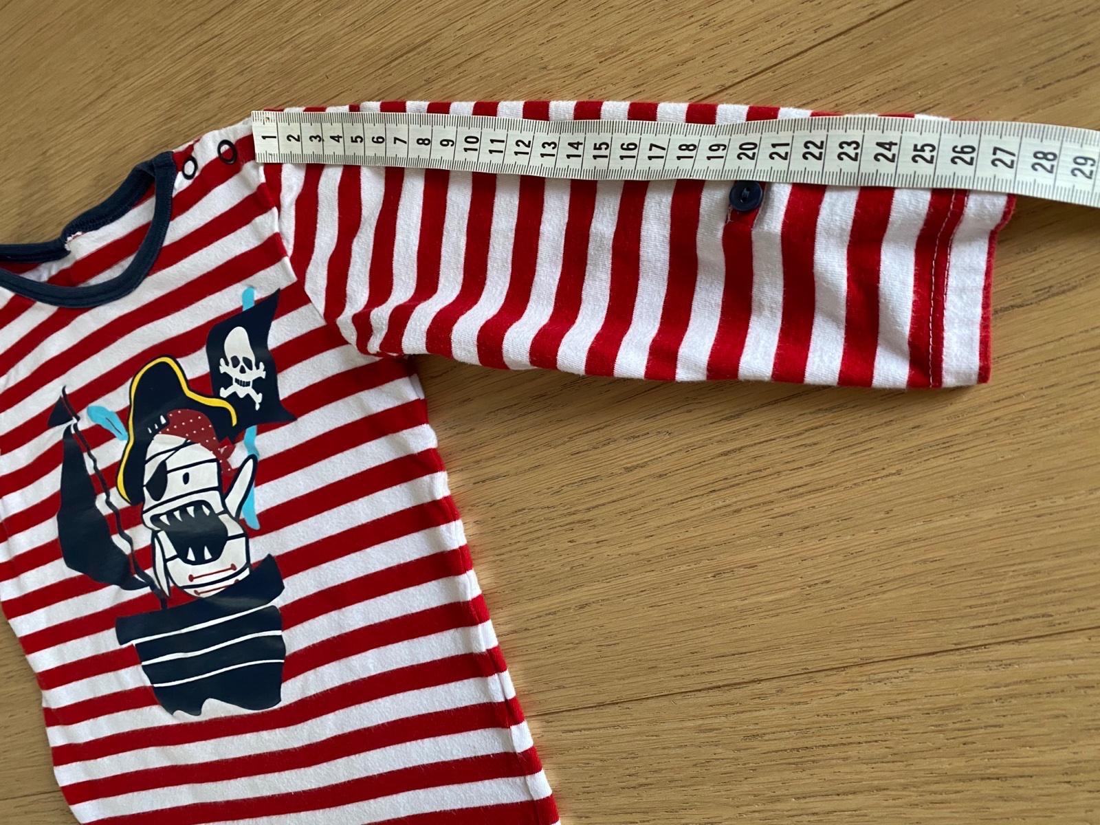 Krásne pirátske tričko s 3/4 rukávom, veľkosť 92, kuk rozmery. Rukáv sa dá vyhrnúť a zapnúť v lakti. V super stave, aplikácia neporušená, minimum nosené.