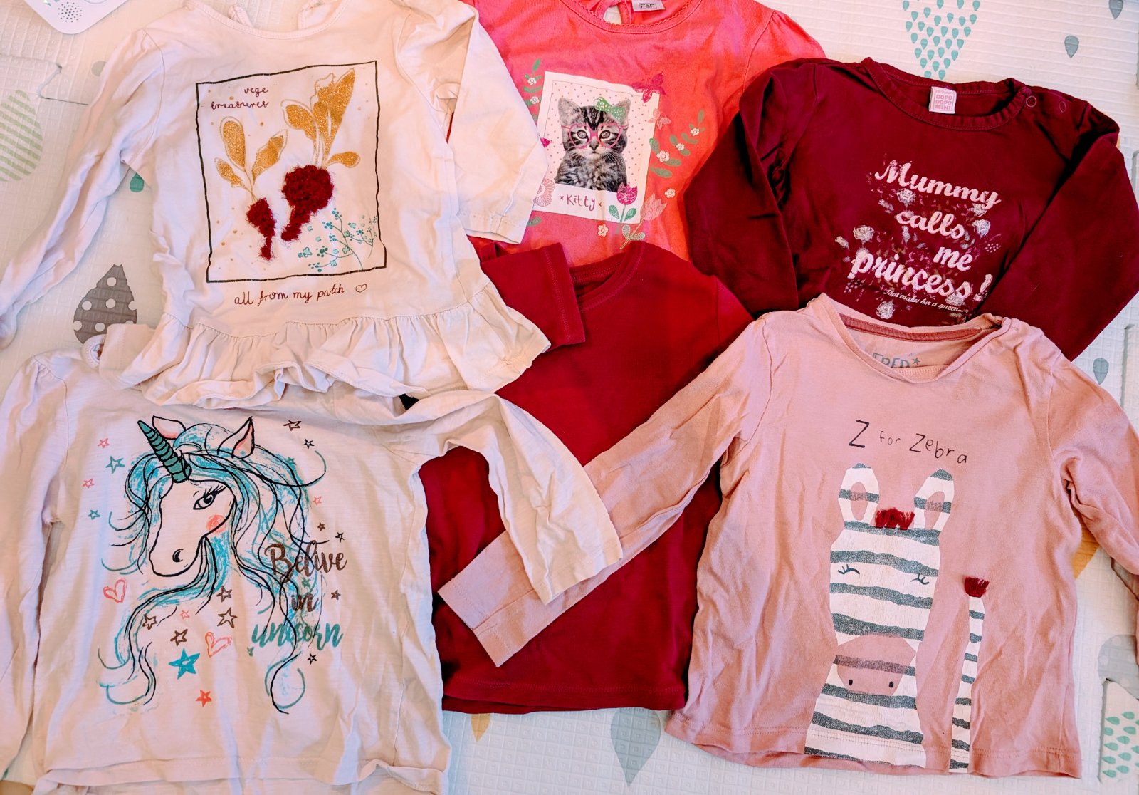 Set tričiek s dlhým rukávom a pančušiek. Krásny setik. Vrelo odporúčam. Veľkosti rôzne ale sedia na 86/92. Ponožky a pančušky so známkami nosenia..tie napravo viac naľavo menej nosené.